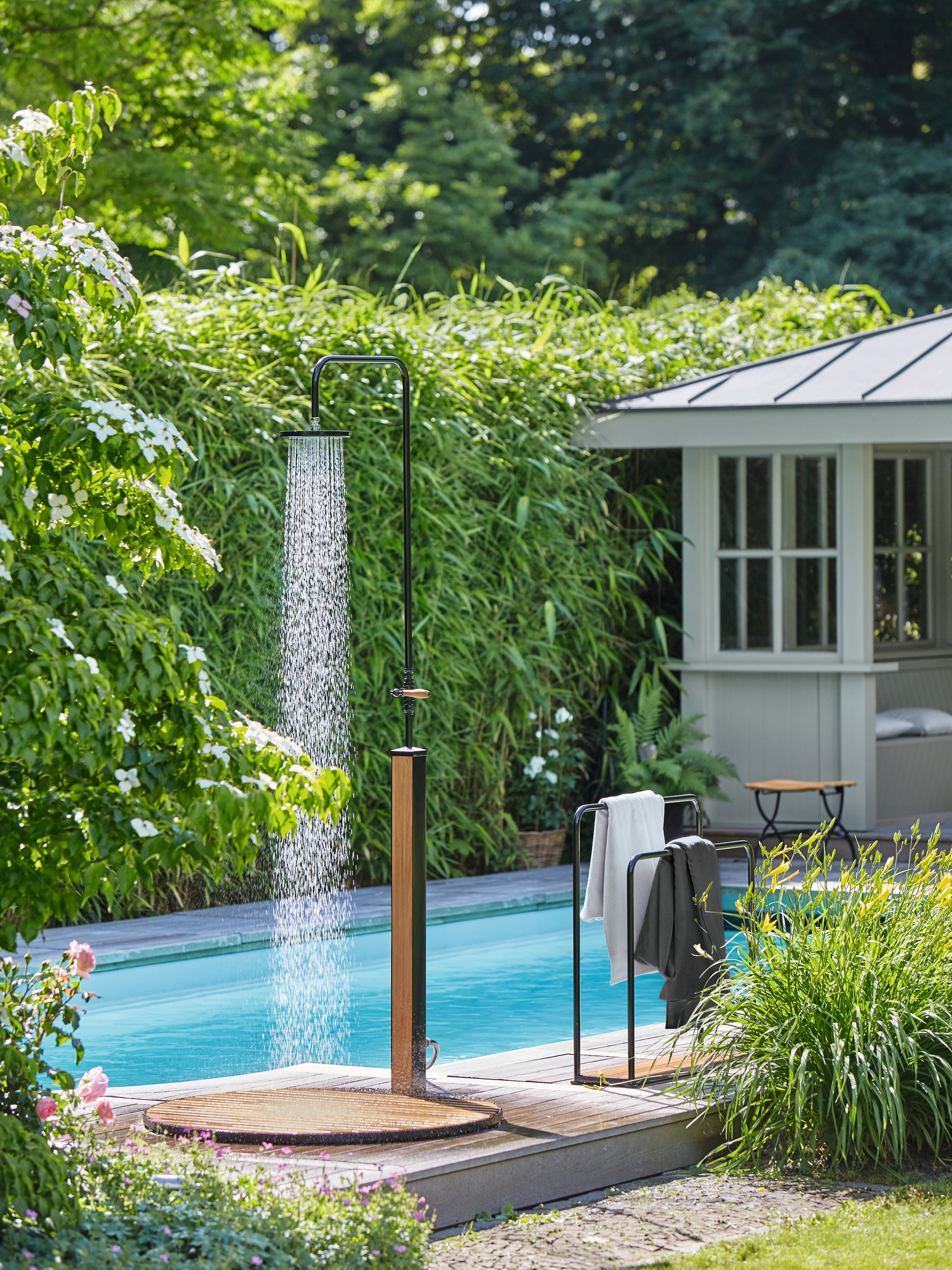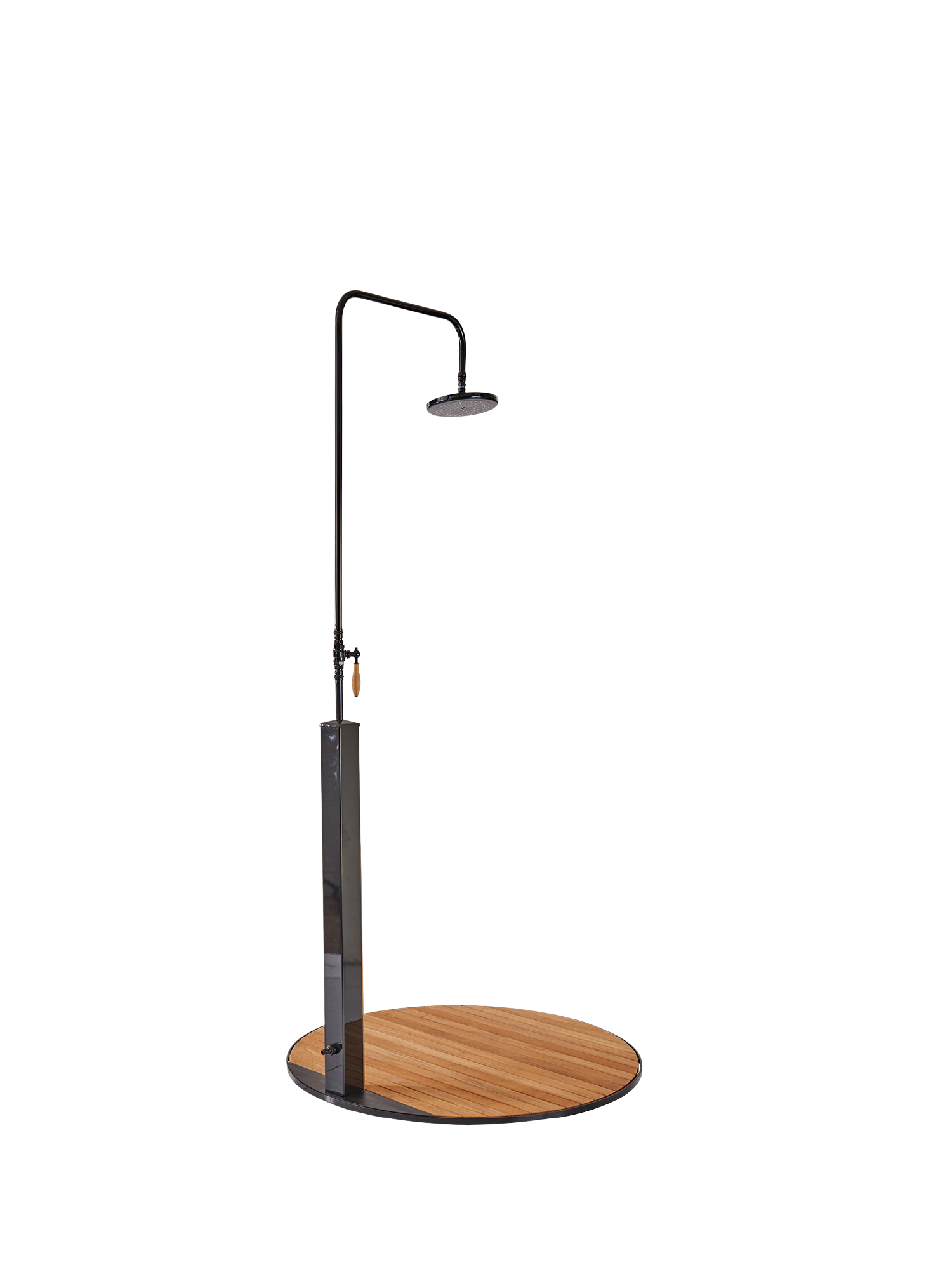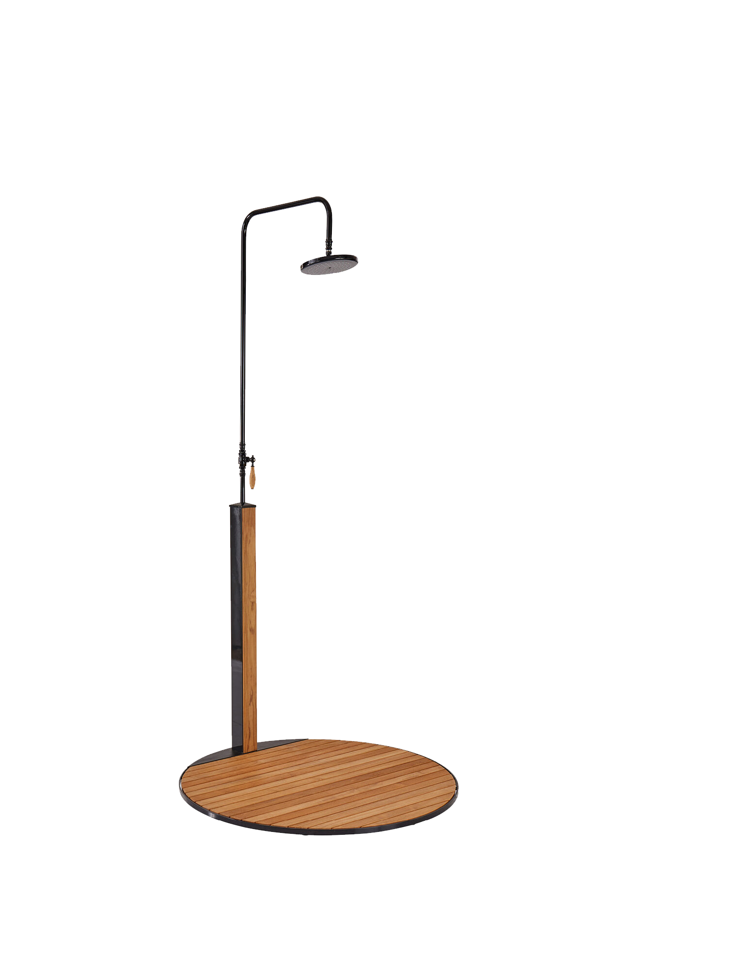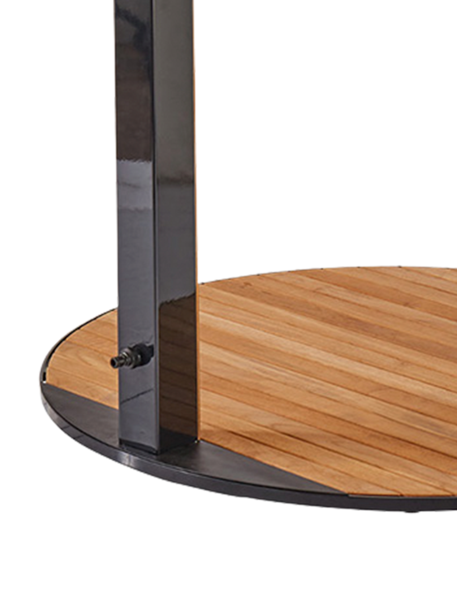 The elegant shower of the Fontenay series combines classic design with the newest technology. The circular base, made of teak and bound in an iron hoop, ensures secure footing. The shower upright is made of galvanised, powder-coated steel; the rain showerhead is easy to clean.