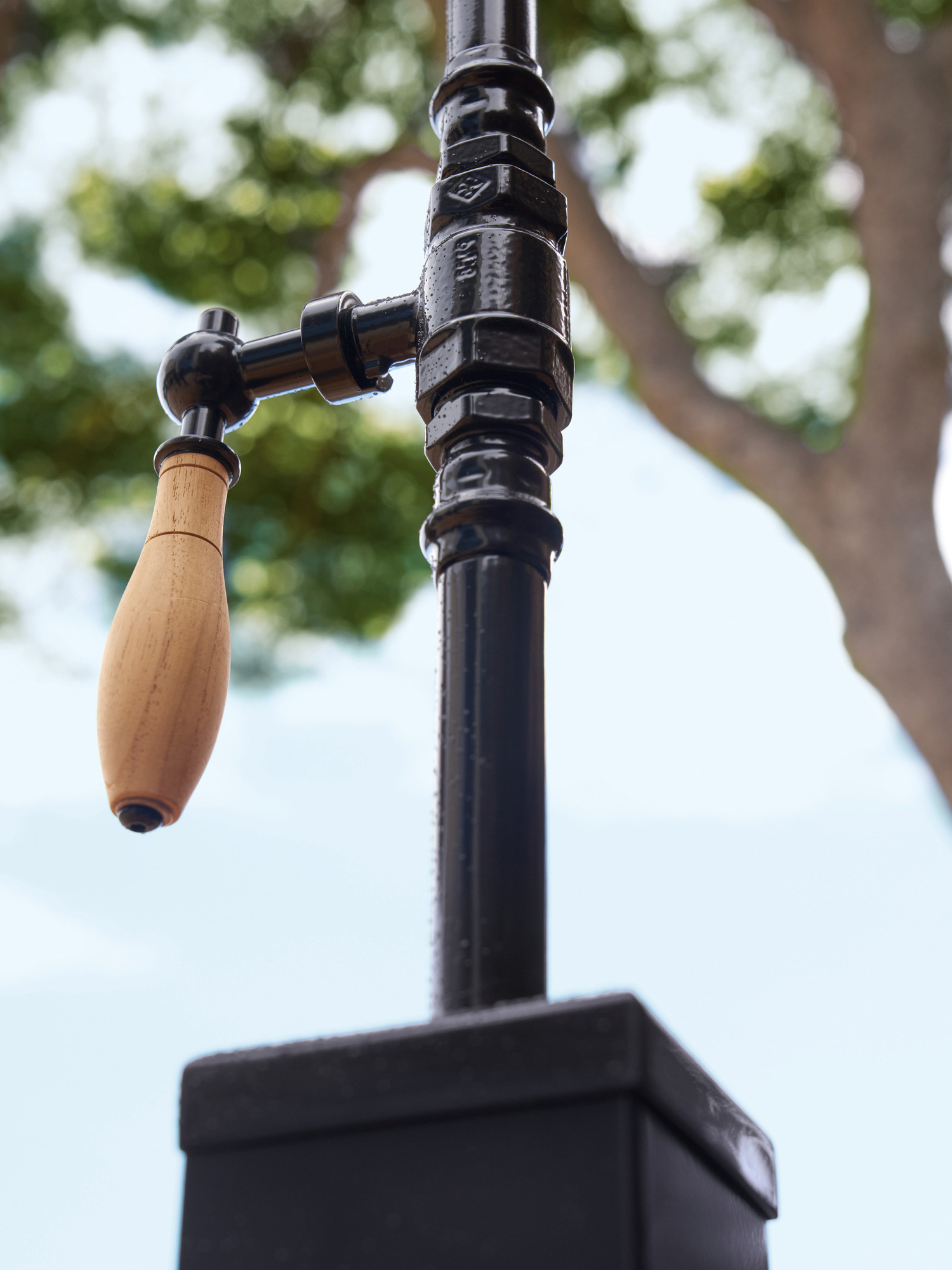 The Garden Shower conserves resources in that showers may also be taken cold -–without a gas or electricity connection – the used water then benefitting the garden instead of flowing into the sewage system. To avoid polluting the soil, we recommend showering with natural soap.