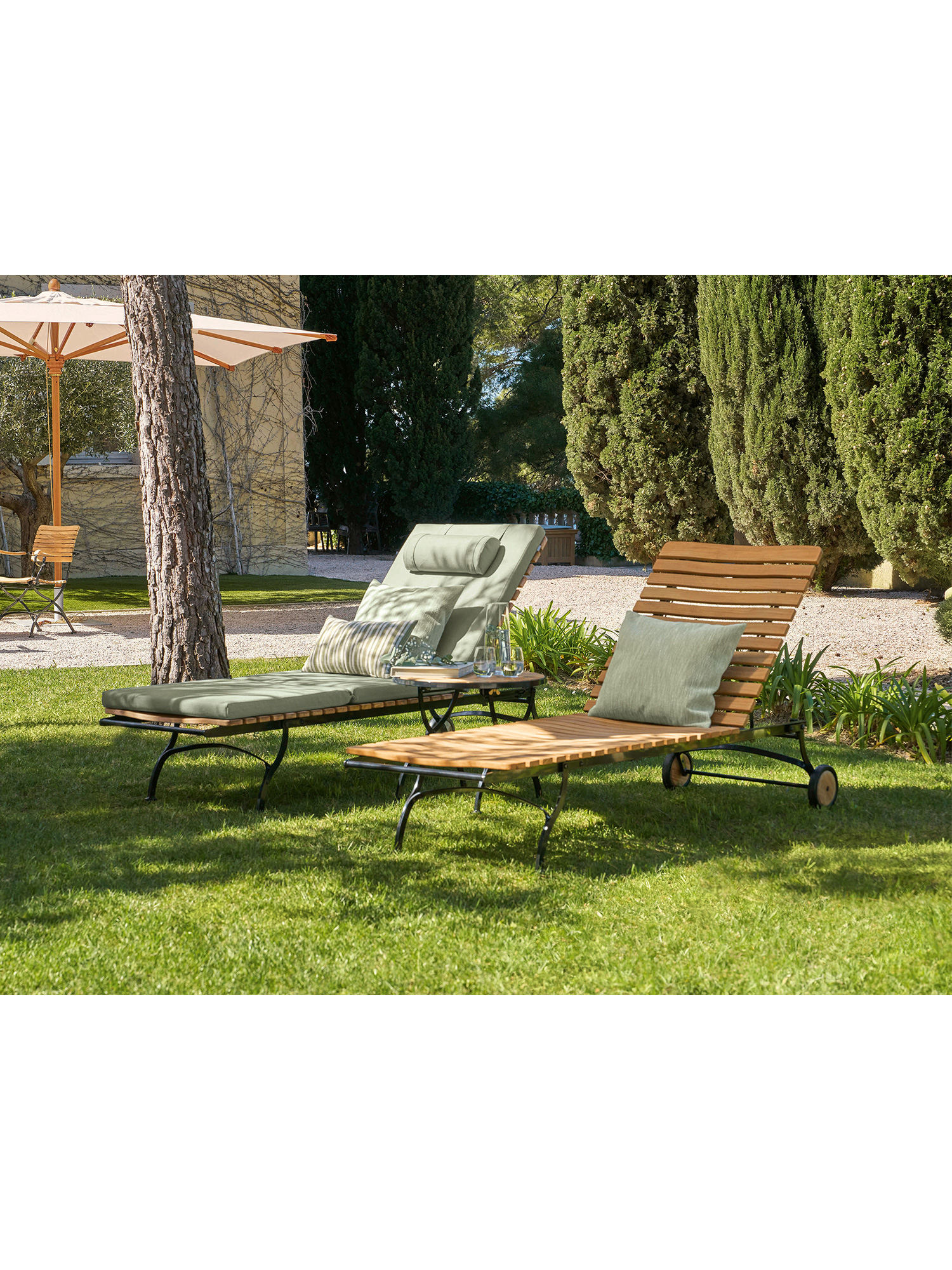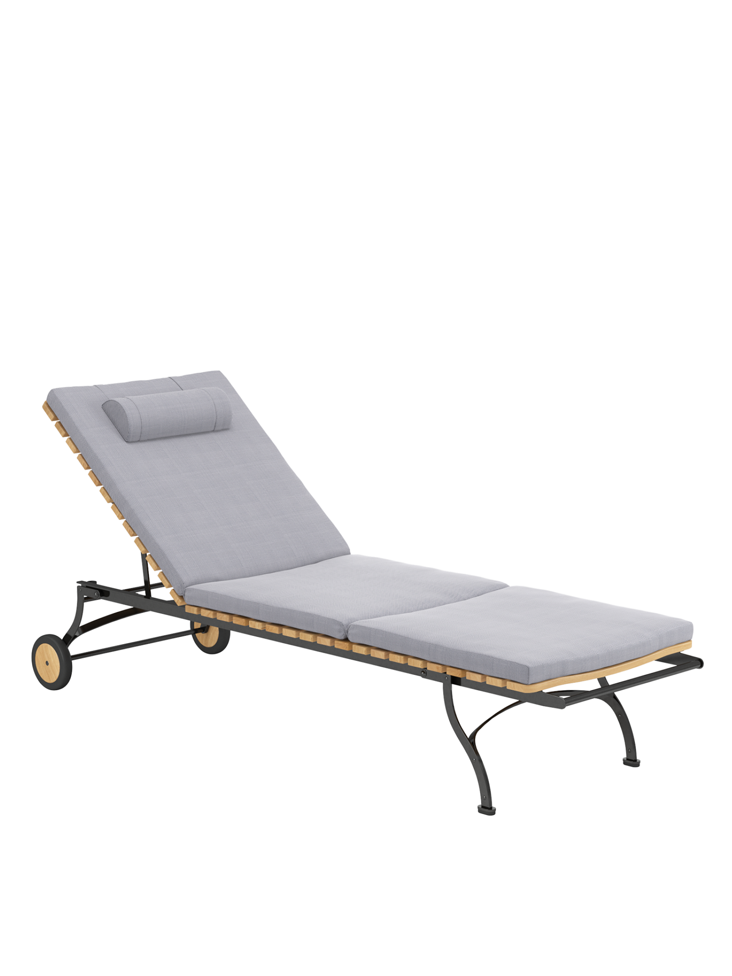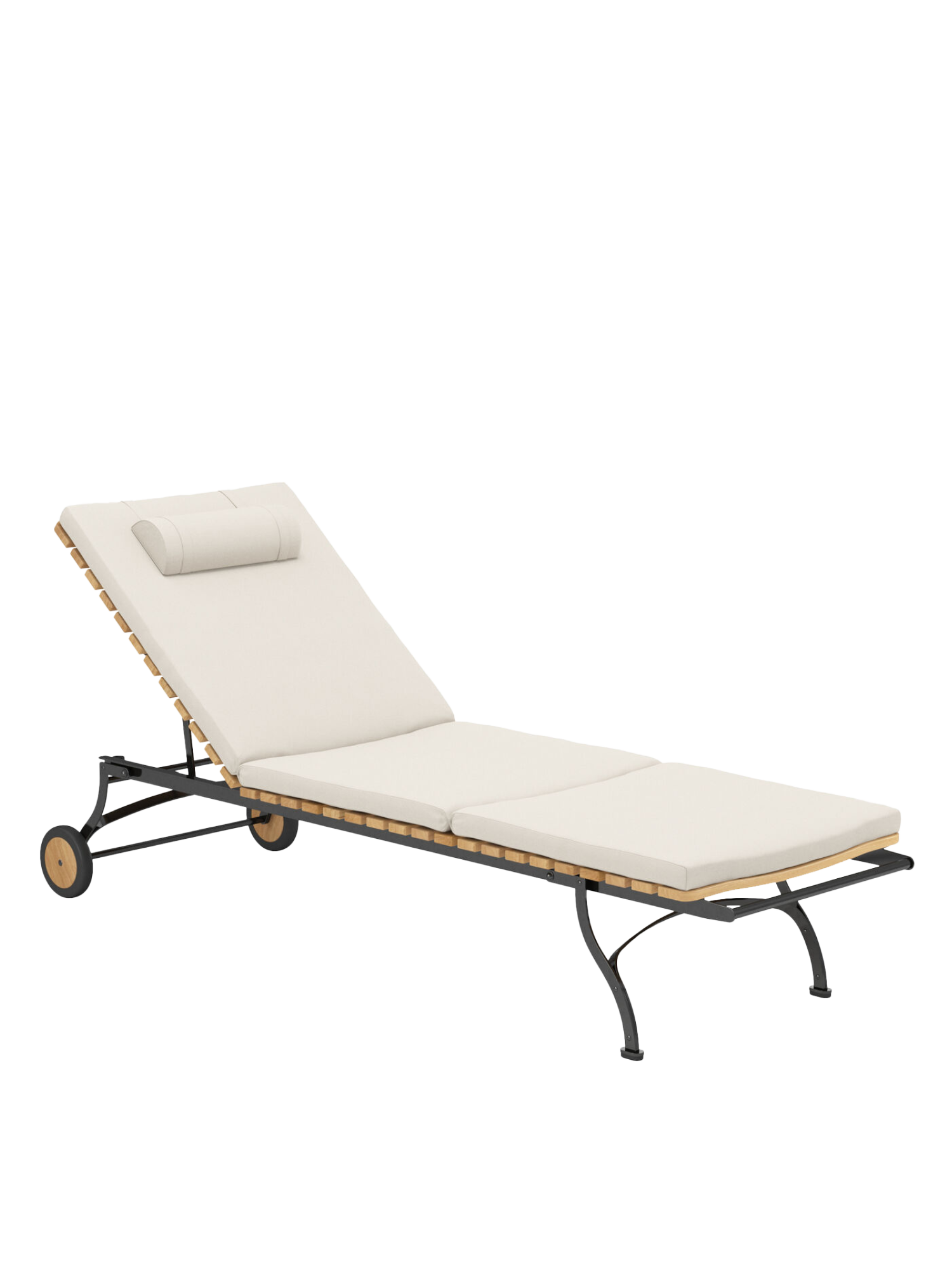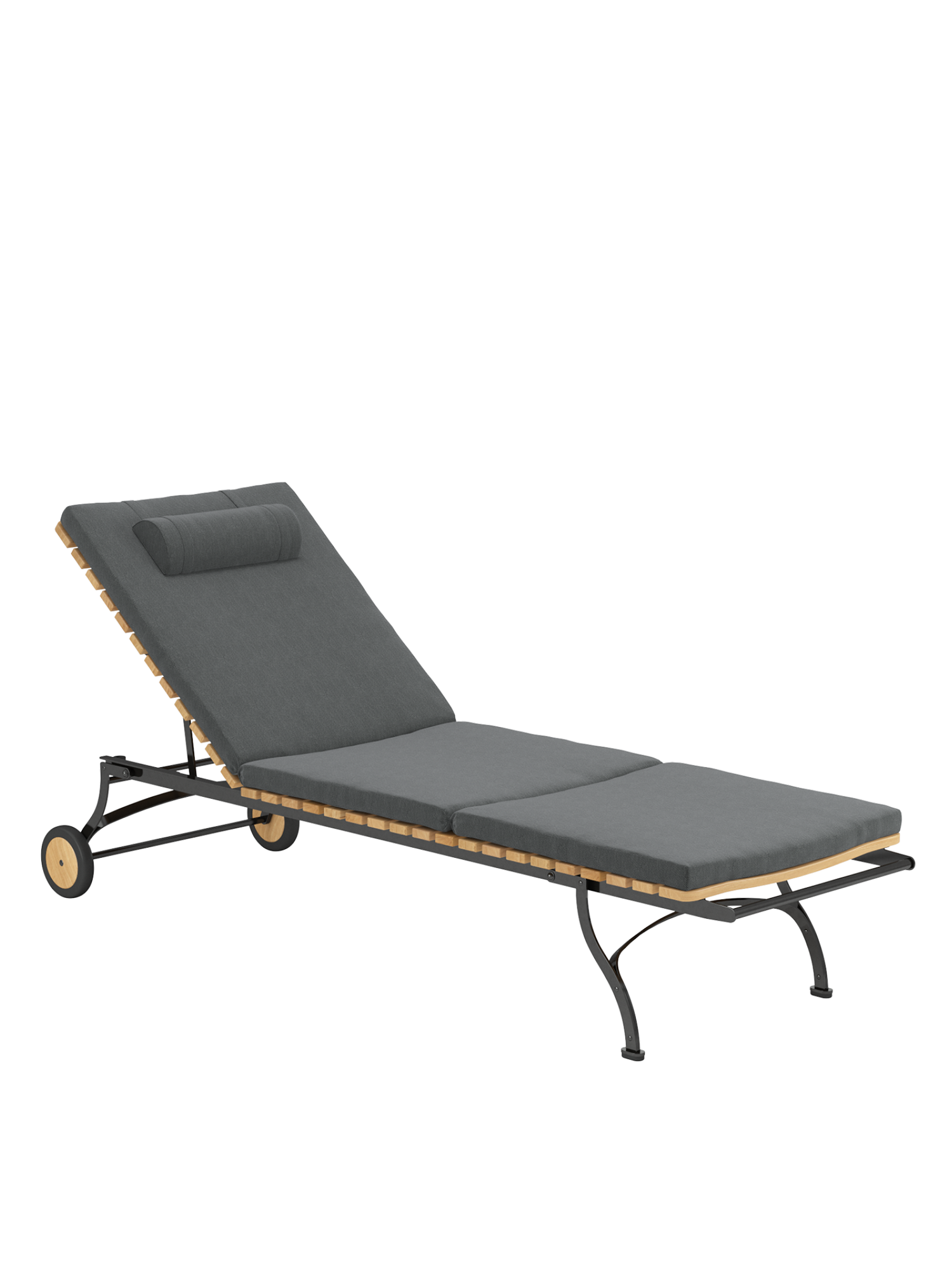 The frame is made of galvanised, rust-protected steel with a graphite black powder coating. Equipped with teak wheels, the lounger can be easily moved around the garden. Abrasion-resistant foot glides protect valuable floors from scratches.