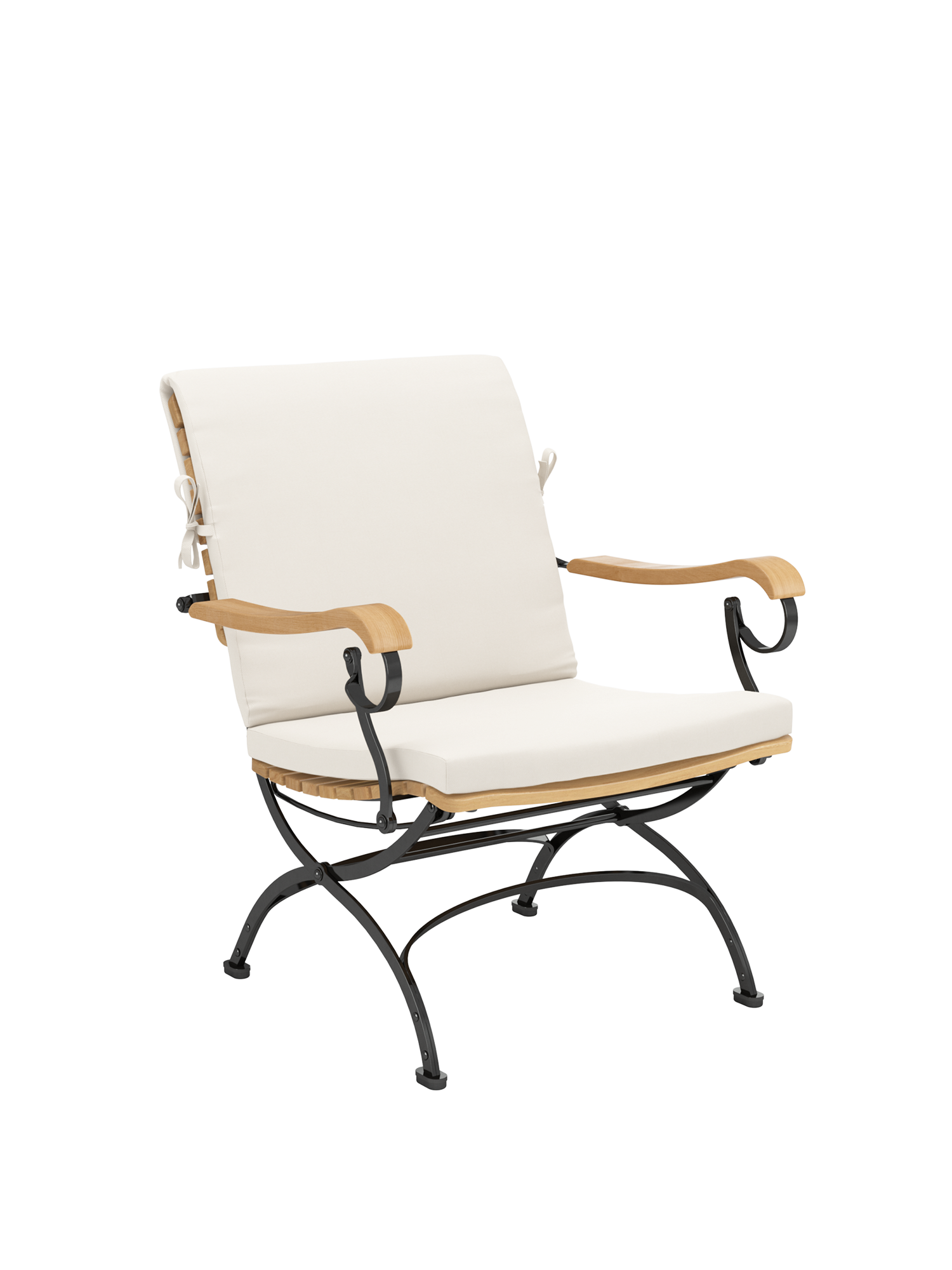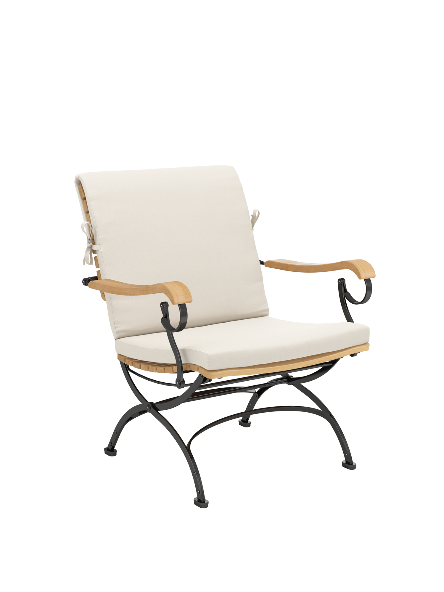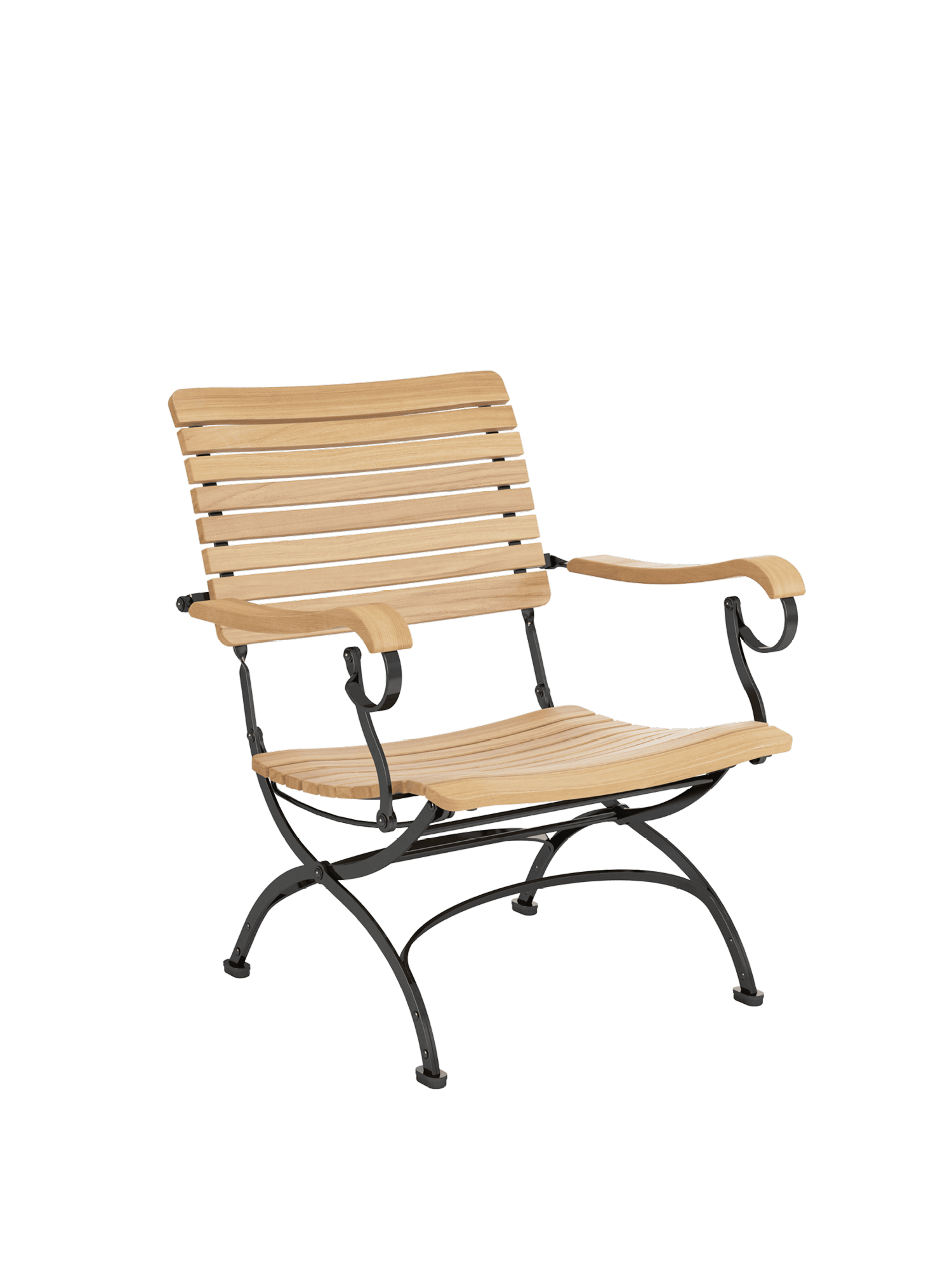 Providing distinctly more space between the armrests, the foldable classic with teak slats and powder-coated steel frame offers special lounge qualities. The armrests made of plantation teak, nestle into the hand and ease the body. The wide teak seat of the garden armchair is three dimensionally shaped to follow the contours of the body. It is rounded at the front so that it provides comfortable thigh support. Cushions in various colours increase the comfort of the furniture and set fine accents.