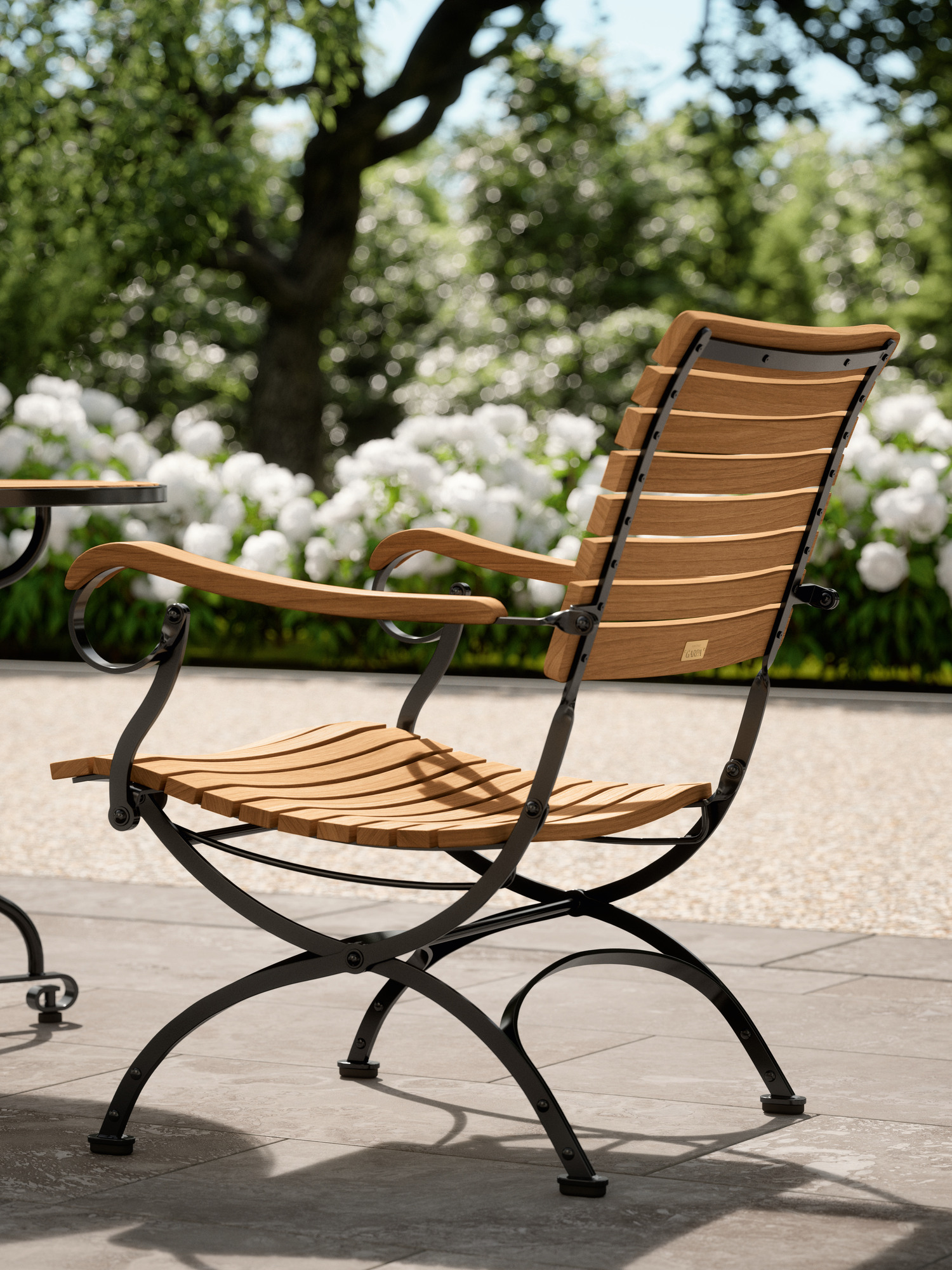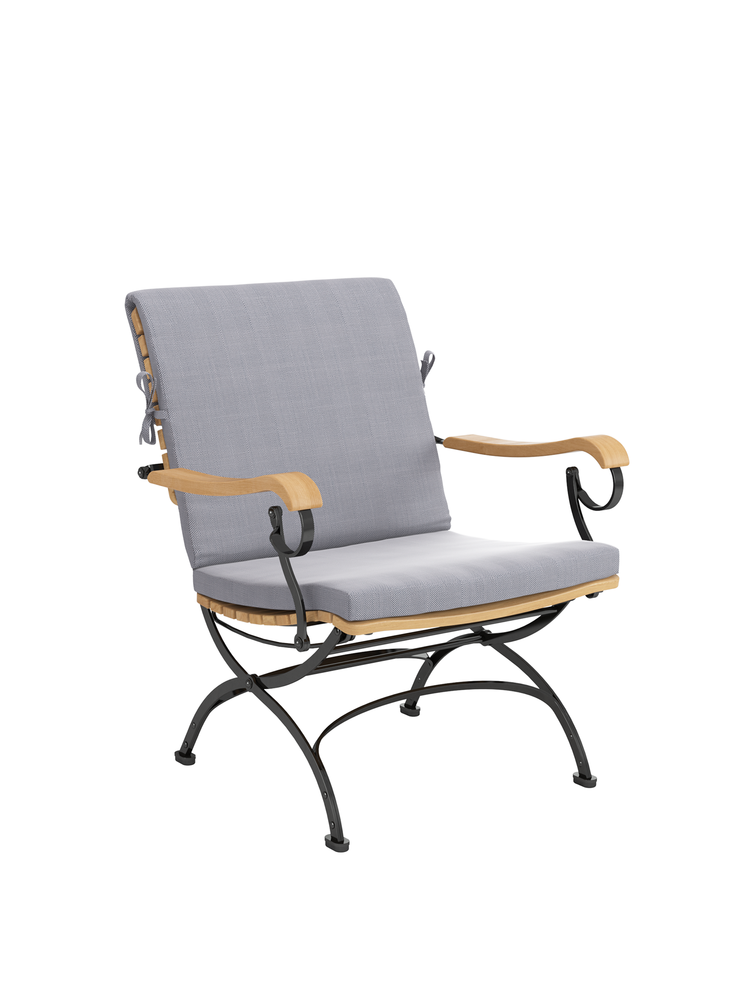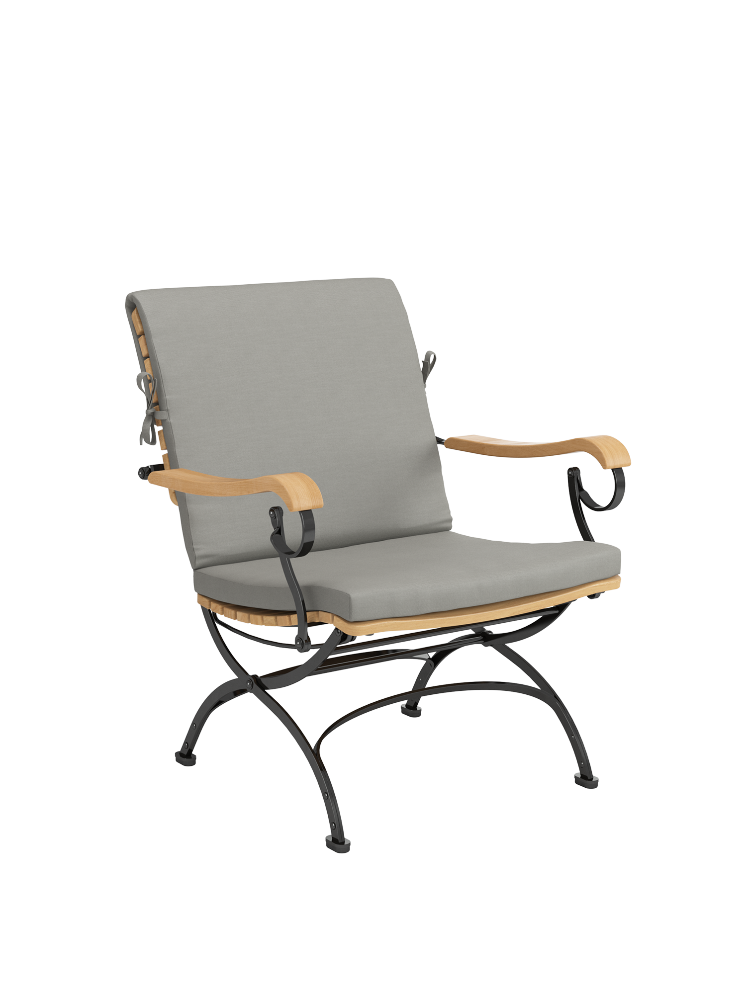 Providing distinctly more space between the armrests, the foldable classic with teak slats and powder-coated steel frame offers special lounge qualities. The armrests made of plantation teak, nestle into the hand and ease the body. The wide teak seat of the garden armchair is three dimensionally shaped to follow the contours of the body. It is rounded at the front so that it provides comfortable thigh support. Cushions in various colours increase the comfort of the furniture and set fine accents.