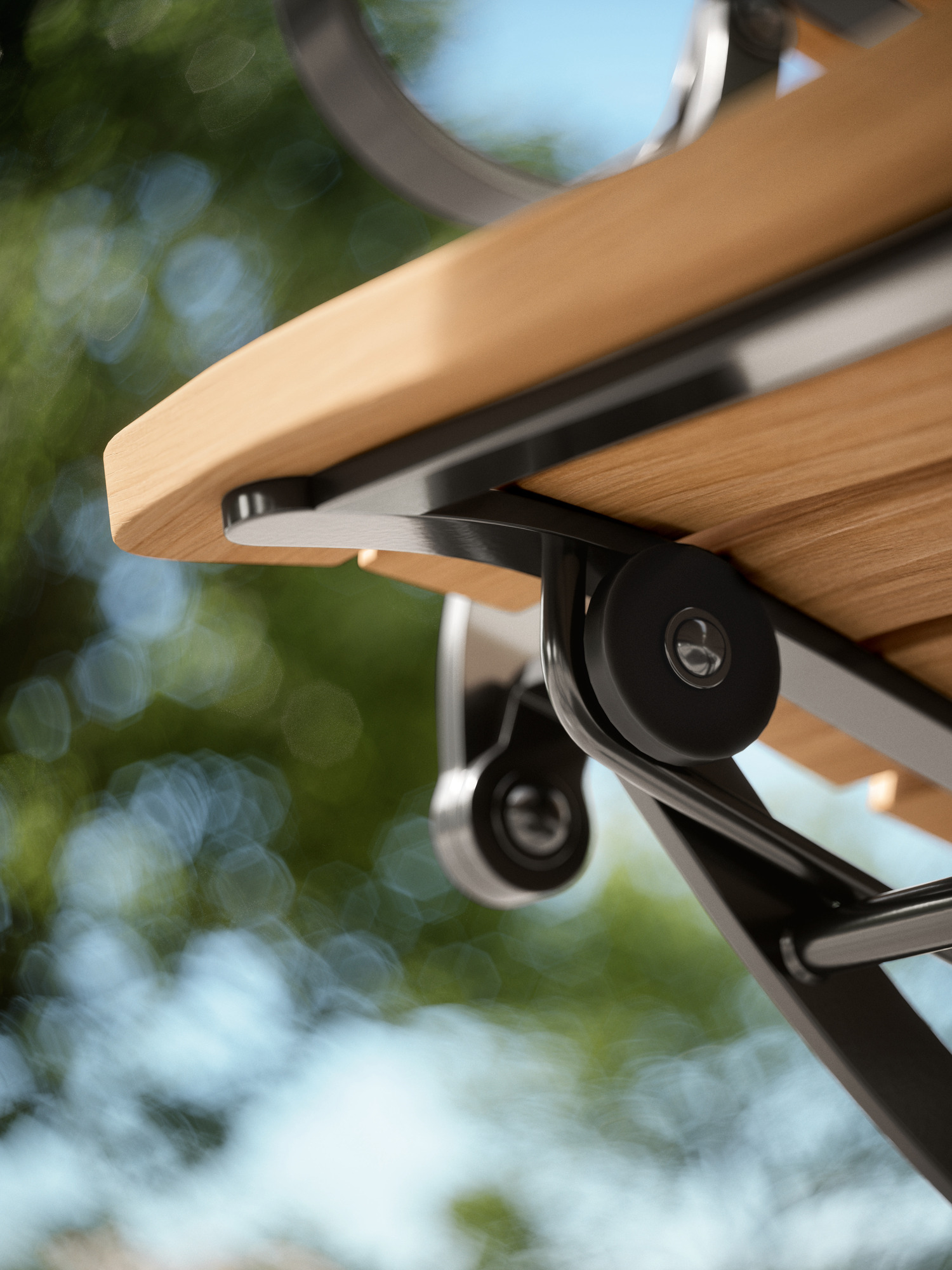 All rotating connections are constructed of stainless steel bolts in a rustproof housing – for a long life outdoors. High-quality polyamide runners under the seat ensure smooth folding and protect the powder-coated metal sections. The frame is made of galvanised steel and is therefore rust protected. It is powder-coated in a graphite-black colour. Folded up, the armchair has a narrow profile of 23 cm. Foot gliders made of a hard-wearing, abrasion-proof synthetic material protect sensitive floors.