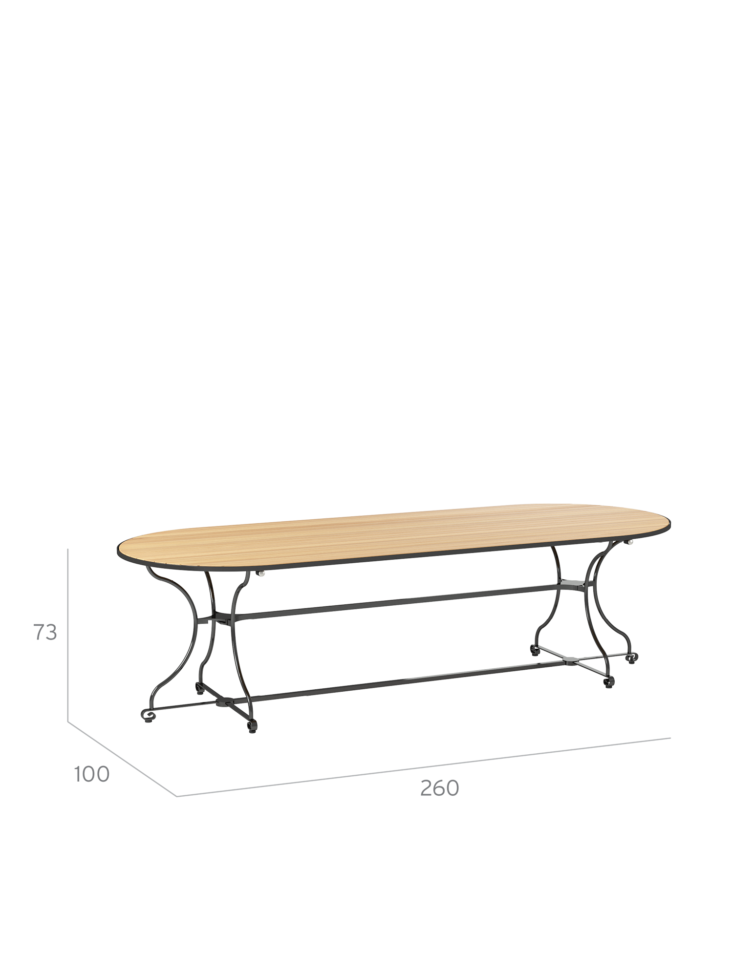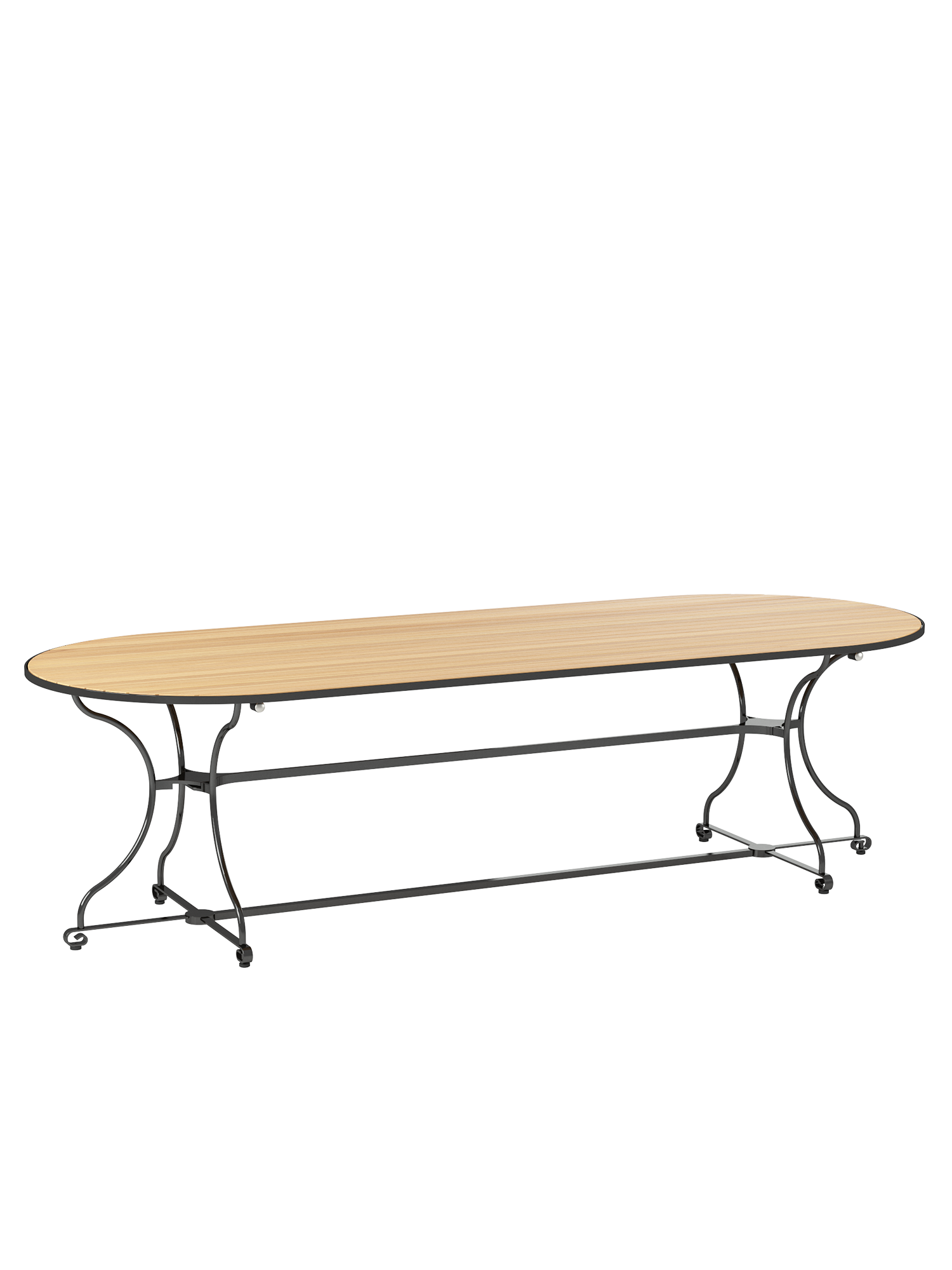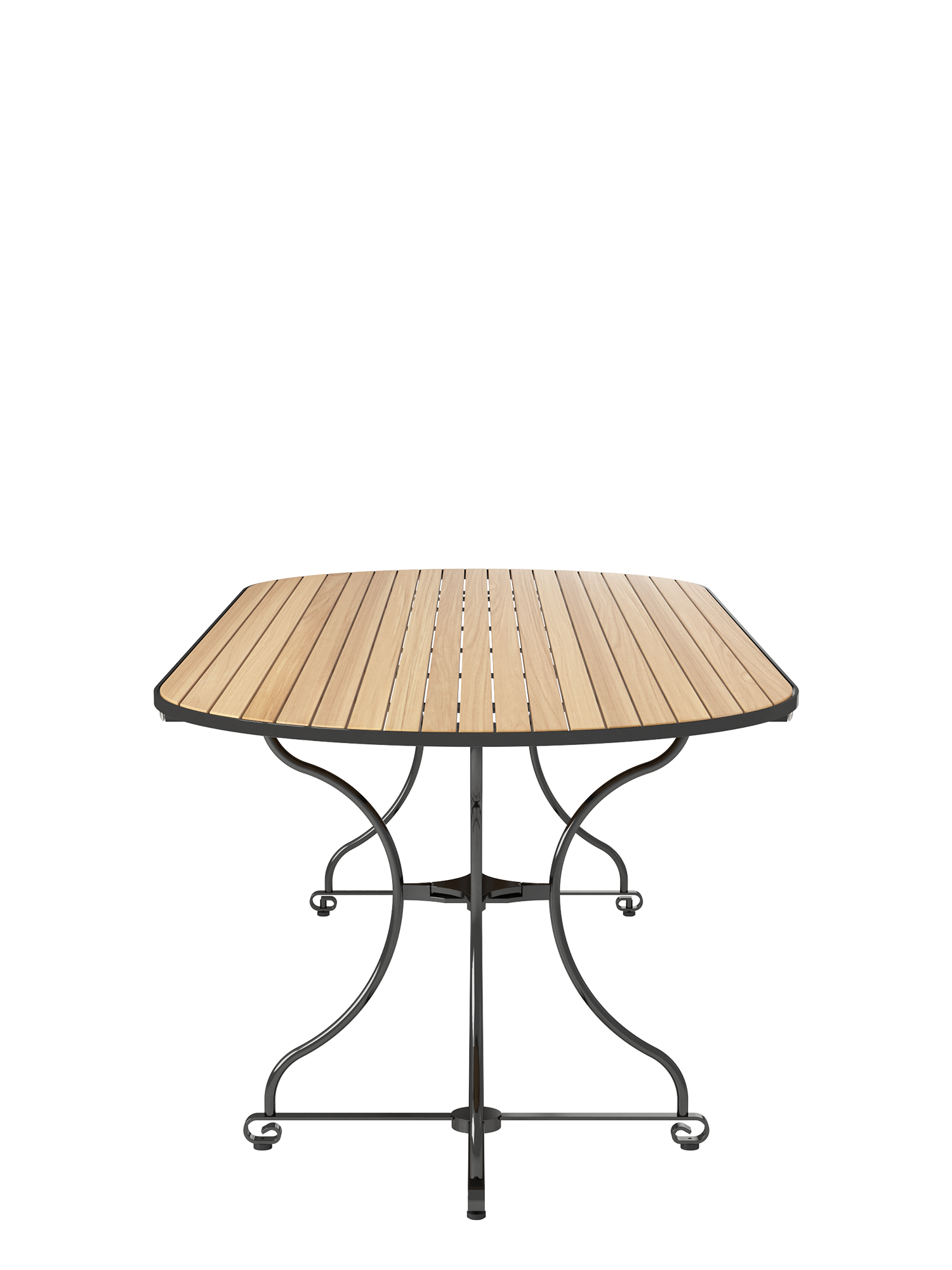 Solid teak slats stretch seamlessly across the entire length of the oval tabletop, resting atop the frame of this generously sized table. Its exceptional width provides plenty of freedom of movement for large gatherings.