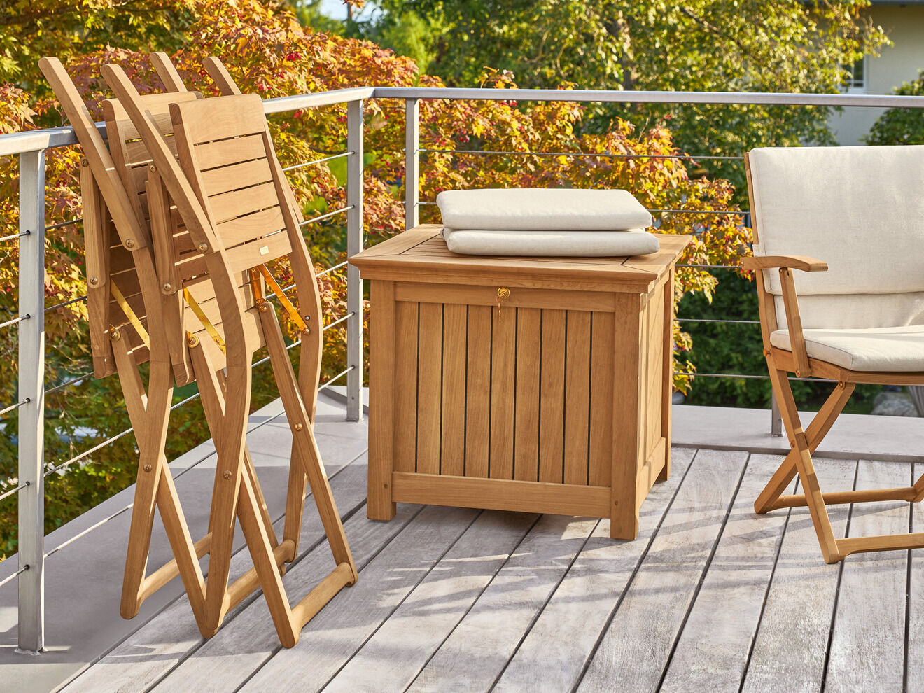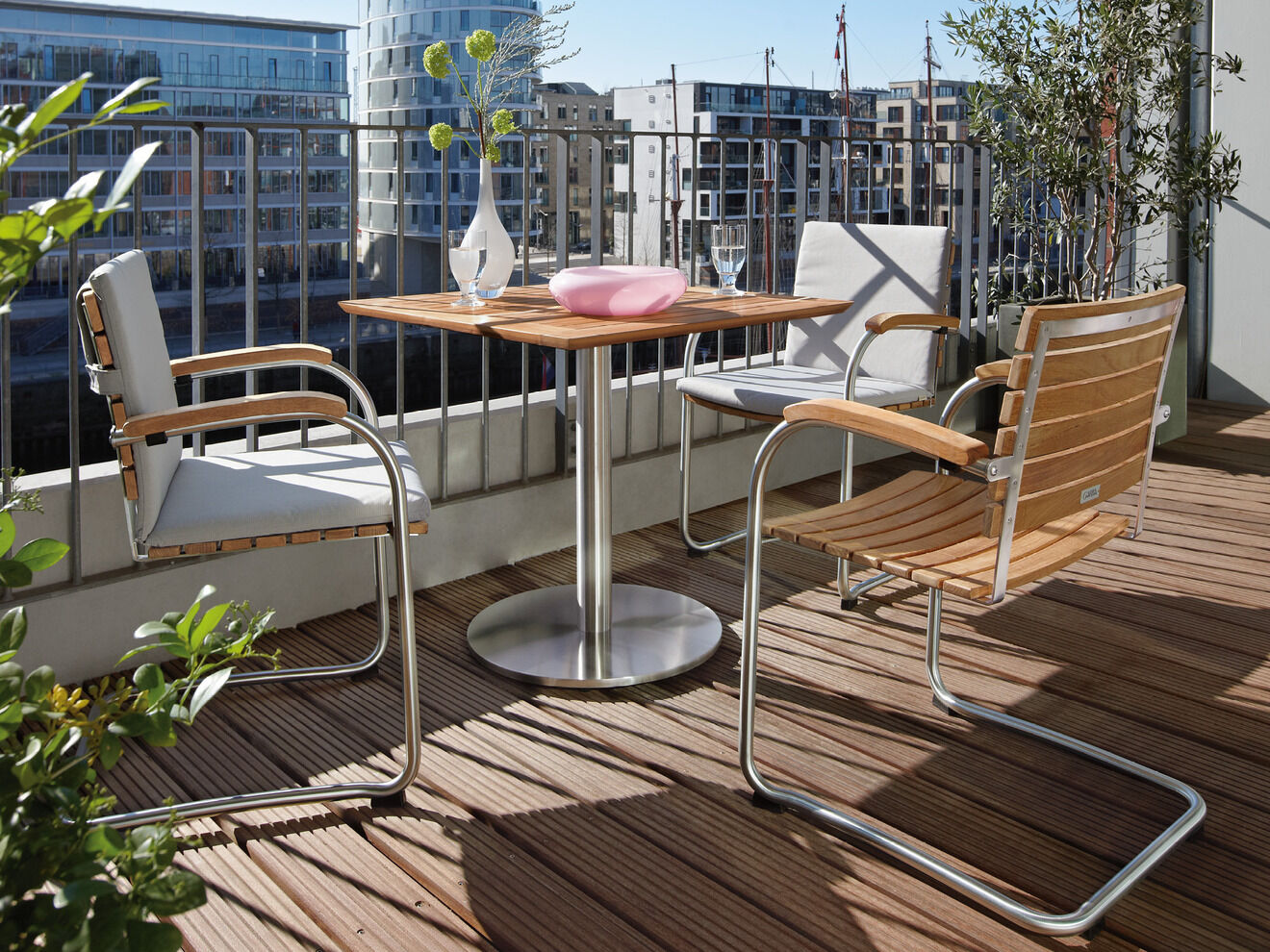 Ausgesuchte Stühle und Hochlehner lassen sich klappen oder stapeln und formieren sich auf dem Balkon zur flexiblen Sitzgruppe. Luftige Schaukelstühle versetzen schwungvoll in tiefe Entspannung.