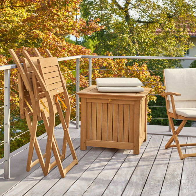 Accessoires, Geschirr und Getränke – was auf dem Balkon nicht fehlen darf, findet in hochwertigen Regalen Platz. Entdecken Sie auch unsere Kissentruhen, um Ihre Auflagen vor Wind und Wetter zu schützen.