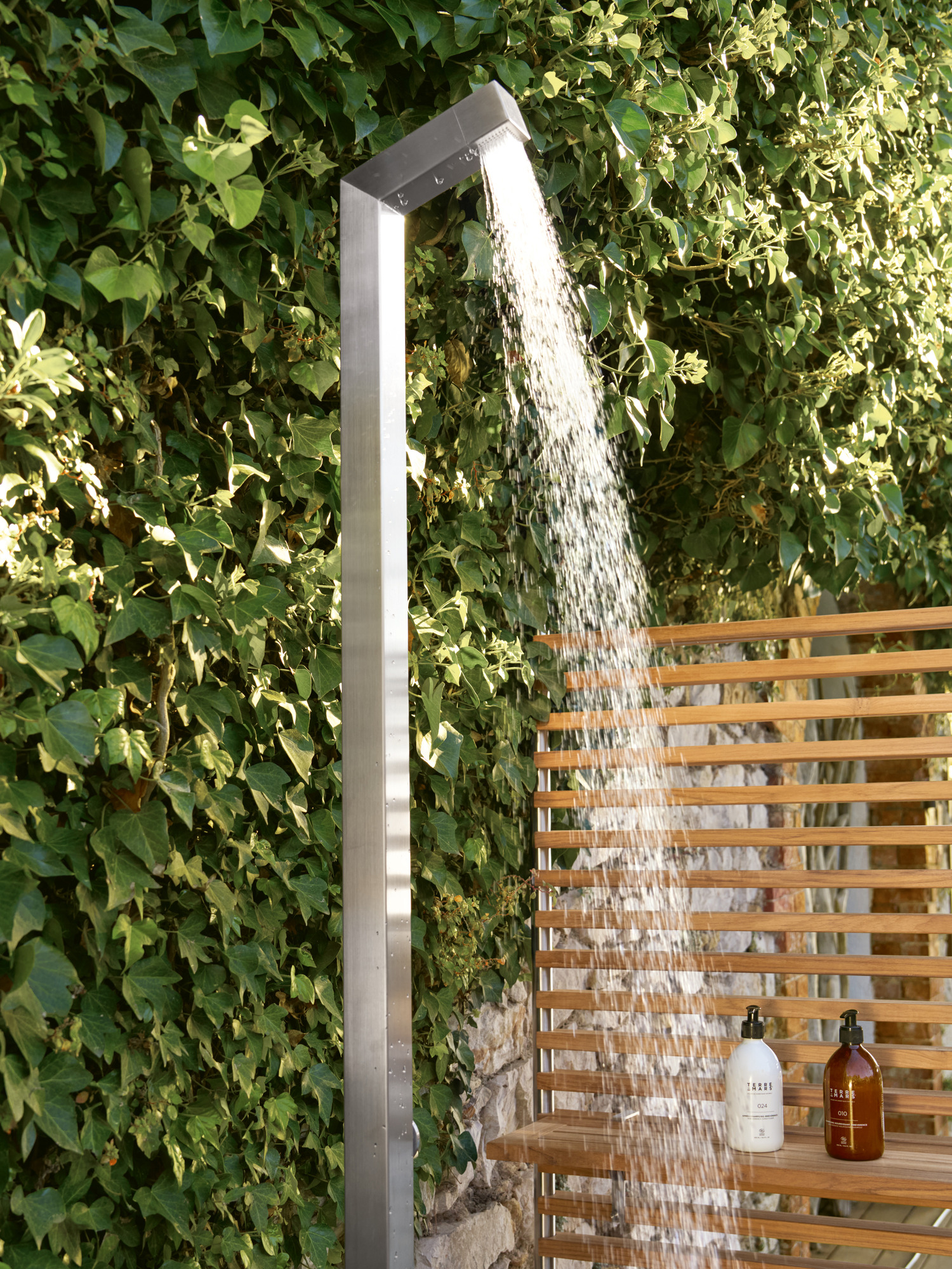 The Garden Shower conserves resources in that showers may also be taken cold – without a gas or electricity connection – the used water then benefitting the garden instead of flowing into the sewage system. To avoid polluting the soil, we recommend showering with natural soap.