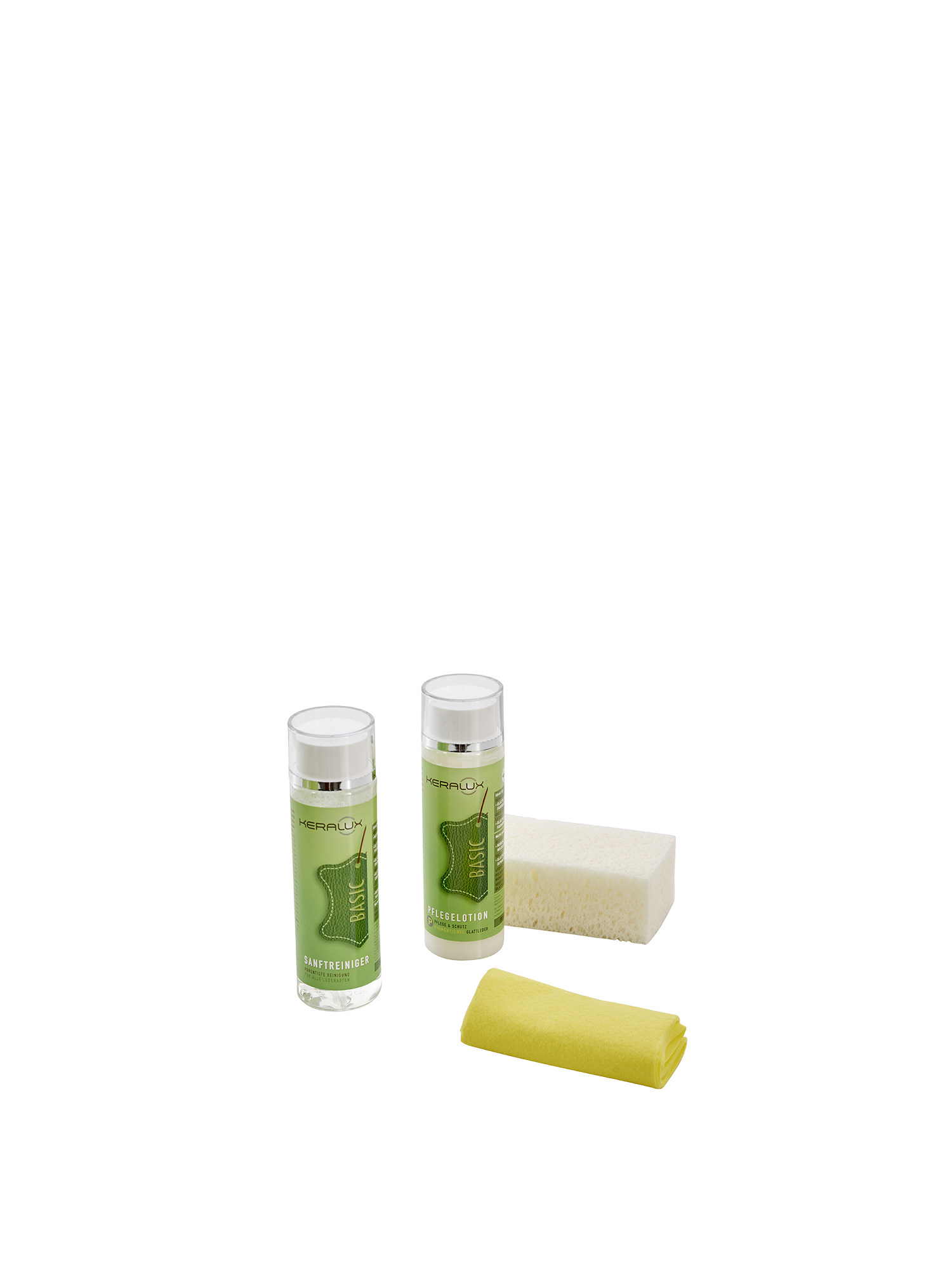 - 200 ml gentle cleaner, 200 ml care lotion, sponge, cloth