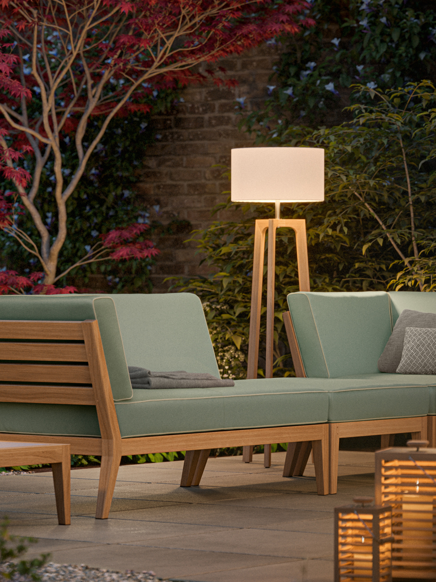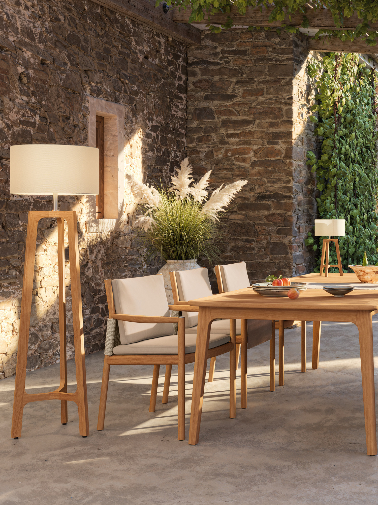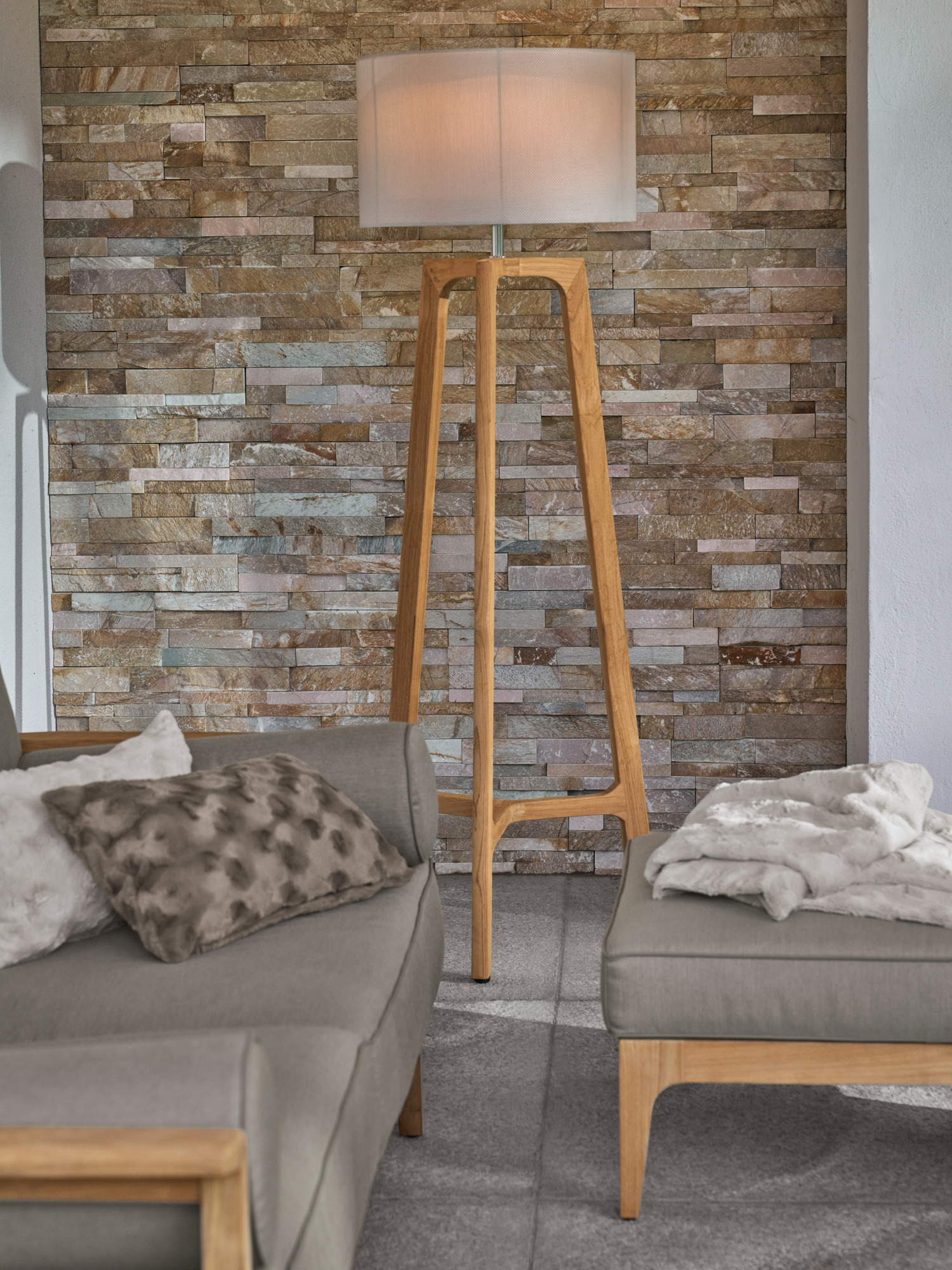 When night descends on the terrace, the three-legged dimmable lamp made of teak, casts a soft glow. Its solar panel is unobtrusively concealed so that nothing detracts from the slender form. The shade, made of acrylic material, is weatherproof and easy to clean. As required, the solar element with integrated light source and battery, can be charged by connecting to the mains socket. We offer various type of accessories for additional stabilisation of the Gleam floor lamp when set up in those spots which are particularly exposed to wind. You will these under "Accessories" further down this page.