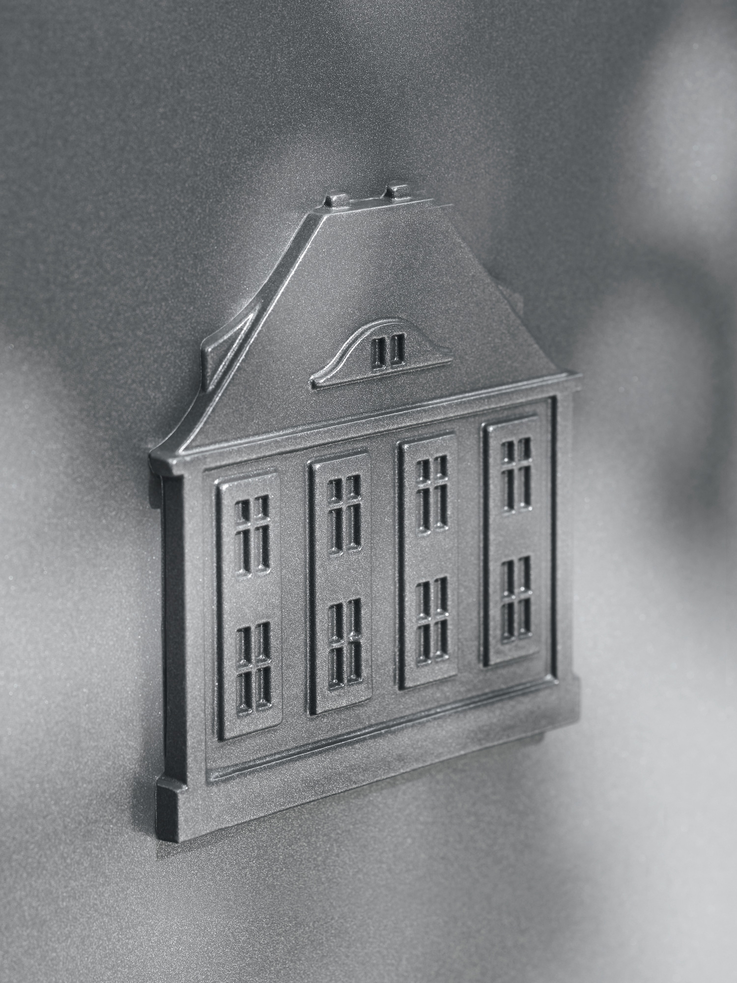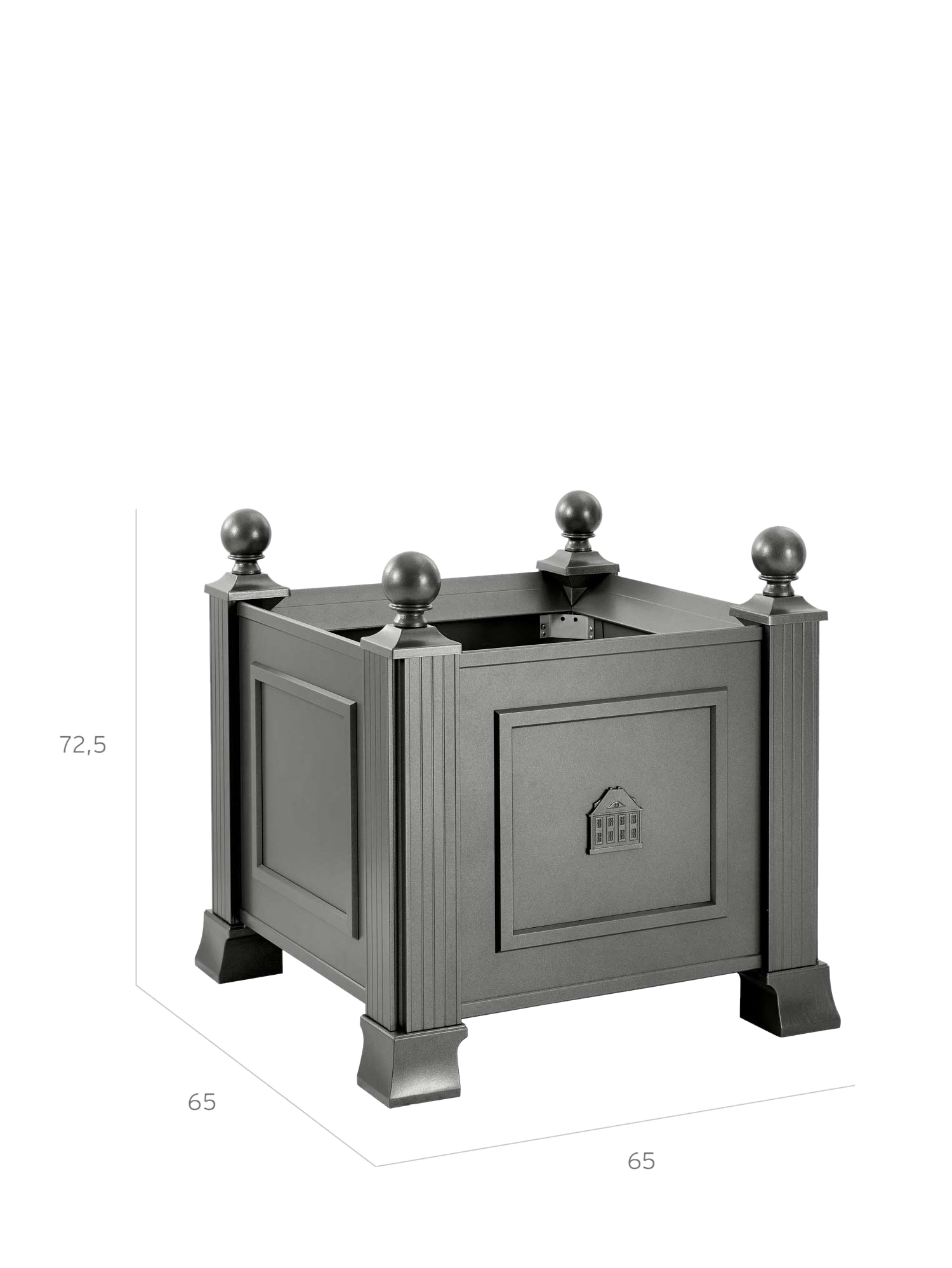 Crowned with spheres and carried on robust feet, the corner elements are testimony to stability. The grey powder-coated aluminium of the planter contributes to its elegant appearance. A delicate high relief on the front shows the Garpa headquarters.