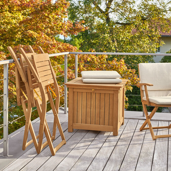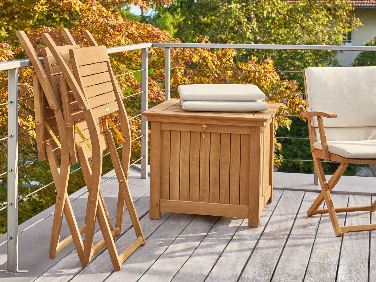 Stack cushions and pillows only up to the lower edge of the ventilation slots, so as to allow for adequate air circulation. Please also ensure that the cushion chests are perfectly level so that no water is able to seep in. To protect against possible storm damage, we recommend locking the chests.