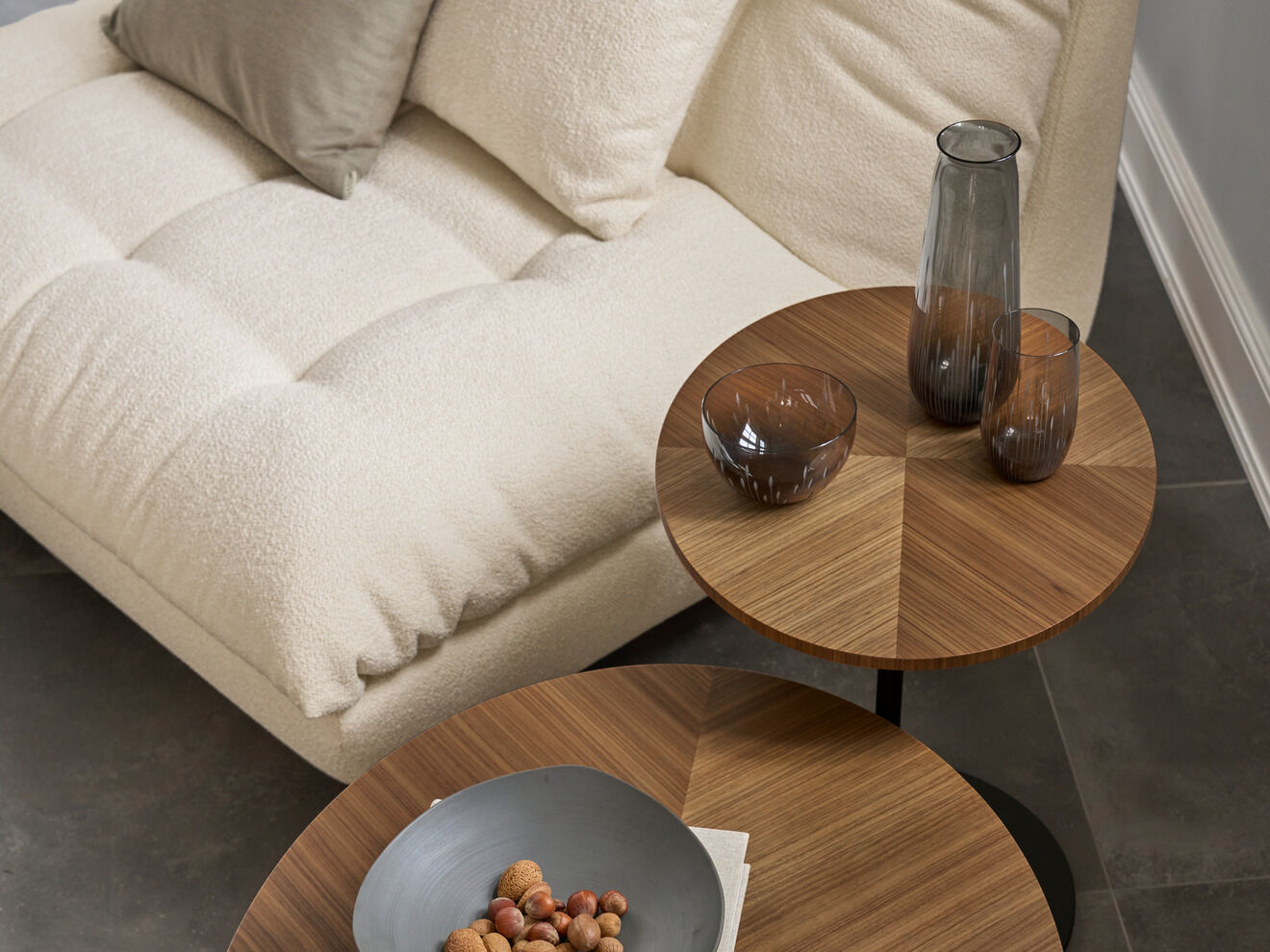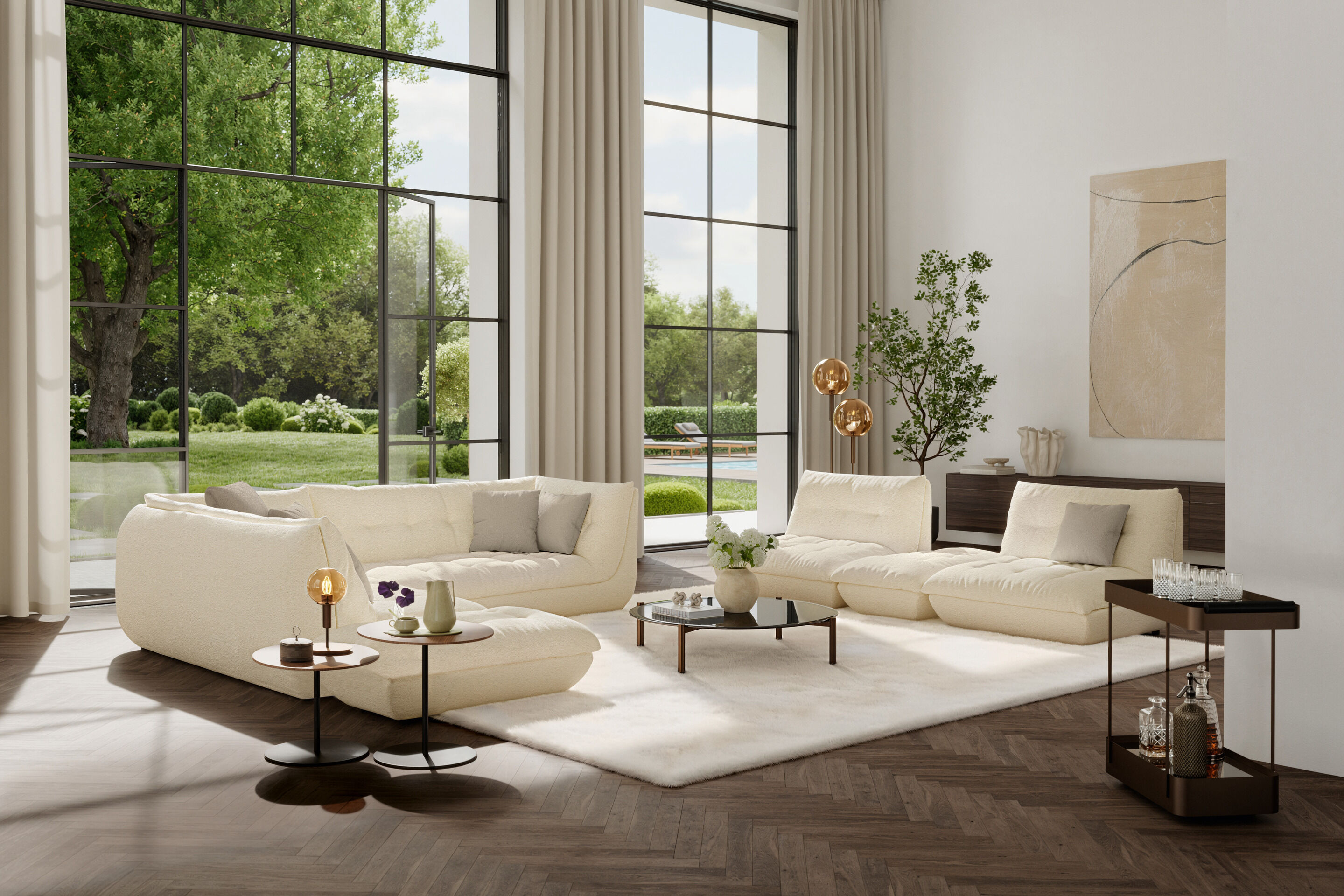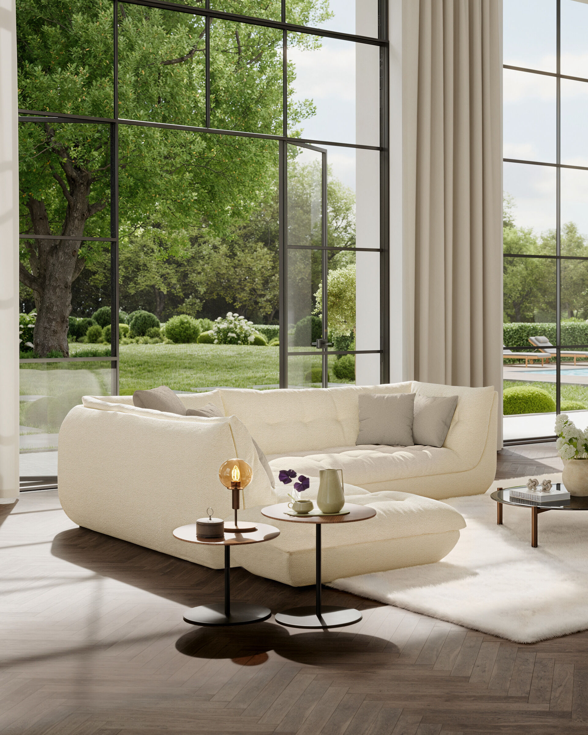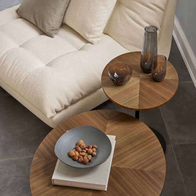 The modern design with balanced proportions and organic structures lends the lounge a casually sculptural character. Side tables with oval or round tops made of wood or glass complete each ensemble.