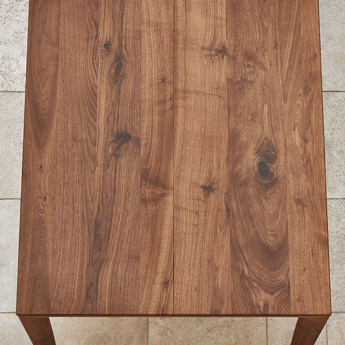 The rectangular, extendable Tavo table offers plenty of legroom. The elaborate workmanship of American walnut bears witness to admirable craftsmanship: a continuous shadow gap gives the design a delicate, almost floating appearance, while the legs are hand-rounded on the inside. With its striking grain and characteristic knots, the pleasantly tactile, oiled solid wood makes each piece a unique creation.