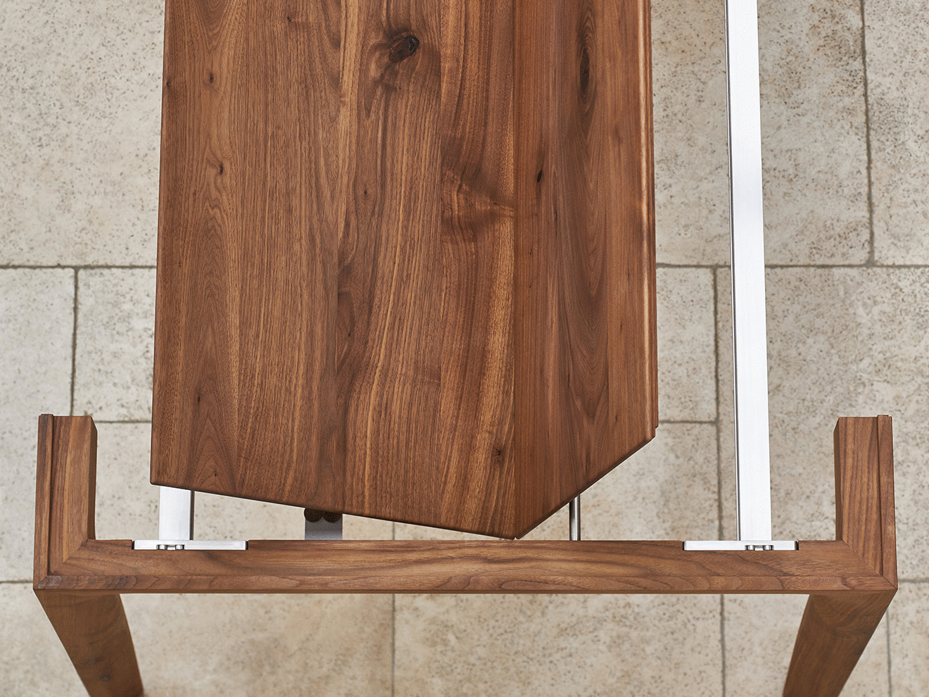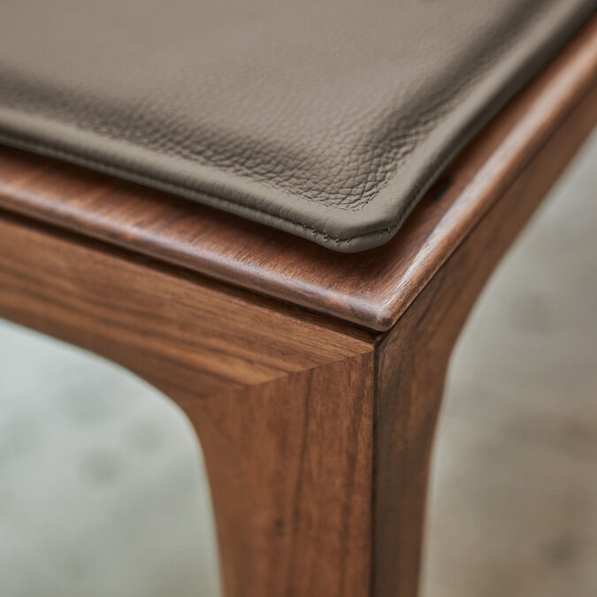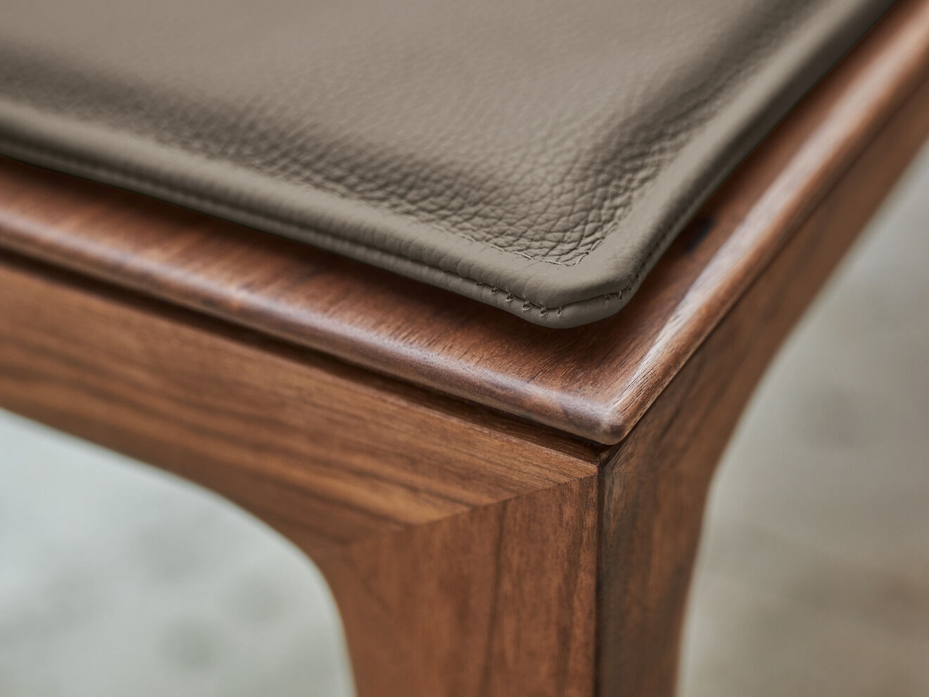 The impressive length of the Tavo dining table at 180 centimetres can, if required, be effortlessly extended by another metre. The natural grain of the American walnut – a composition of nature unique to each table – varies in the extension; however, a continuous, uniform grain is available as a custom-made option. All edges of the solid piece are hand-sanded. The recesses for the butterfly mechanism are pleasantly lined with leather. Rails and ball bearings are sturdily crafted from aluminium and stainless steel.