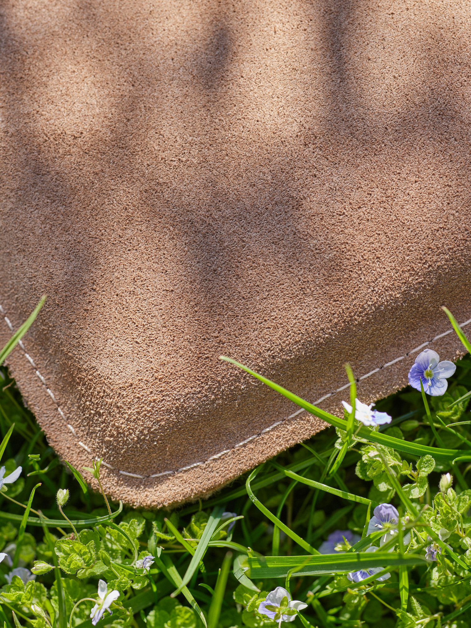 The cushion is designed to make arduous gardening work easier. It protects the knees and is also practical in that it can be easily carried about by its suede leather handle – for instance to the next open-air concert, where it serves as a comfortable seat cushion.
