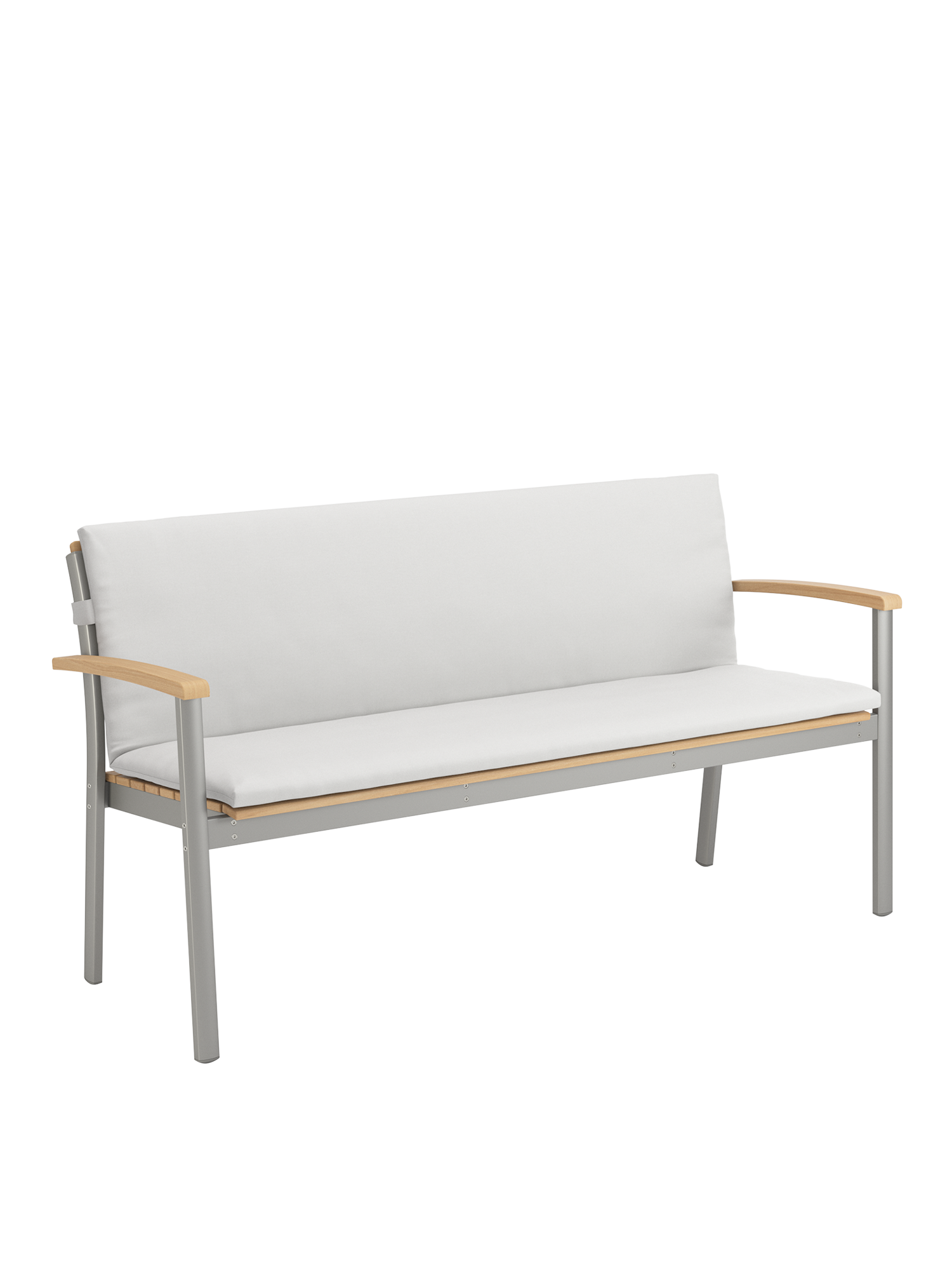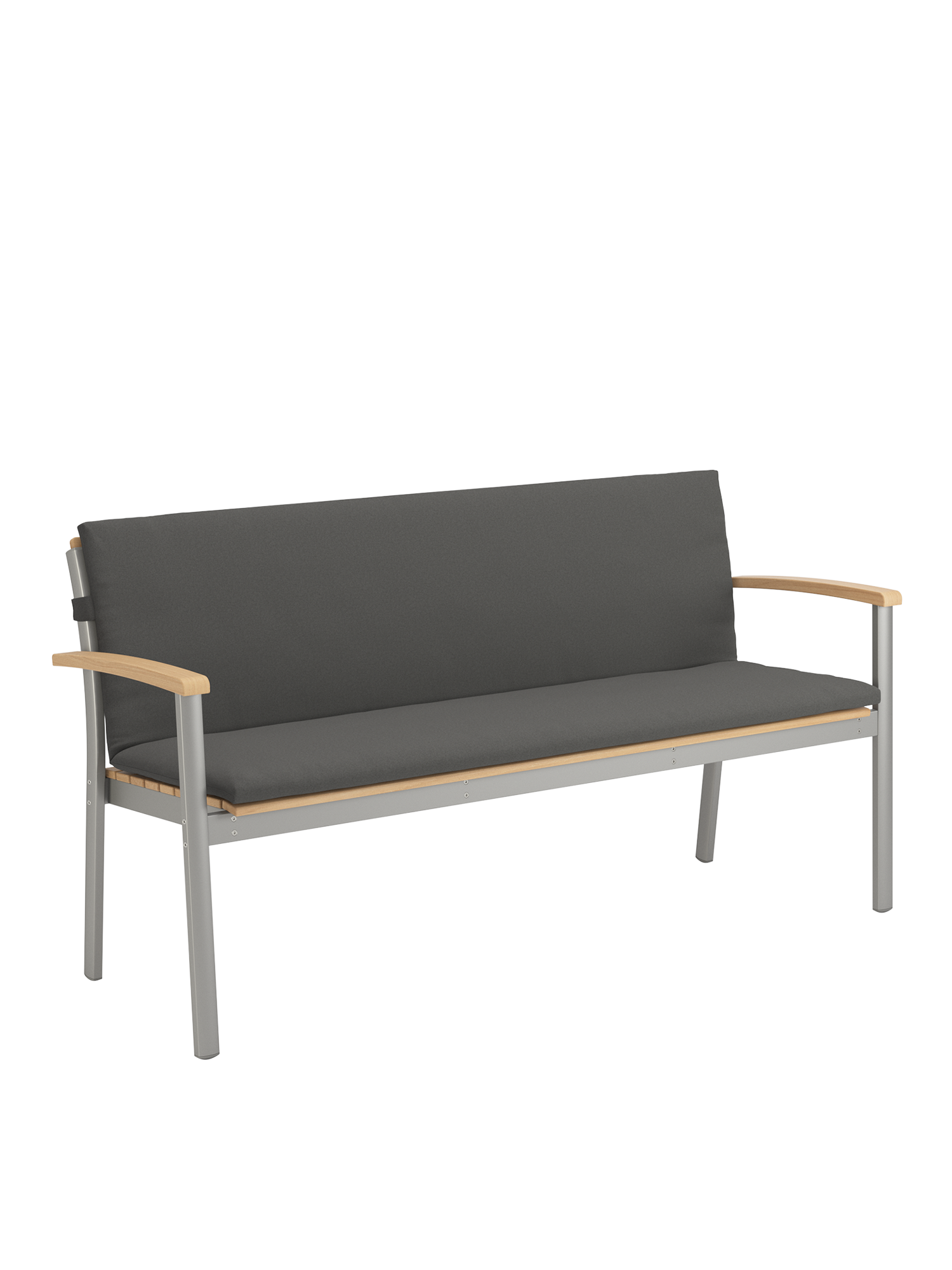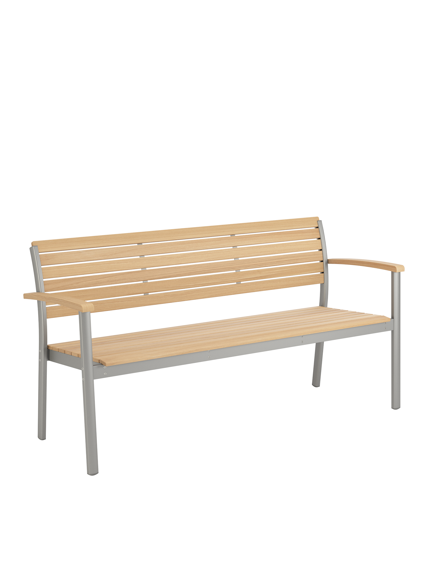 Durable materials show off their aesthetic qualities to perfection here: the anodised profiles of the softly gleaming aluminium frame, and the ergonomically shaped teak slats of the seat and backrest, interact in pleasing harmony. The design classic with a modern touch offers space for up to three people.