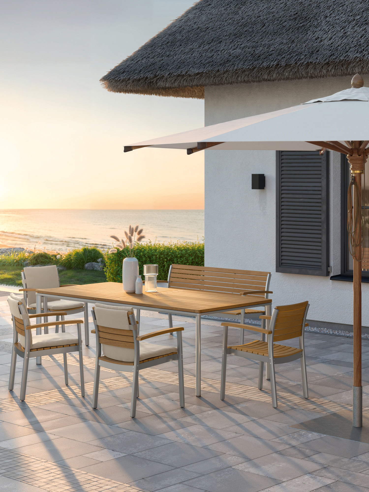 The Monterey Silk bench is in itself a striking solitaire, but also a beautiful addition to exclusive seating groups. The generous garden seat harmonises subtly with selected tables, especially the Portland Silk models.
