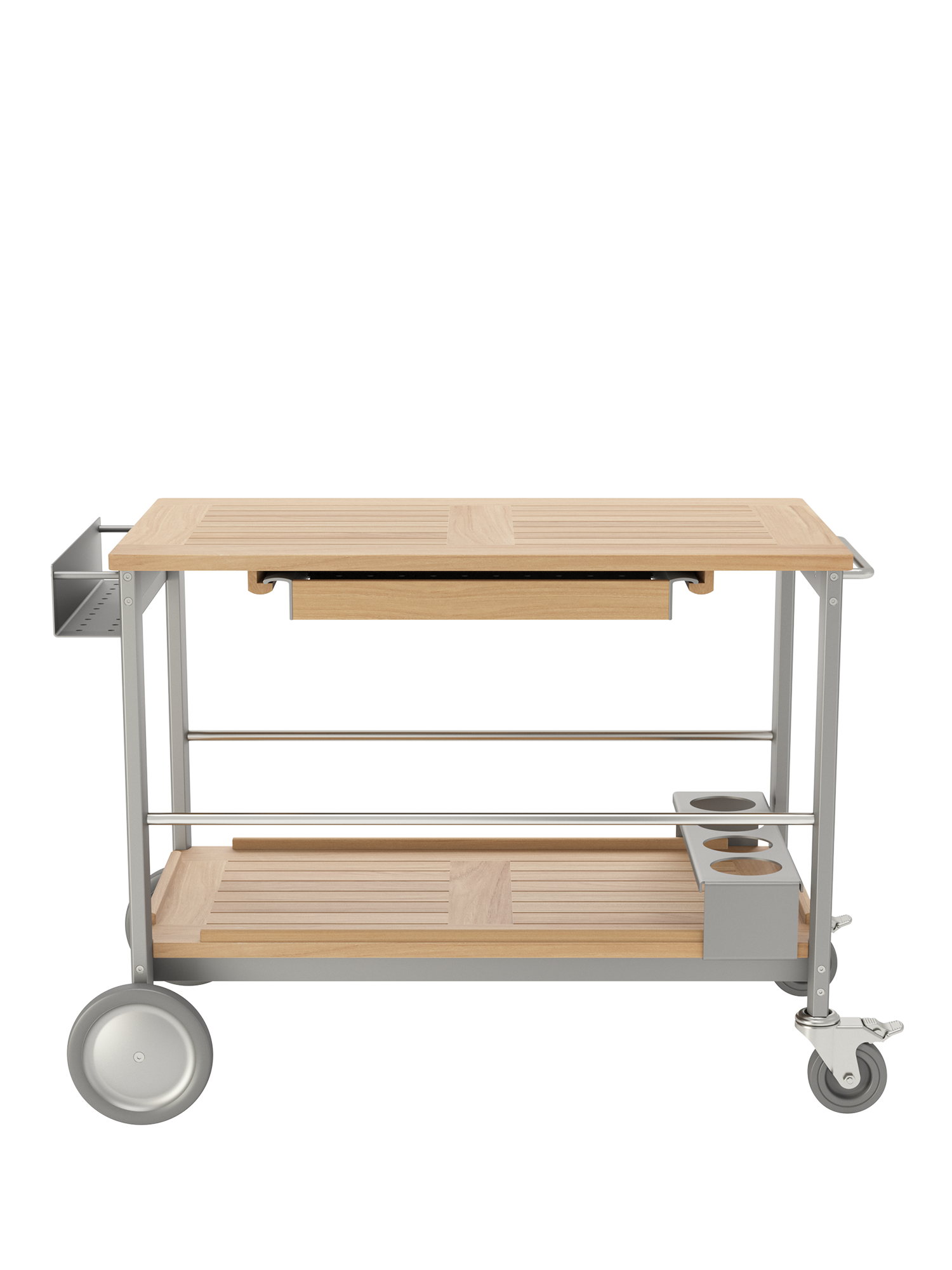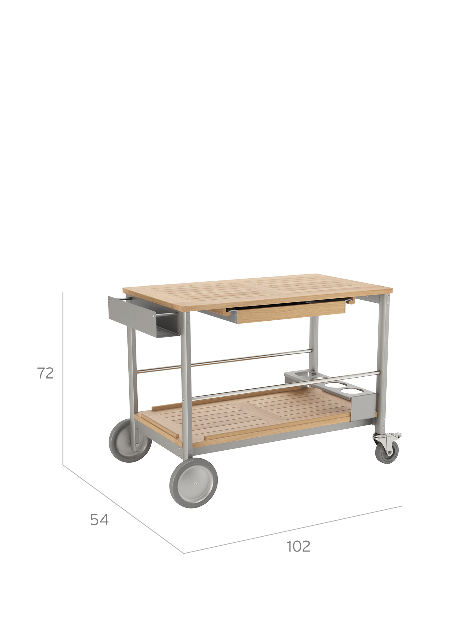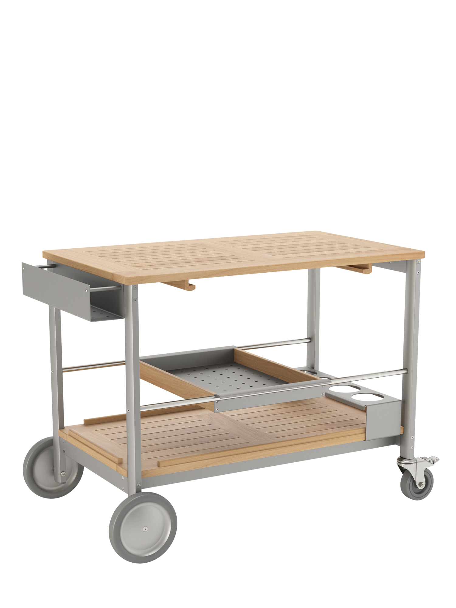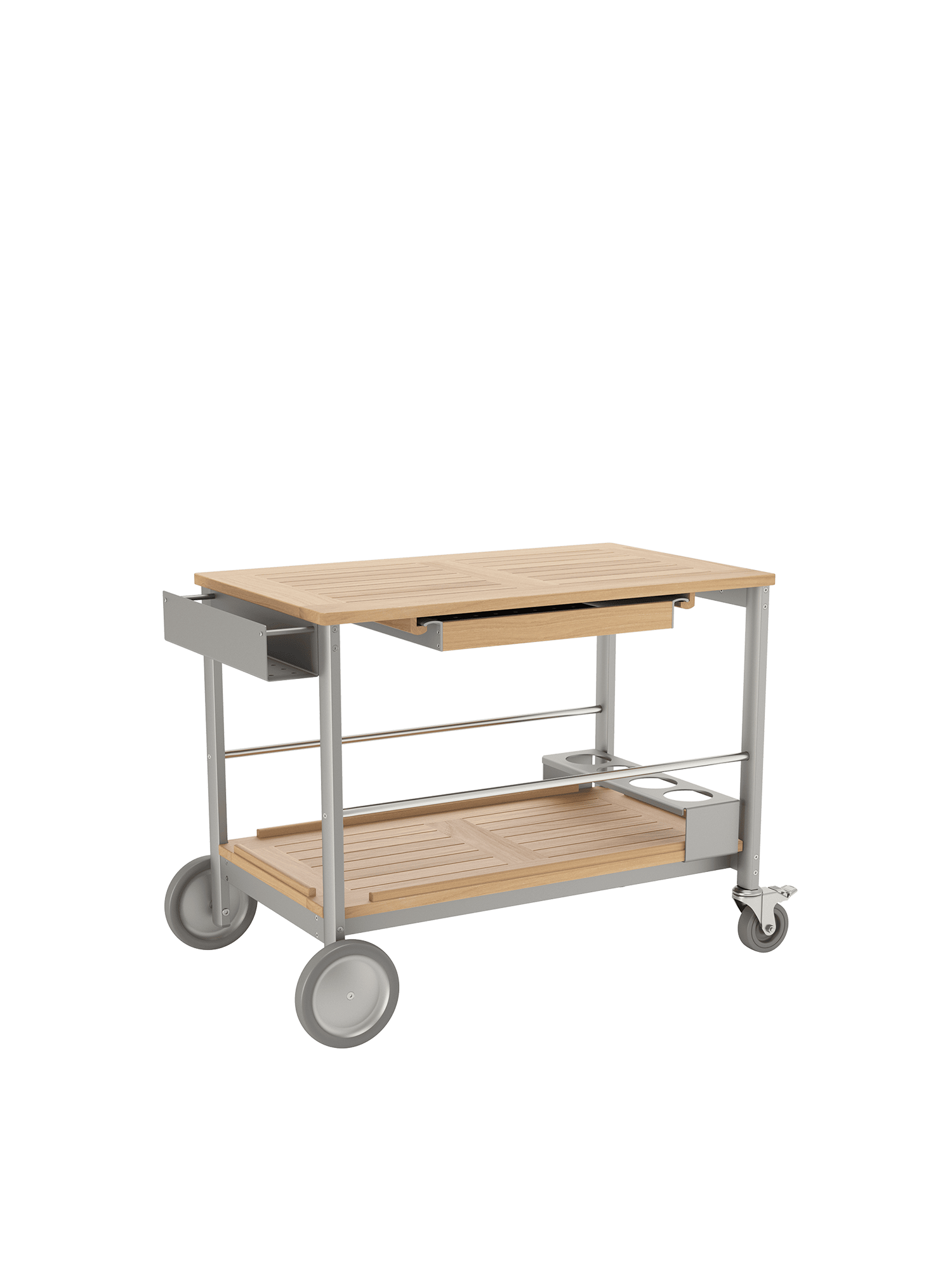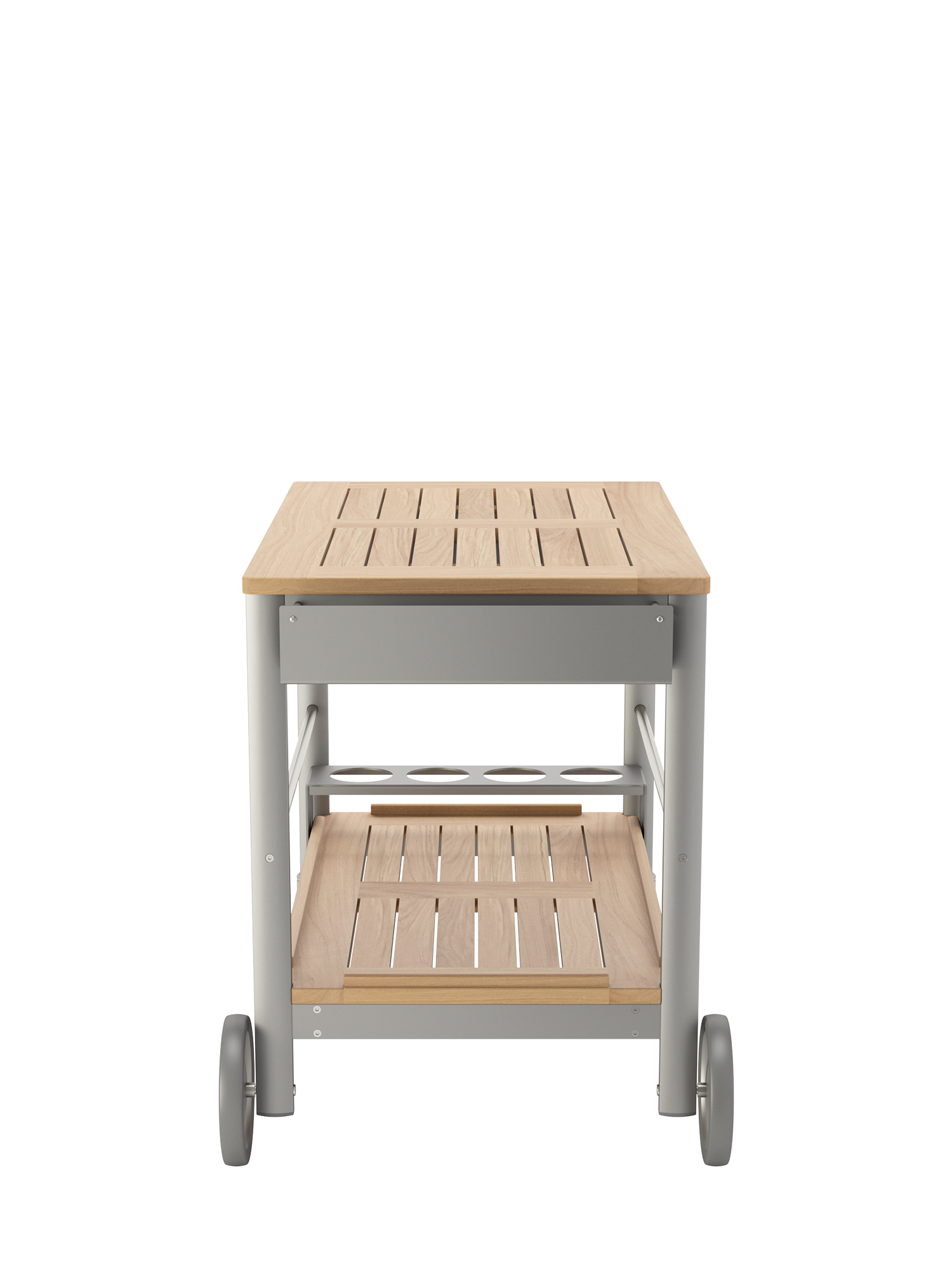 Long-lasting materials are perfectly displayed here: finely polished teak wood unites with the anodised profiles of the softly gleaming aluminium frame. Thanks to its contemporary appearance, the bar trolley harmonises not only with the furniture of the Monterey collection, but also enhances other classic present-day seating groups by Garpa.