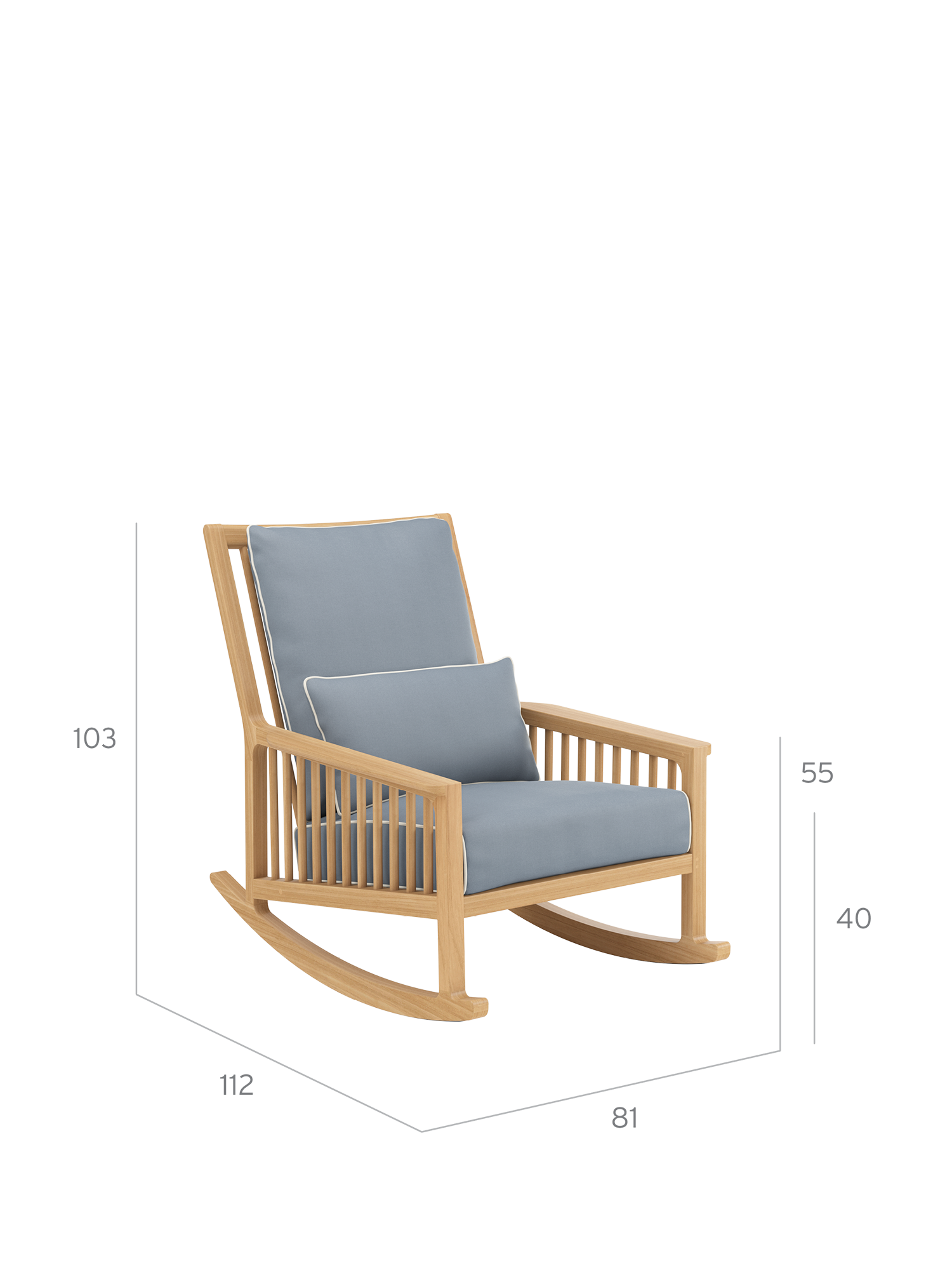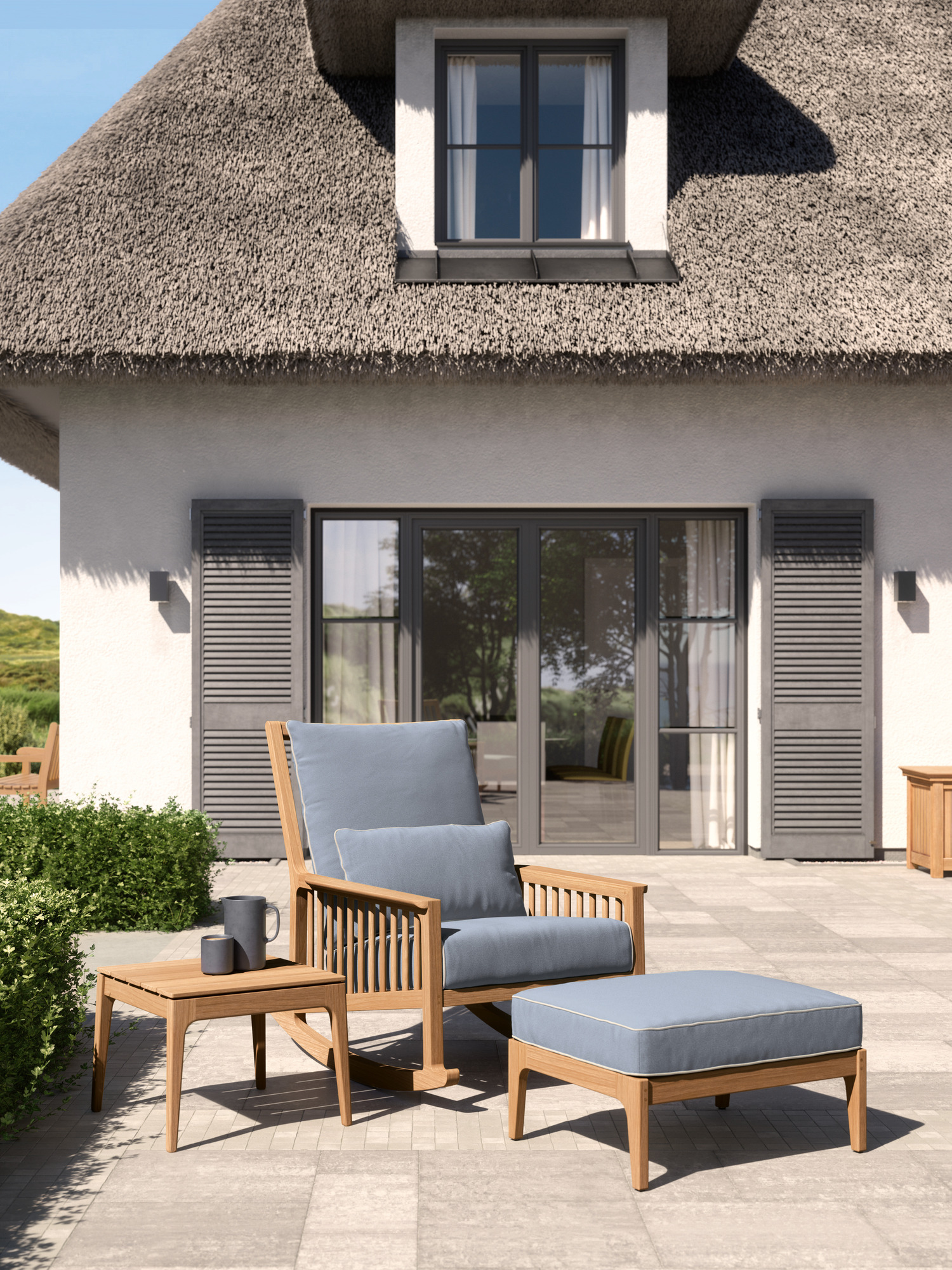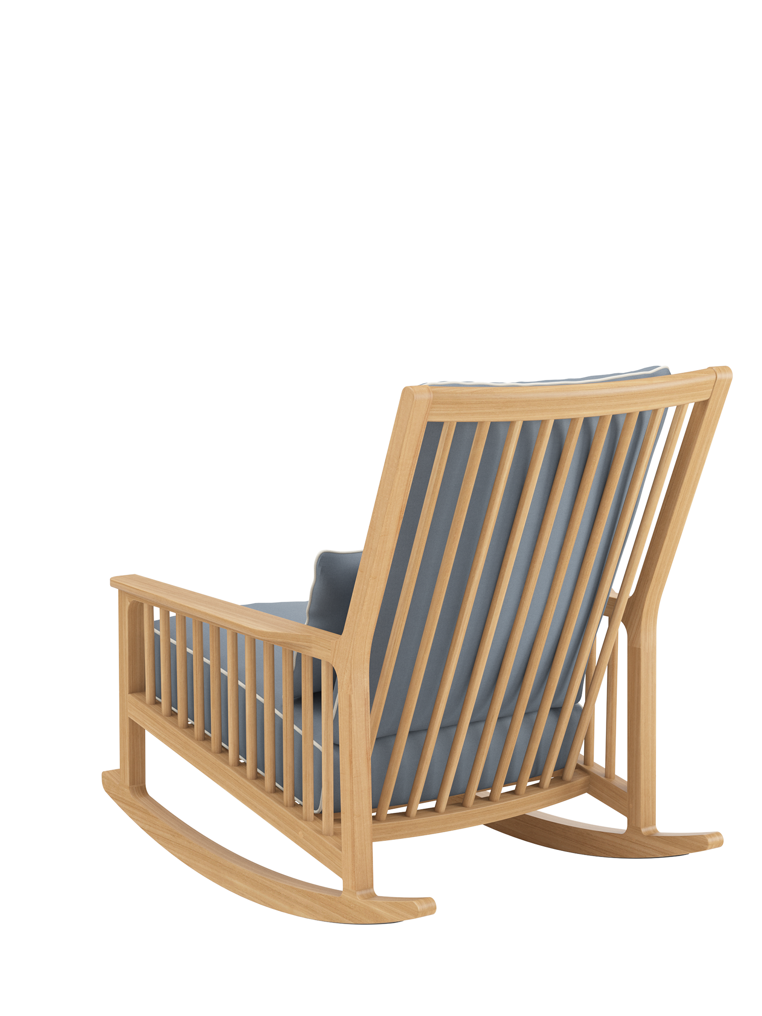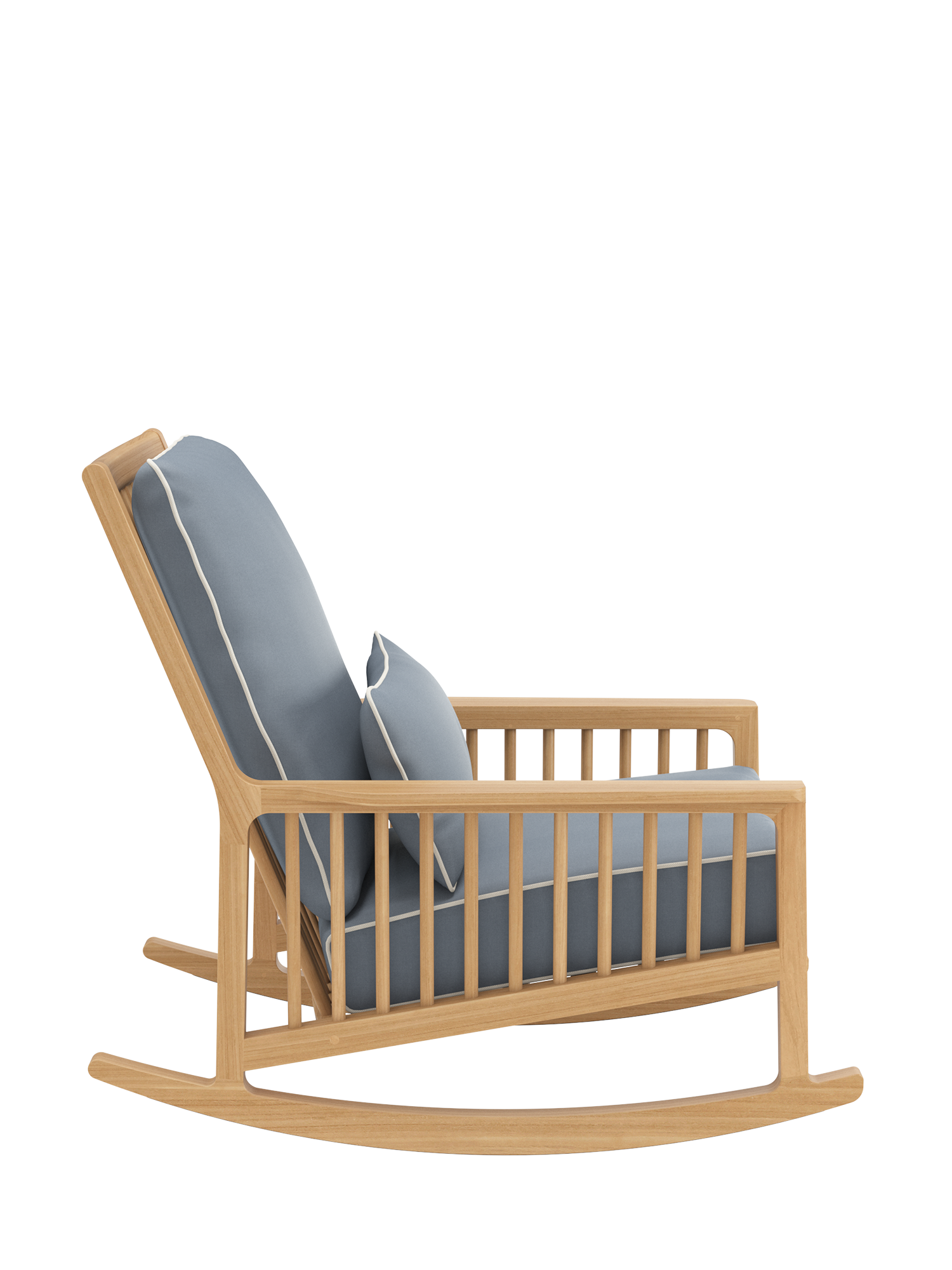 The shoulder-high backrest is made for reclining, and the pleasant depth is especially inviting. One quick movement, a lift of the legs, and you are gently tilting on elegant teak runners – and how delightful to be able to sink into the dreamily soft cushioning of the rocking chair. A covering of synthetic material beneath the runners protects sensitive flooring.