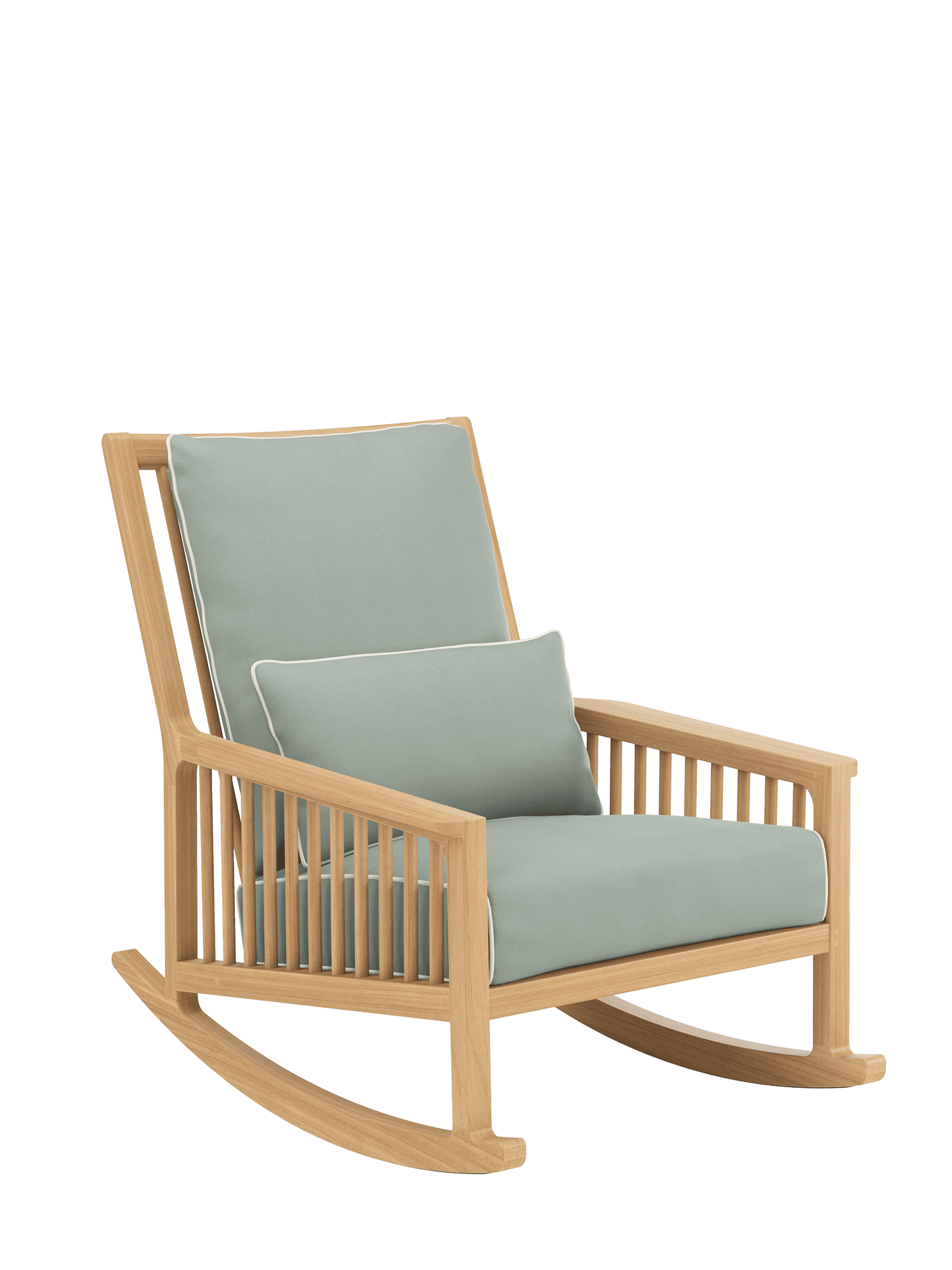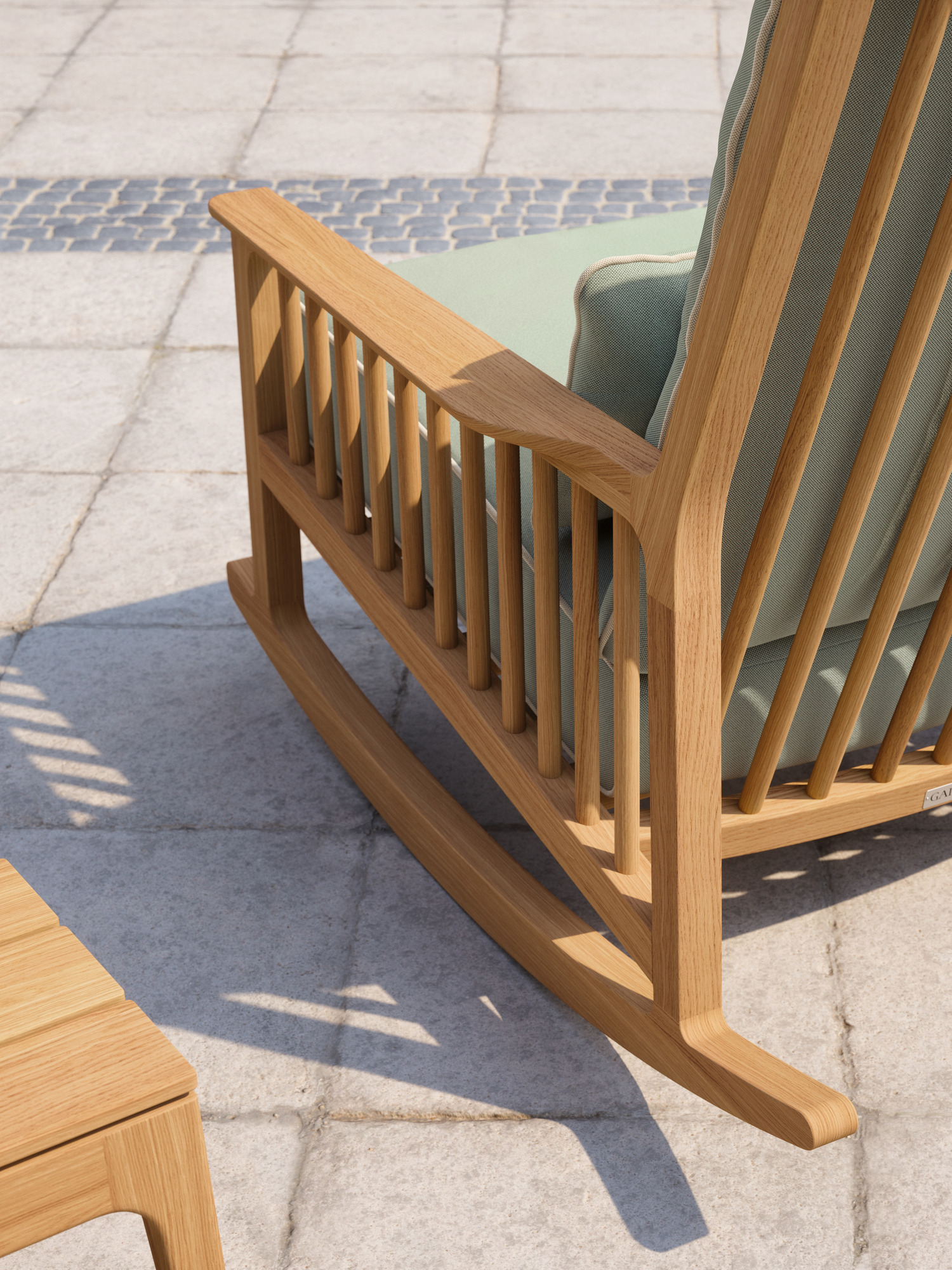 The shoulder-high backrest is made for reclining, and the pleasant depth is especially inviting. One quick movement, a lift of the legs, and you are gently tilting on elegant teak runners – and how delightful to be able to sink into the dreamily soft cushioning of the rocking chair. A covering of synthetic material beneath the runners protects sensitive flooring.
