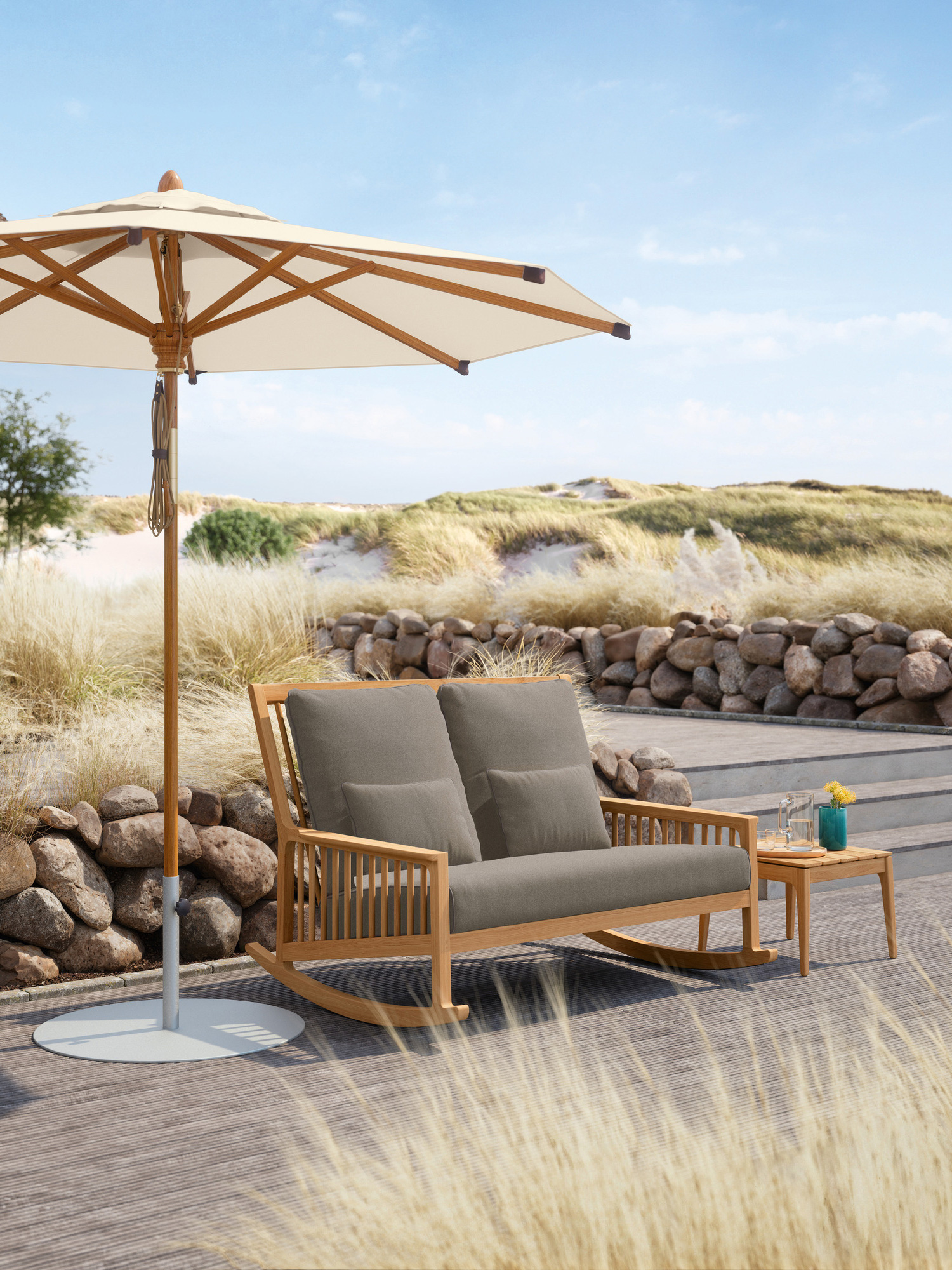The proven qualities of Garpa’s garden seat and rocking chair are raised to a higher power when combined. The two-seater is perfect for sharing happy moments and enjoying cosy comfort side by side. Newhaven pampers with a shoulder-high backrest and an especially deep seat. Classic teak keeps things grounded and elegant design ensures soothing motion. Should you happen to have both seats to yourself, you can stretch out, put your feet up, and tuck a soft cushion under your head.