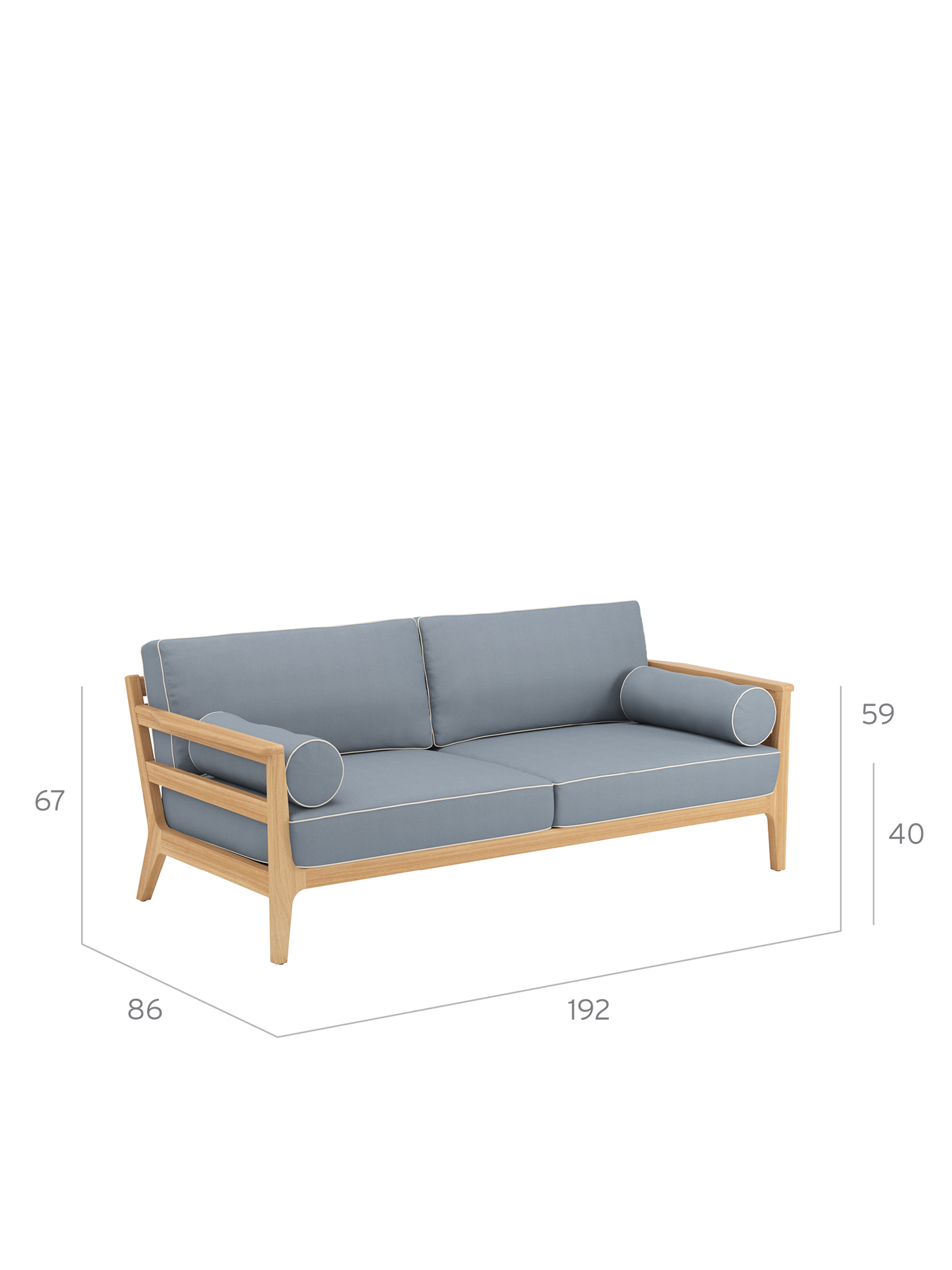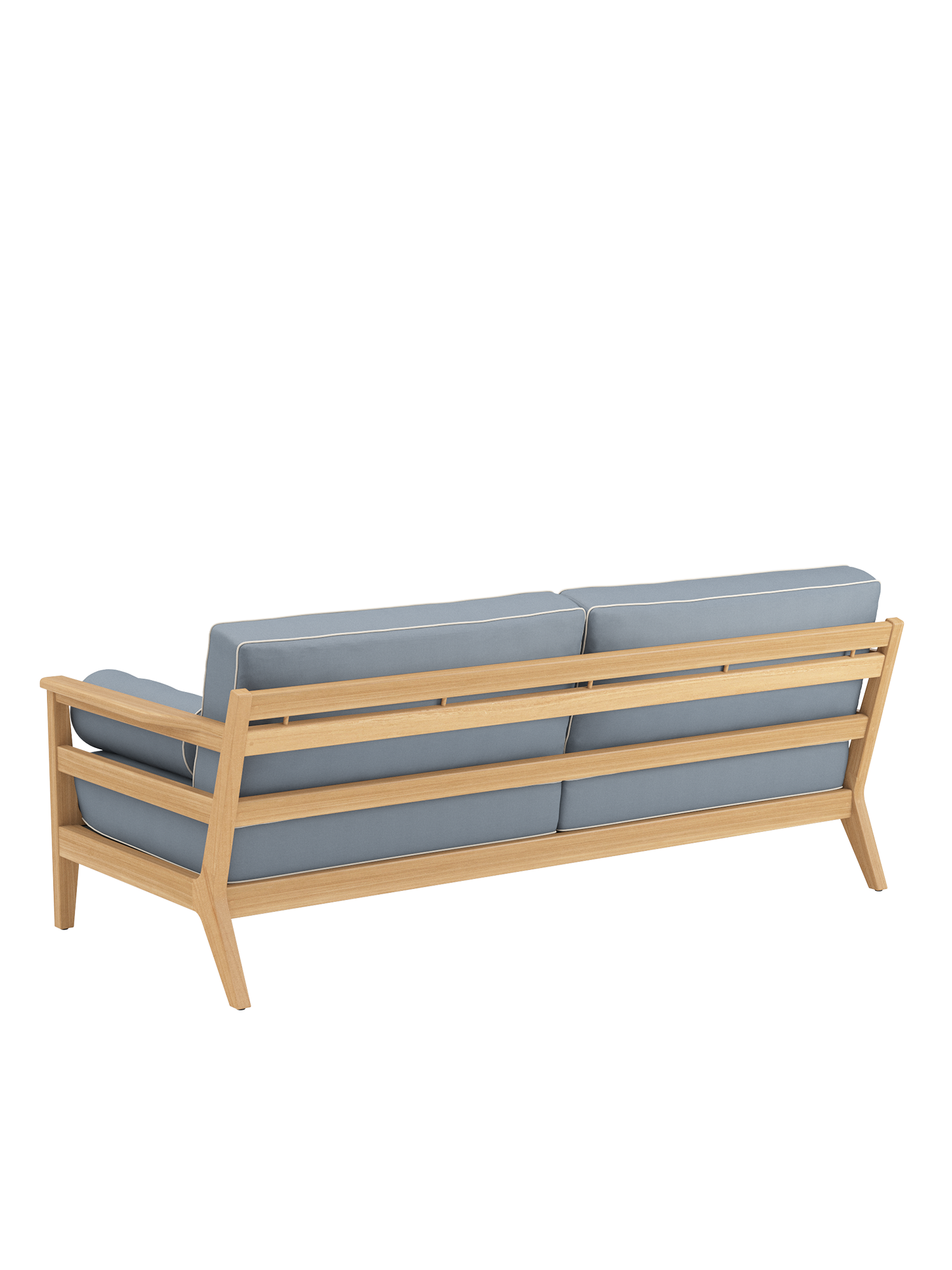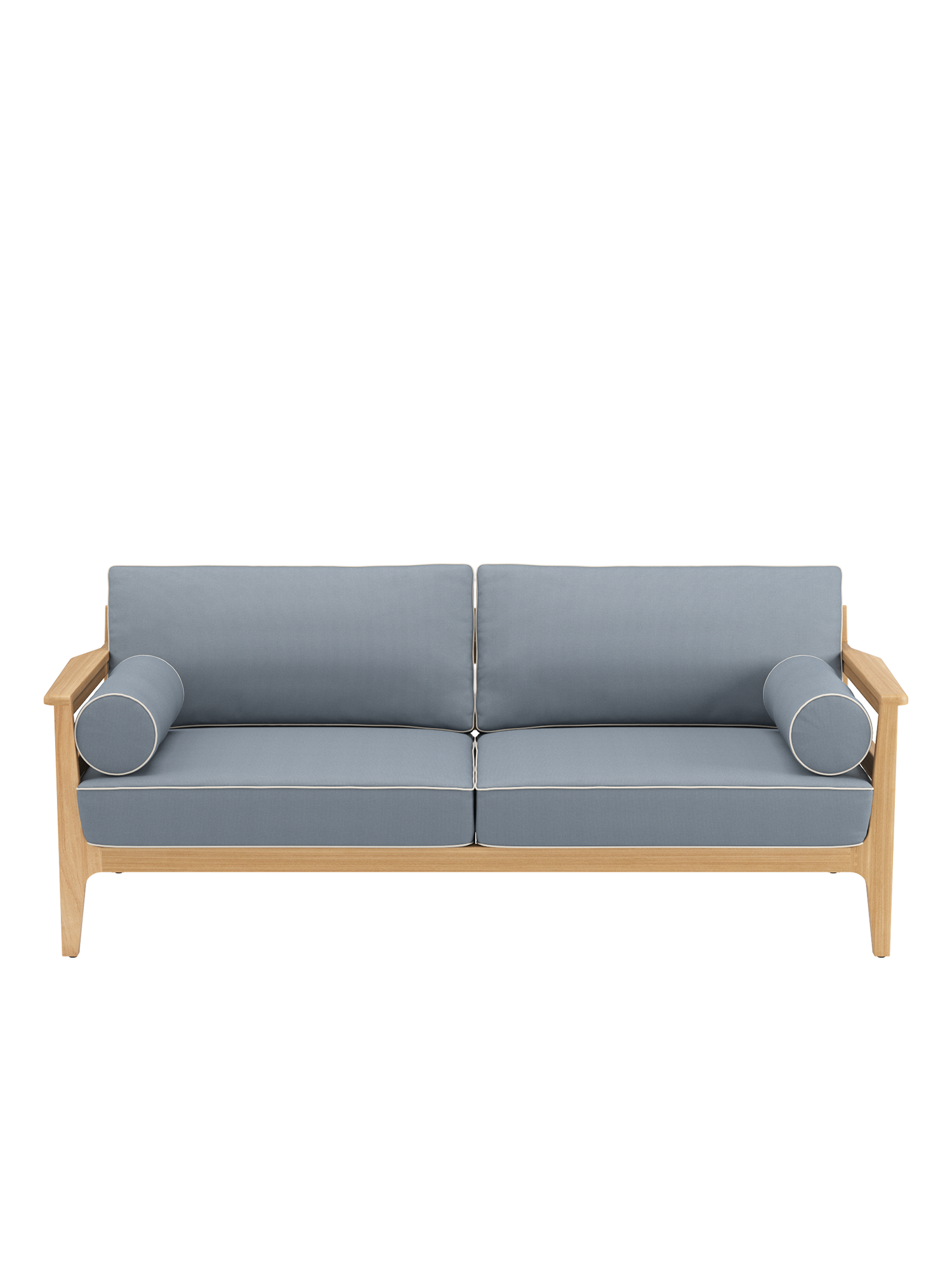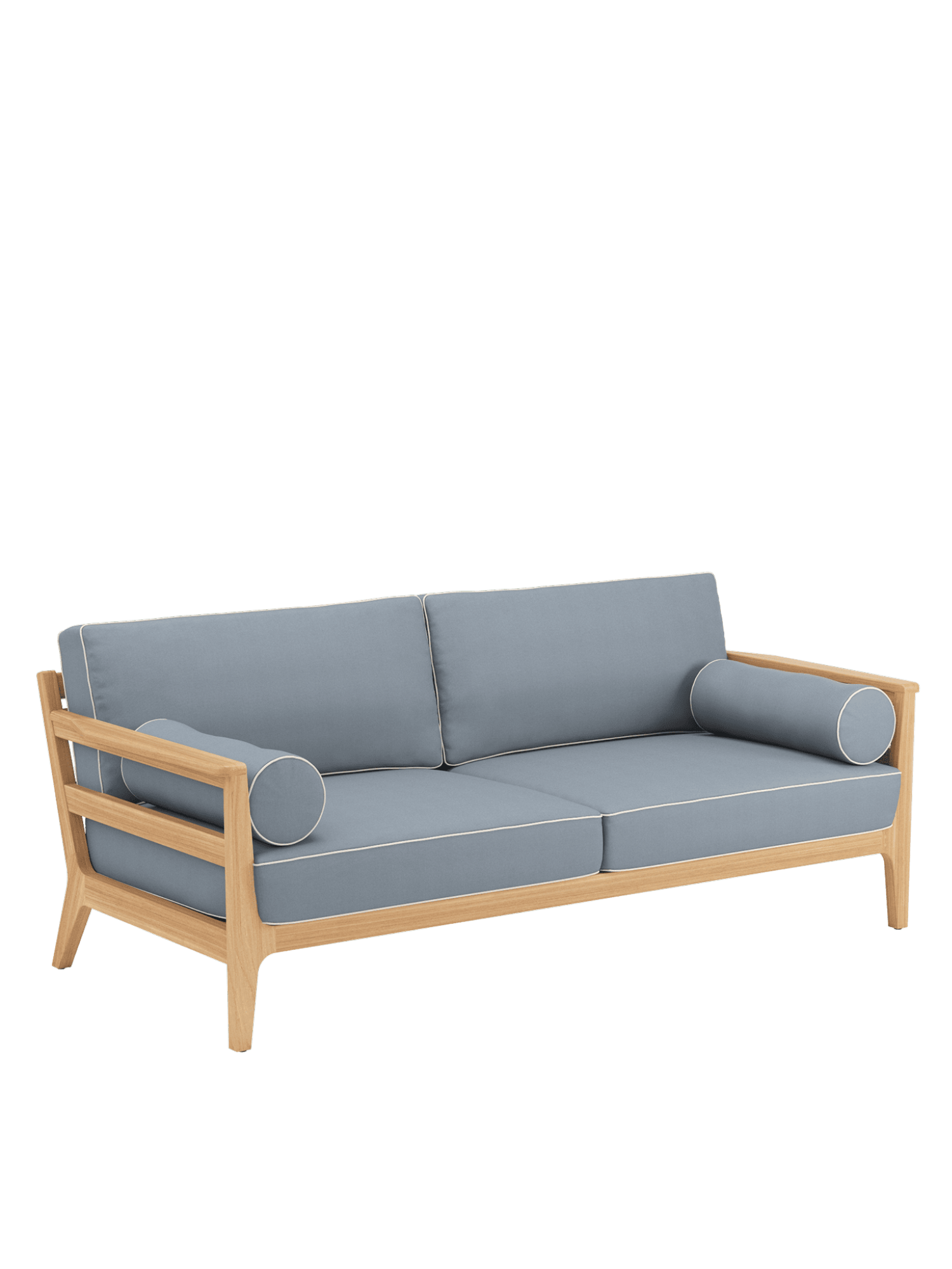 The spacious furniture in lounge format provides a cosy retreat. The frames are made of high-quality plantation teak, and the seats are covered with fabric that firmly supports the comfortable upholstery. The beautiful piped seams provide eye-catching detail that lends the classic ensemble its maritime charm. All cushions are colour edged, including the padded bolsters that serve as armrests for the sofas.