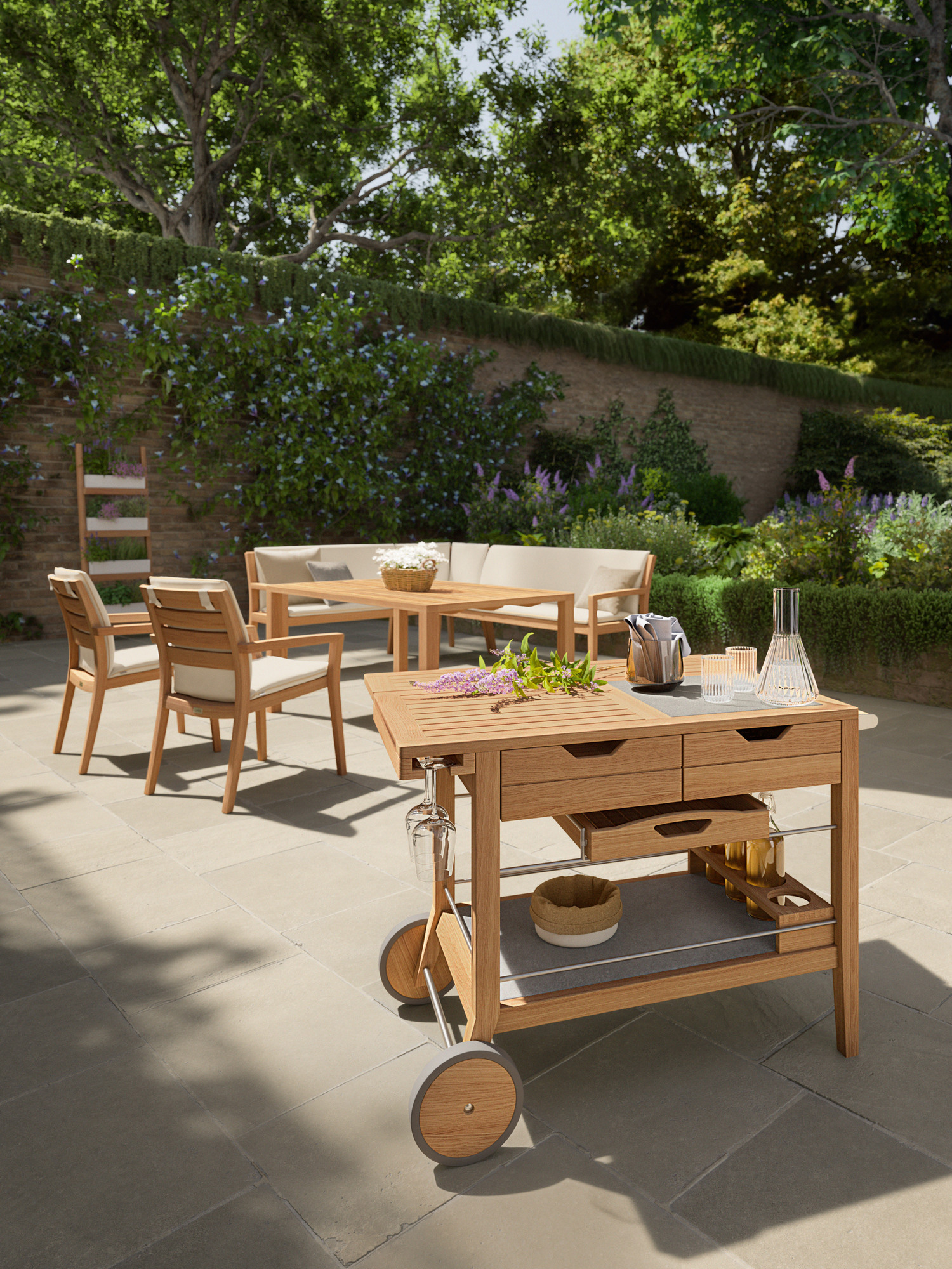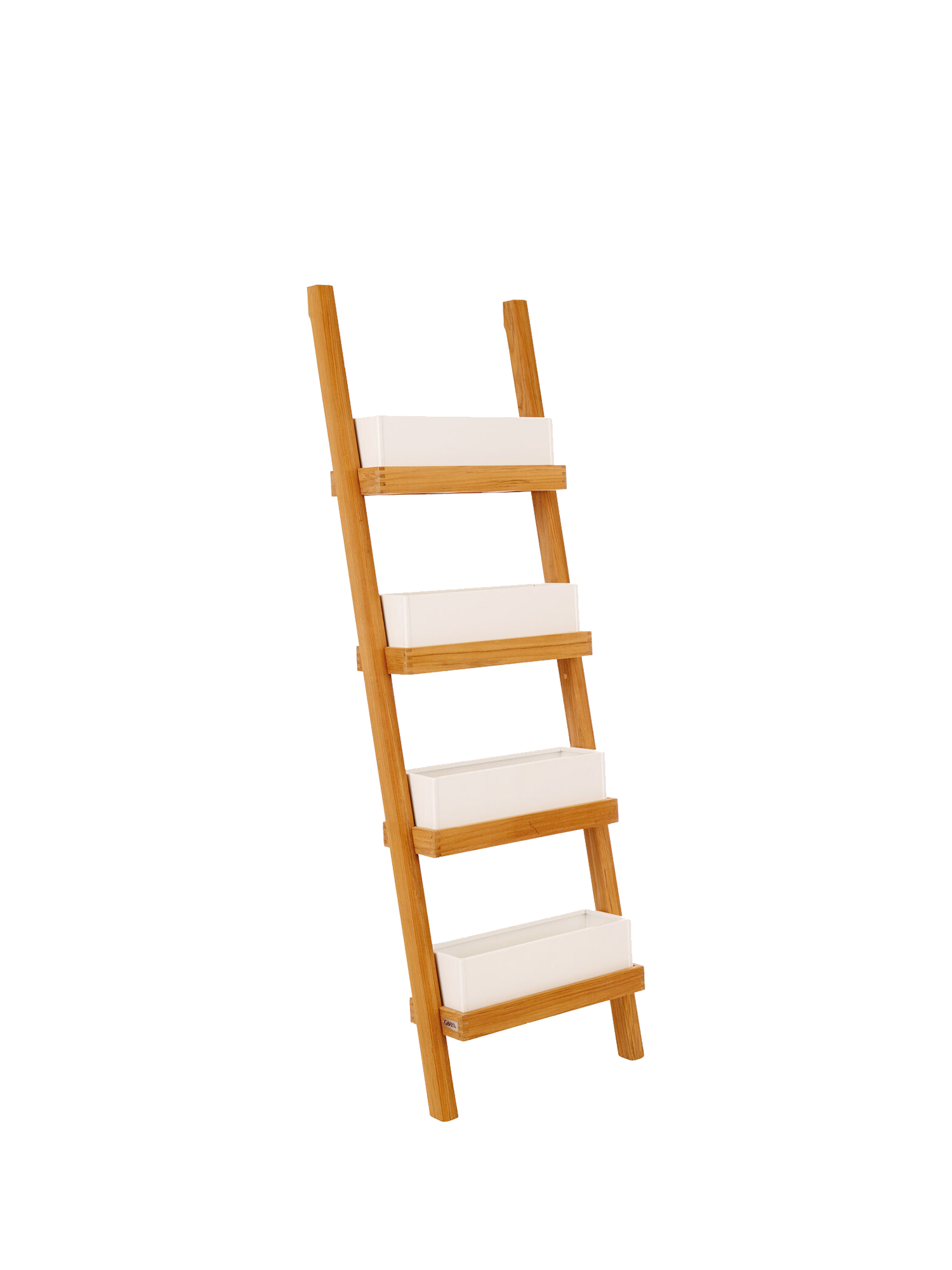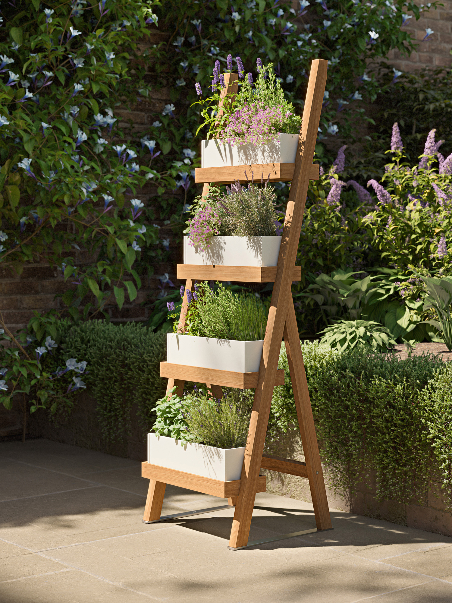 The weather-resistant teak plant ladder opens up a whole new dimension for passionate urban and balcony gardeners. The four white powder-coated aluminium trough planters included can be used to grow basil, mint or chives for freshly picked harvests. The trough planters each have each have four drainage holes for tap water or rain water to pass through. Matching drainage hole seals are included.