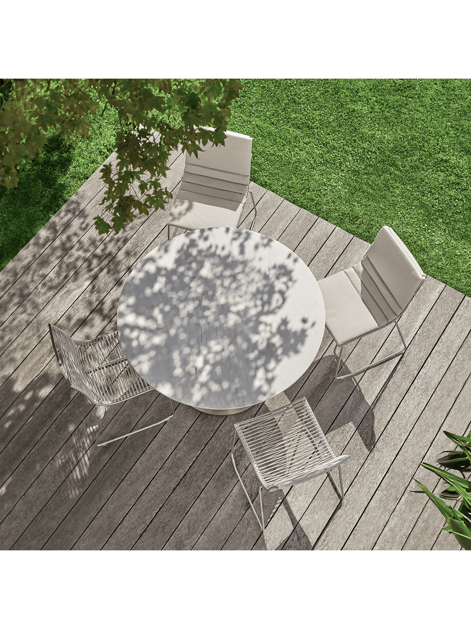 To complete the seating group, matching tables are available in different formats and with teak-slatted tops or tops of synthetic resin (HPL) or stone ceramic. Pan chairs, with their simple elegance, combine attractively also with other modern tables in our collection. For an overview of all matching tables, click on "Matching tables' further down on this page.