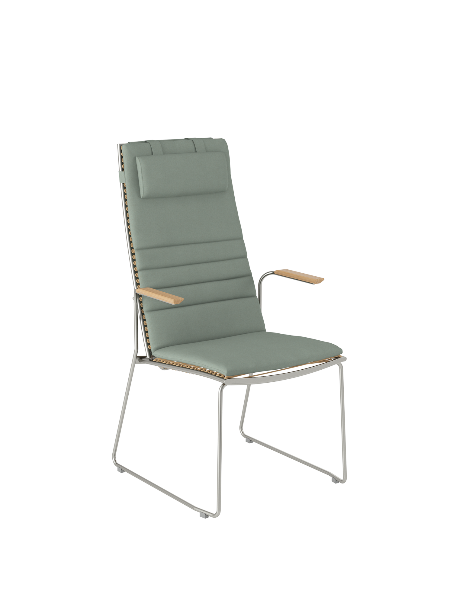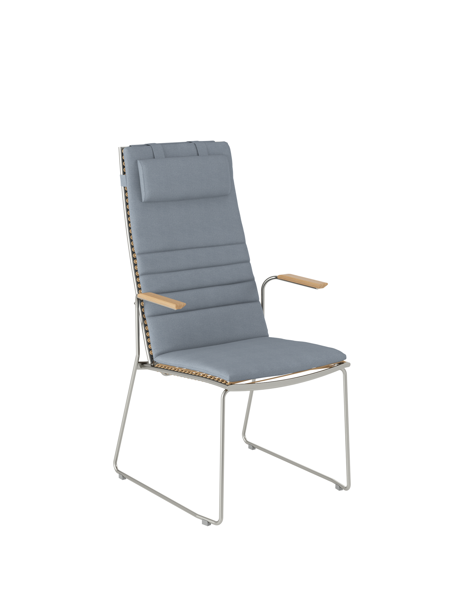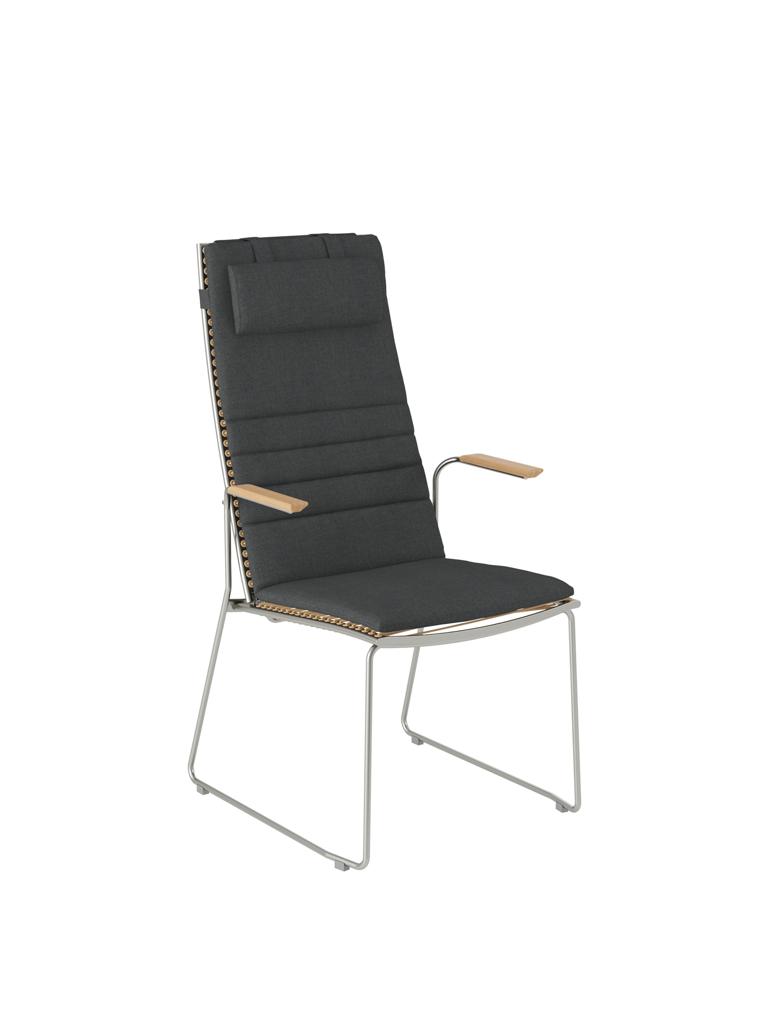 Pan looks as light as a breeze. The elegant highbacks with frames of powder-coated stainless steel have a covering of permanently elastic fibre, which comfortably conforms to the shape of the body. The chairs with the high backrest can be ideally combined with the matching footstool.