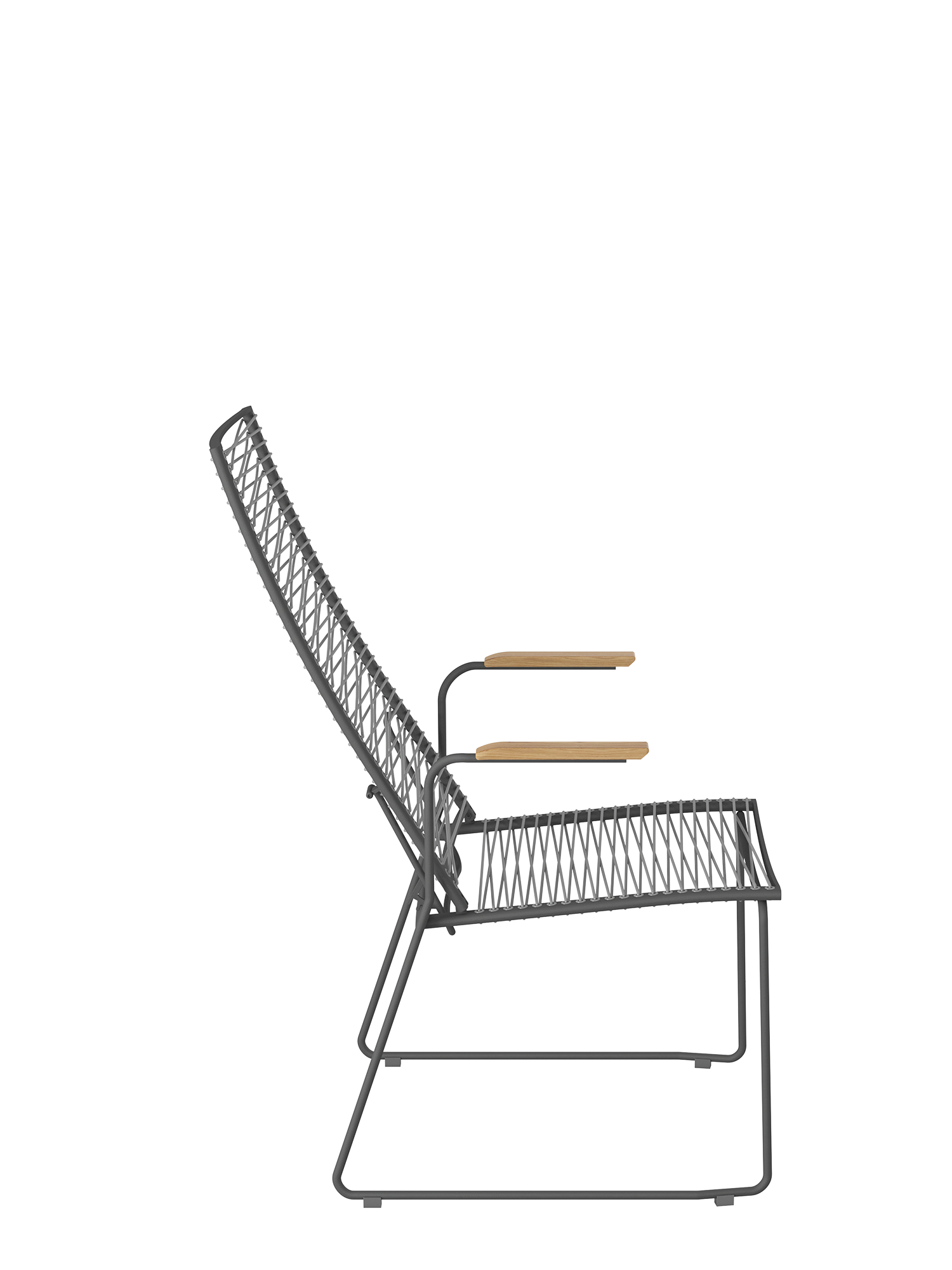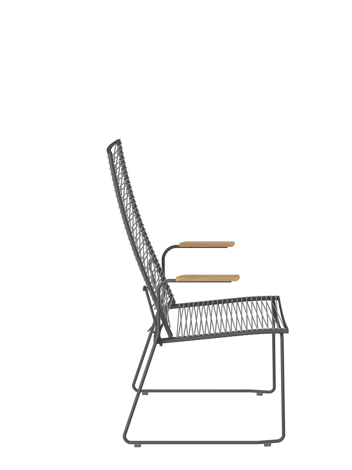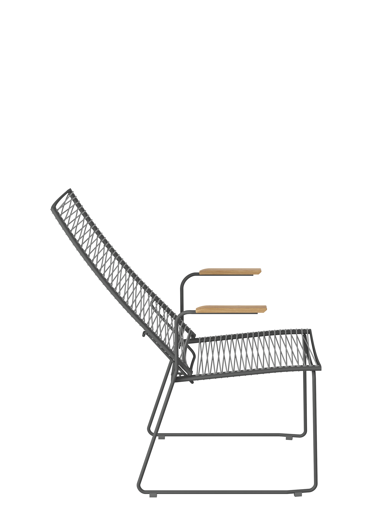 A distinguishing feature of the modern seating furniture is the lacing threaded through eyes in the frame. The synthetic fibre is UV- and frost-resistant, and retains its tautness even when constantly in use.