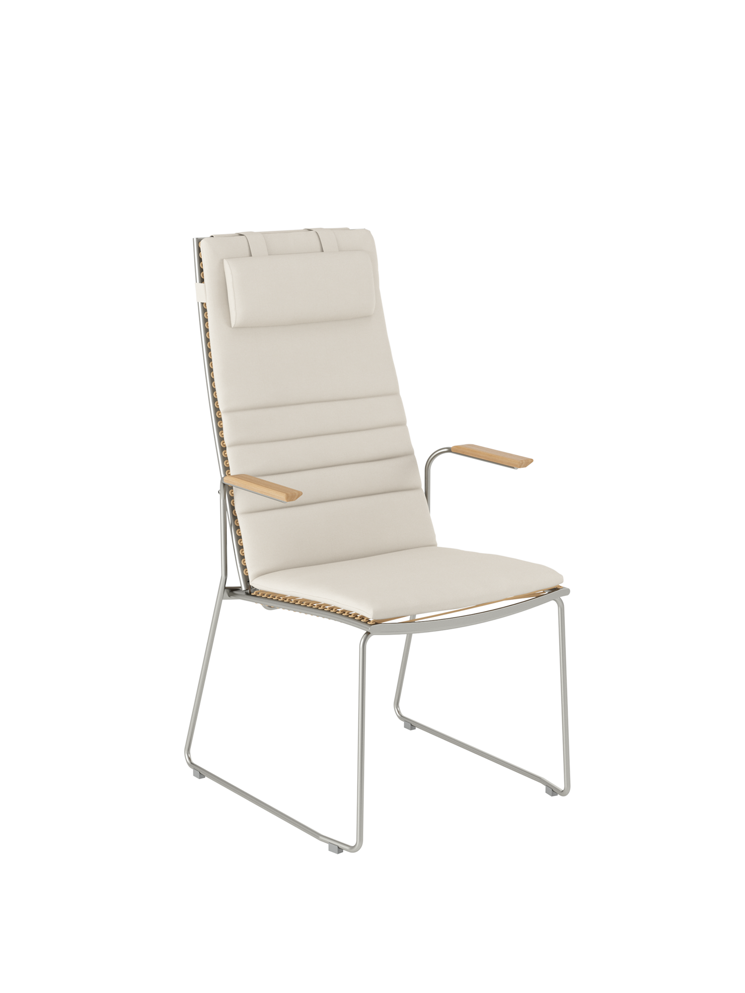 To ensure extra seating comfort for taller people, the backrest of the Pan Highback made of stainless steel and a synthetic weave in brown or white is especially high to support shoulders and head. A matching cushion with headrest is available separately.