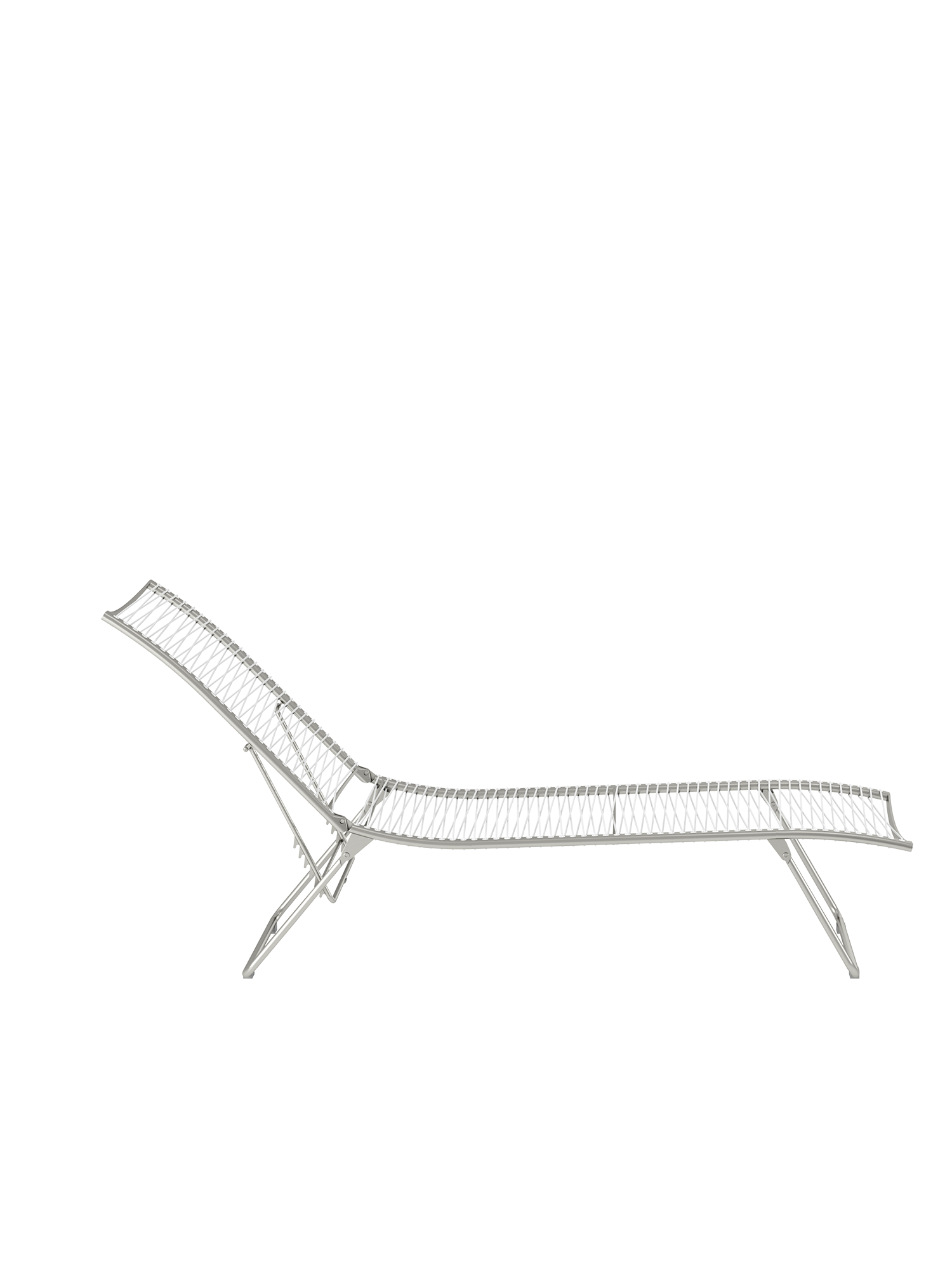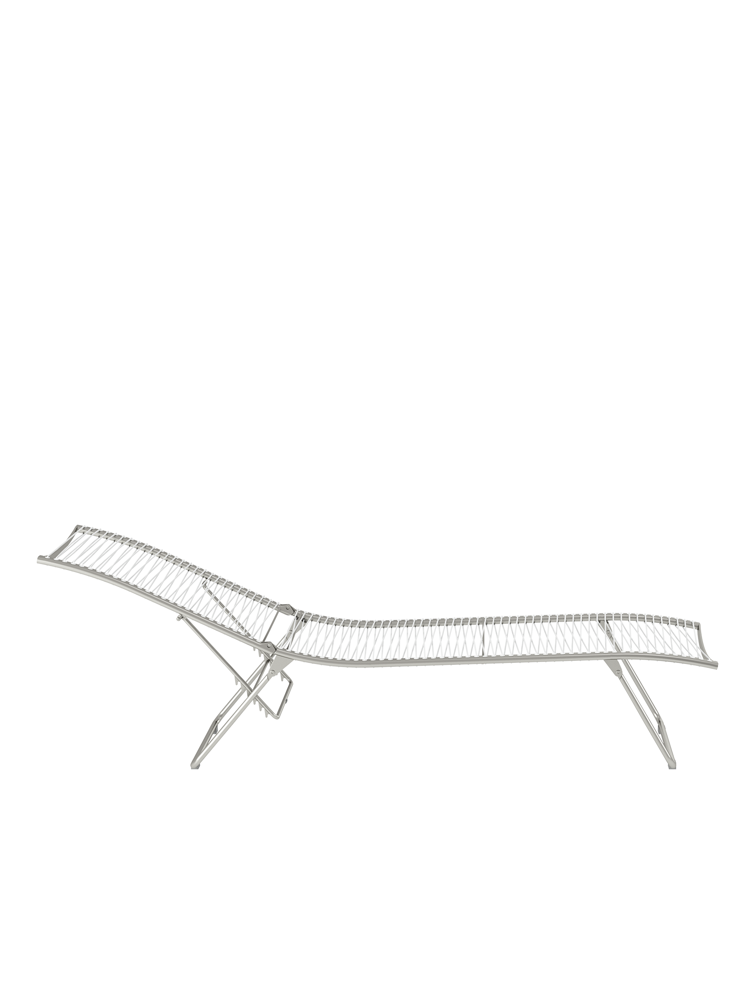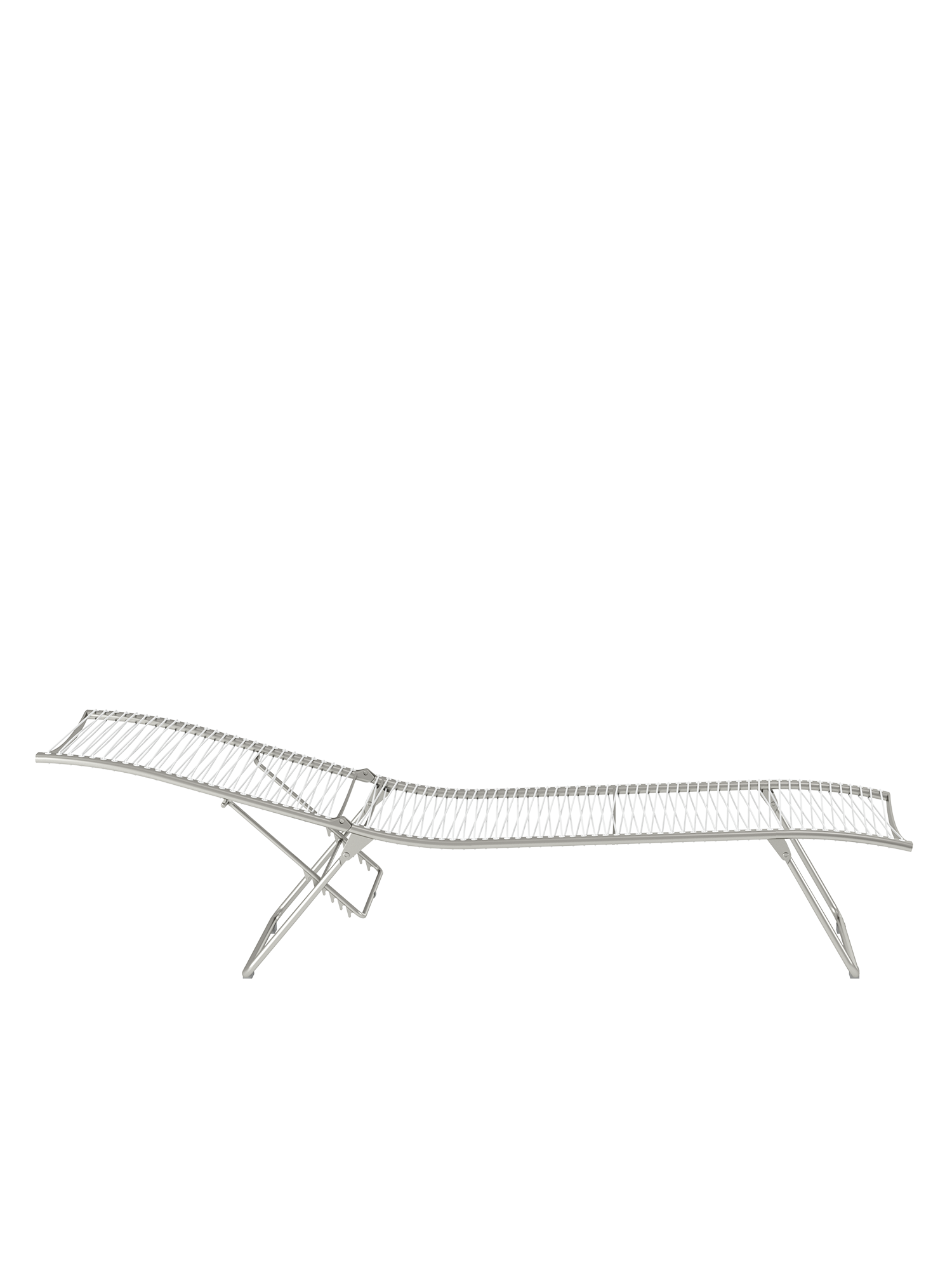 This lounger originated in the flow of a single curved line from the pen of the designer. The idea of it being foldable makes it perfect. The resilient, synthetic lacing on an elegant stainless steel frame adapts comfortably to the contours of the body. The backrest can be adjusted to six positions, making sunbathing face down possible.