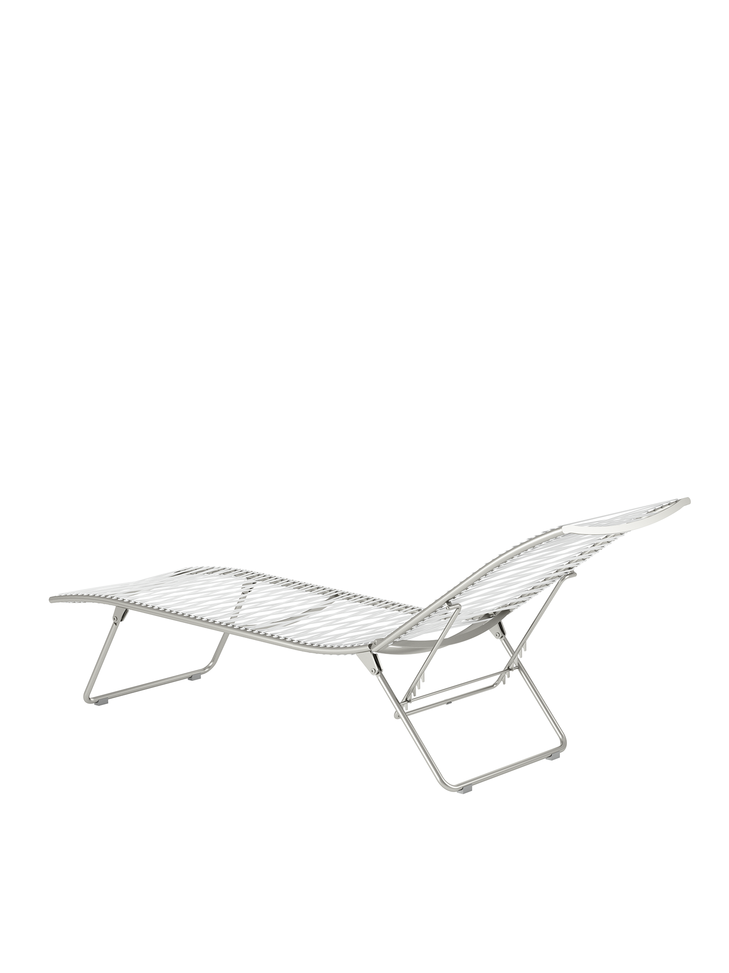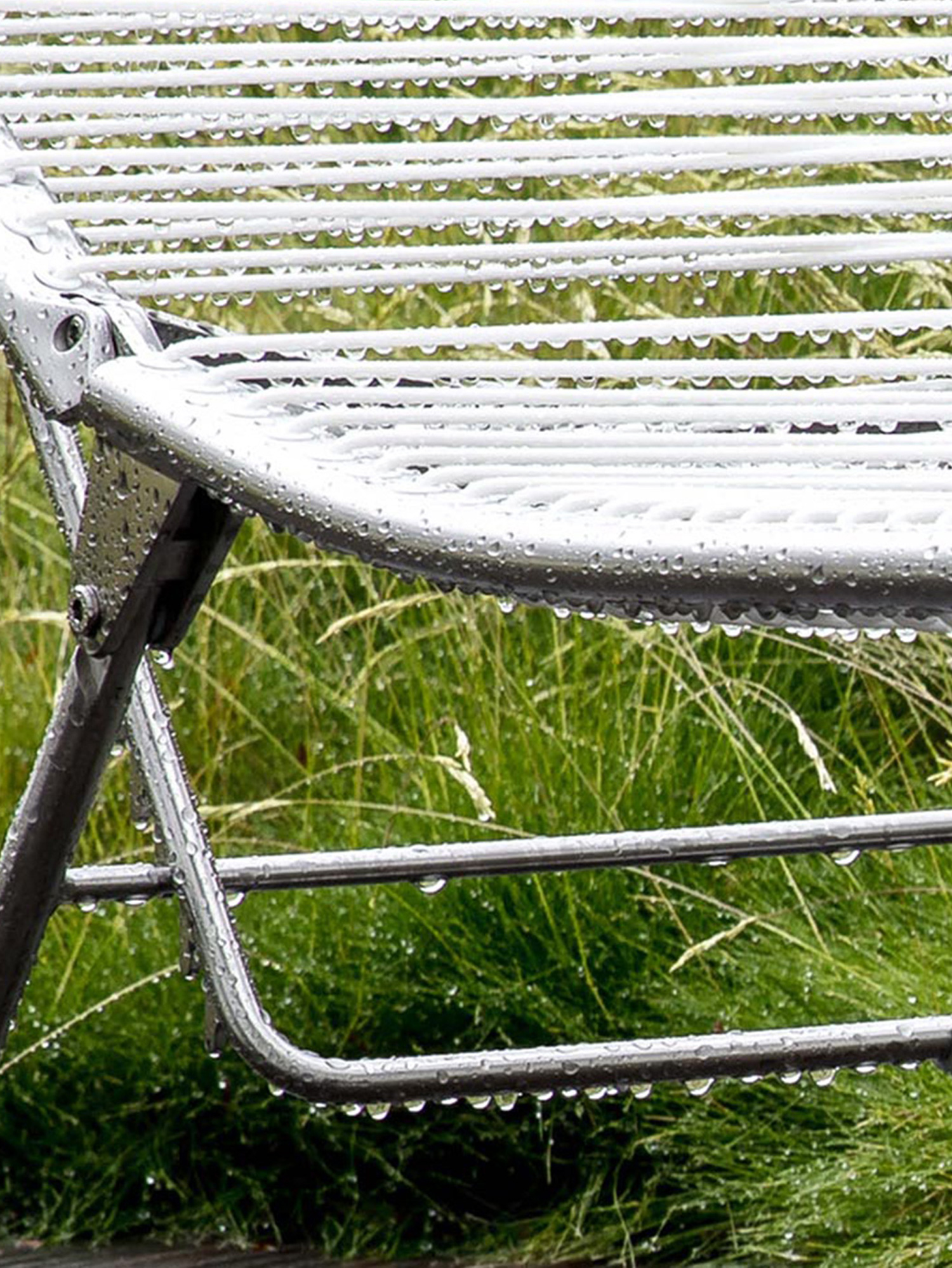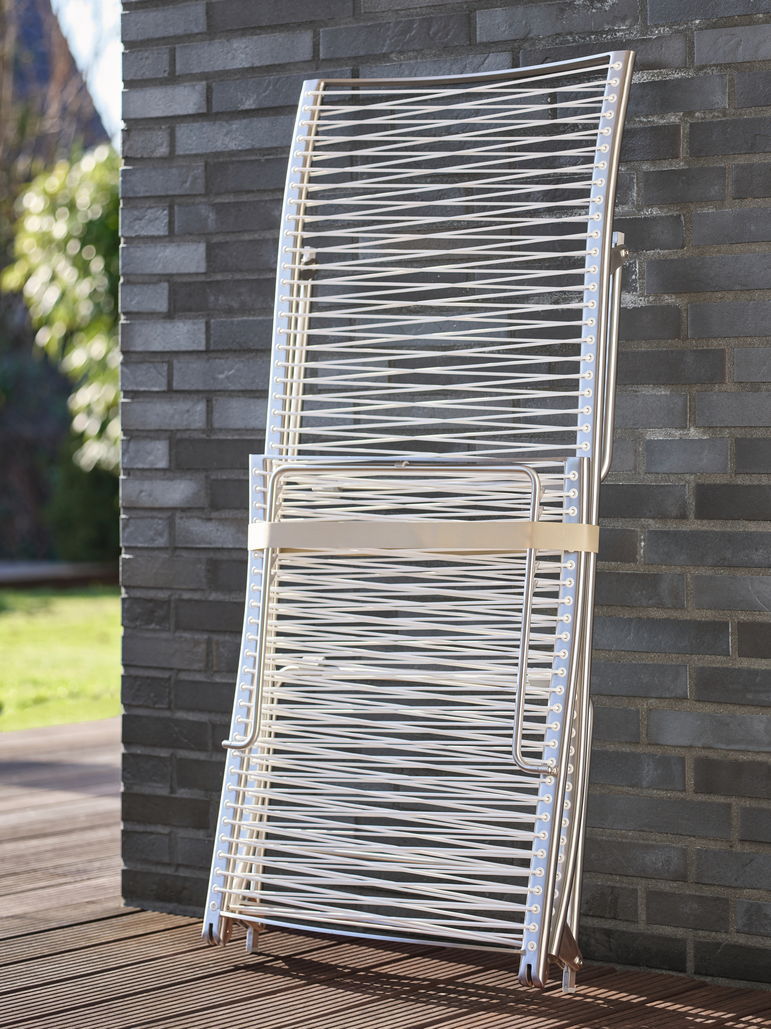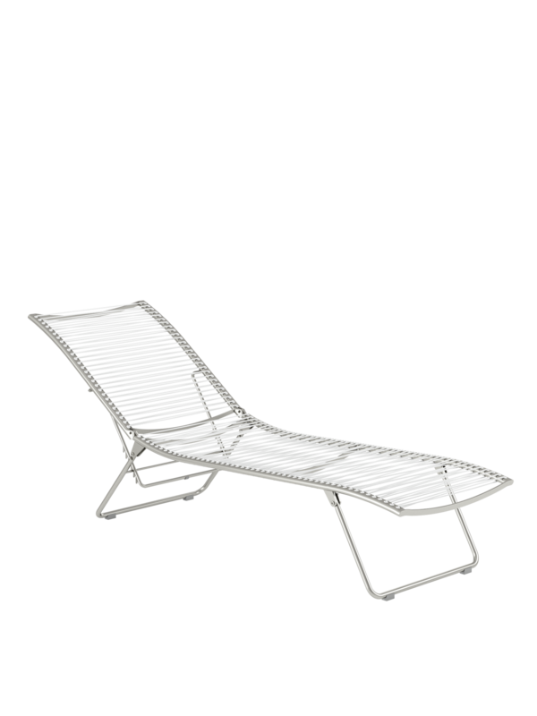 This lounger originated in the flow of a single curved line from the pen of the designer. The idea of it being foldable makes it perfect. The resilient, synthetic lacing on an elegant stainless steel frame adapts comfortably to the contours of the body. The backrest can be adjusted to six positions, making sunbathing face down possible.