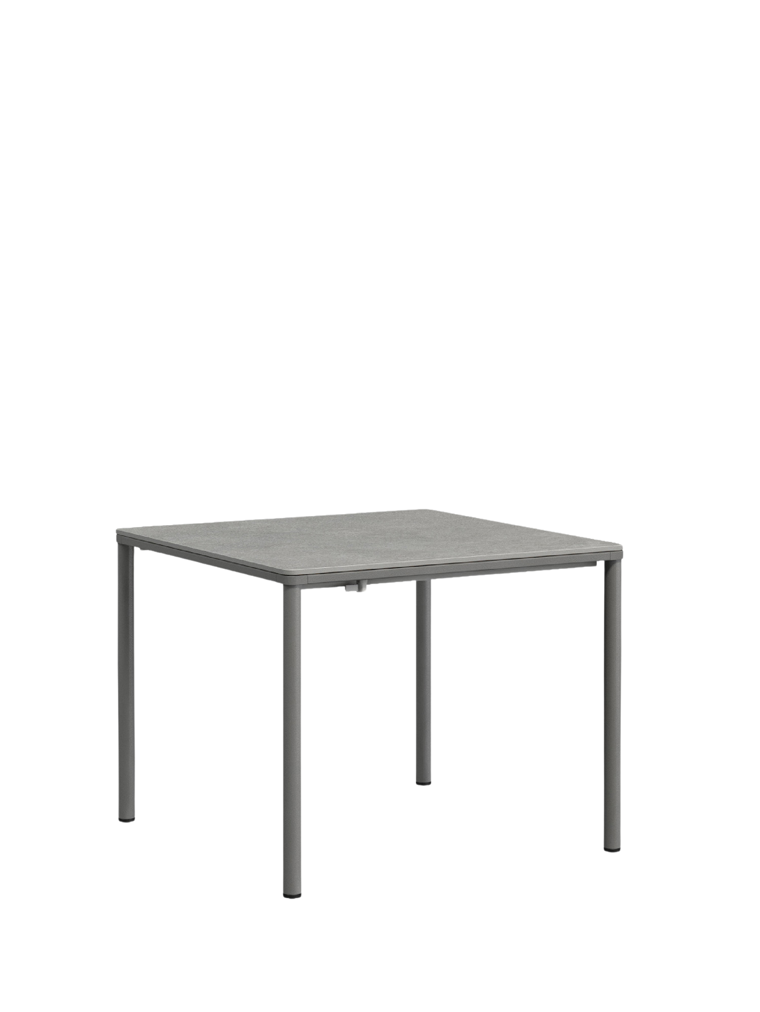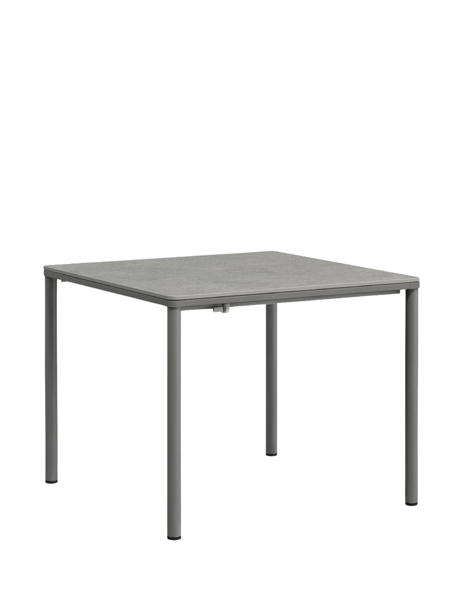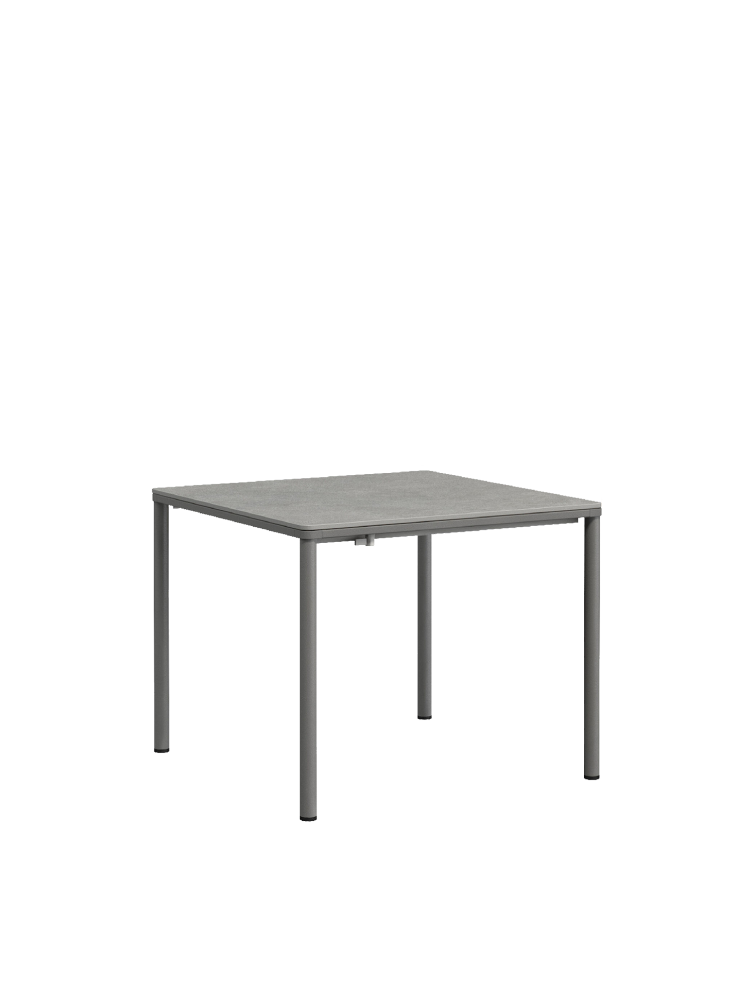 The powder-coated stainless steel frame of the Portland tables combines this model with all chairs made of the same material. Four slender legs bear a table top that appears to be cast from the same piece of powder-coated stainless steel as the frame underneath and that curves at the corners to echo the rounding of the legs. The table top is made of weather-resistant resin.