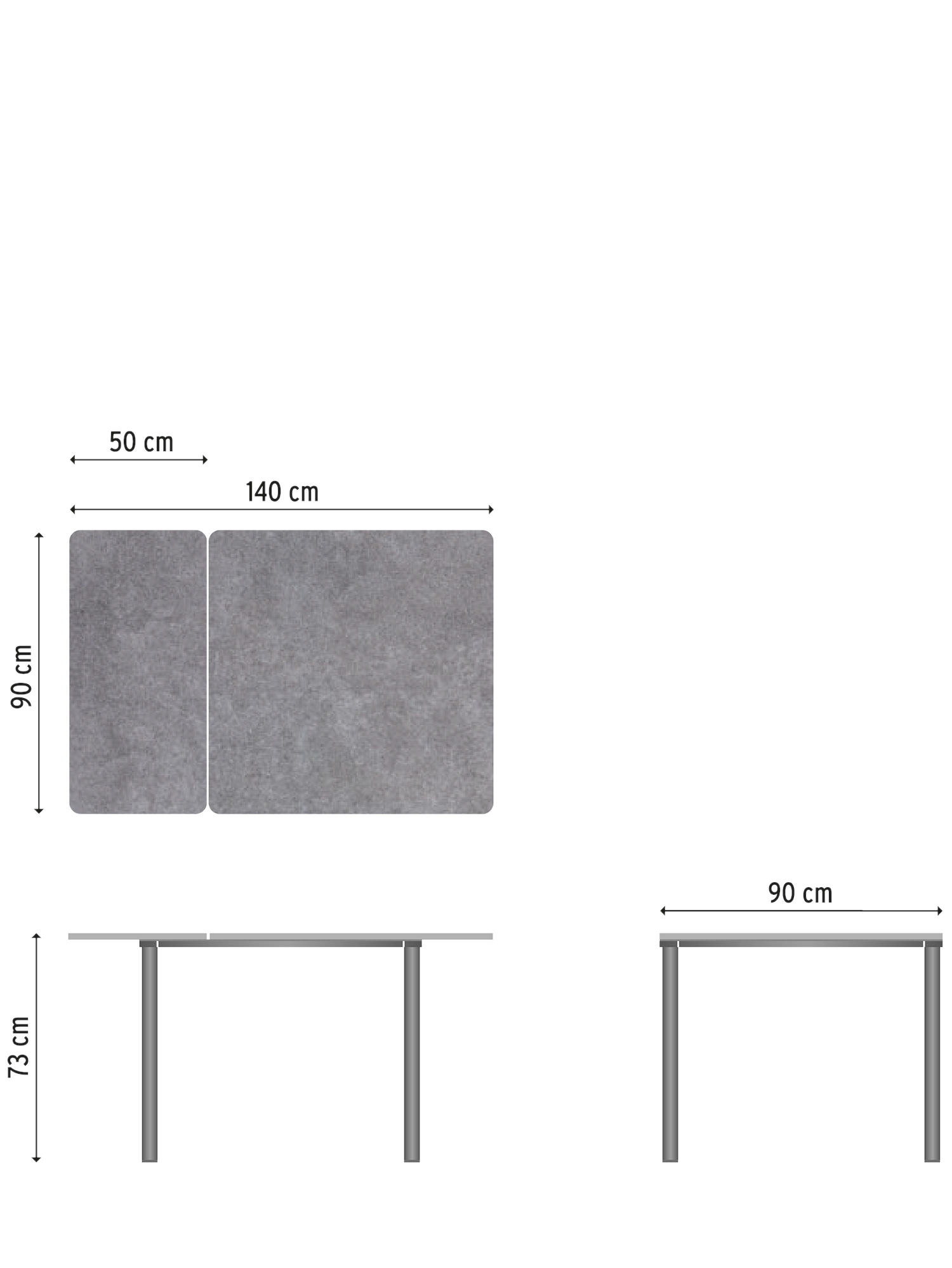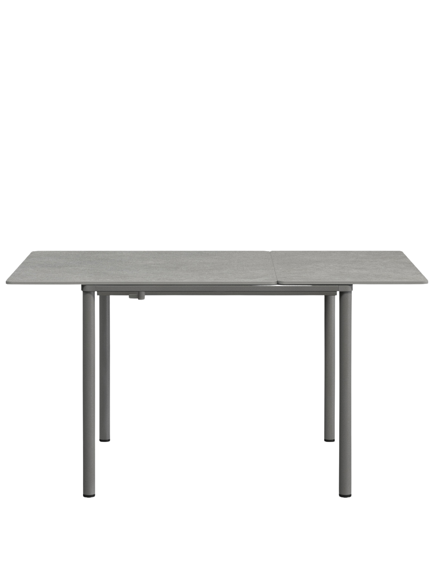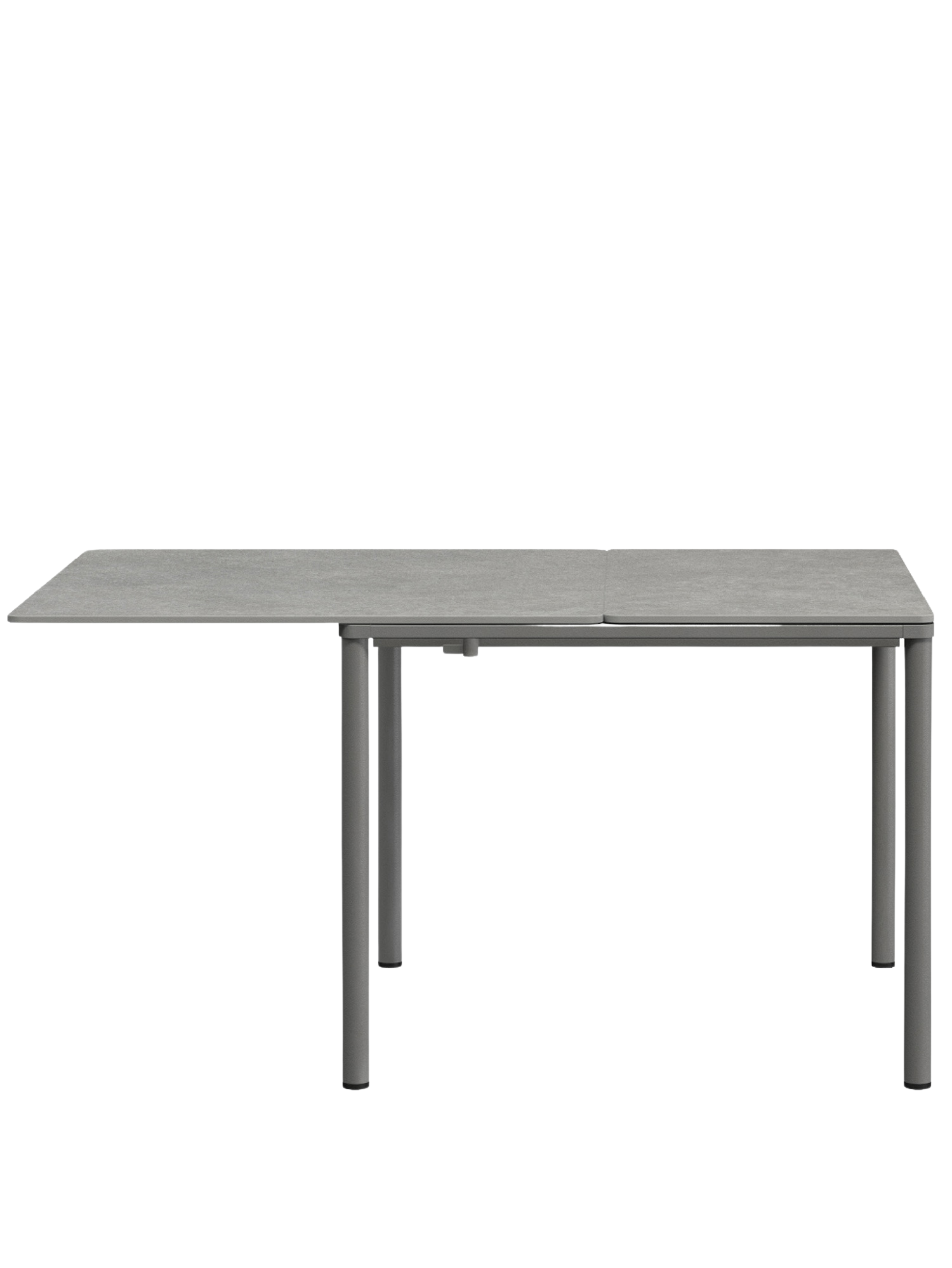 The table tops of the extending versions can be slid out as a whole and elegantly lengthened. The additional section of the middle and large-sized tables is mounted under the table top, the extending section of the small table is stored in a separate bag. The extended top can be centered, or if more leg room is required, positioned to one side.