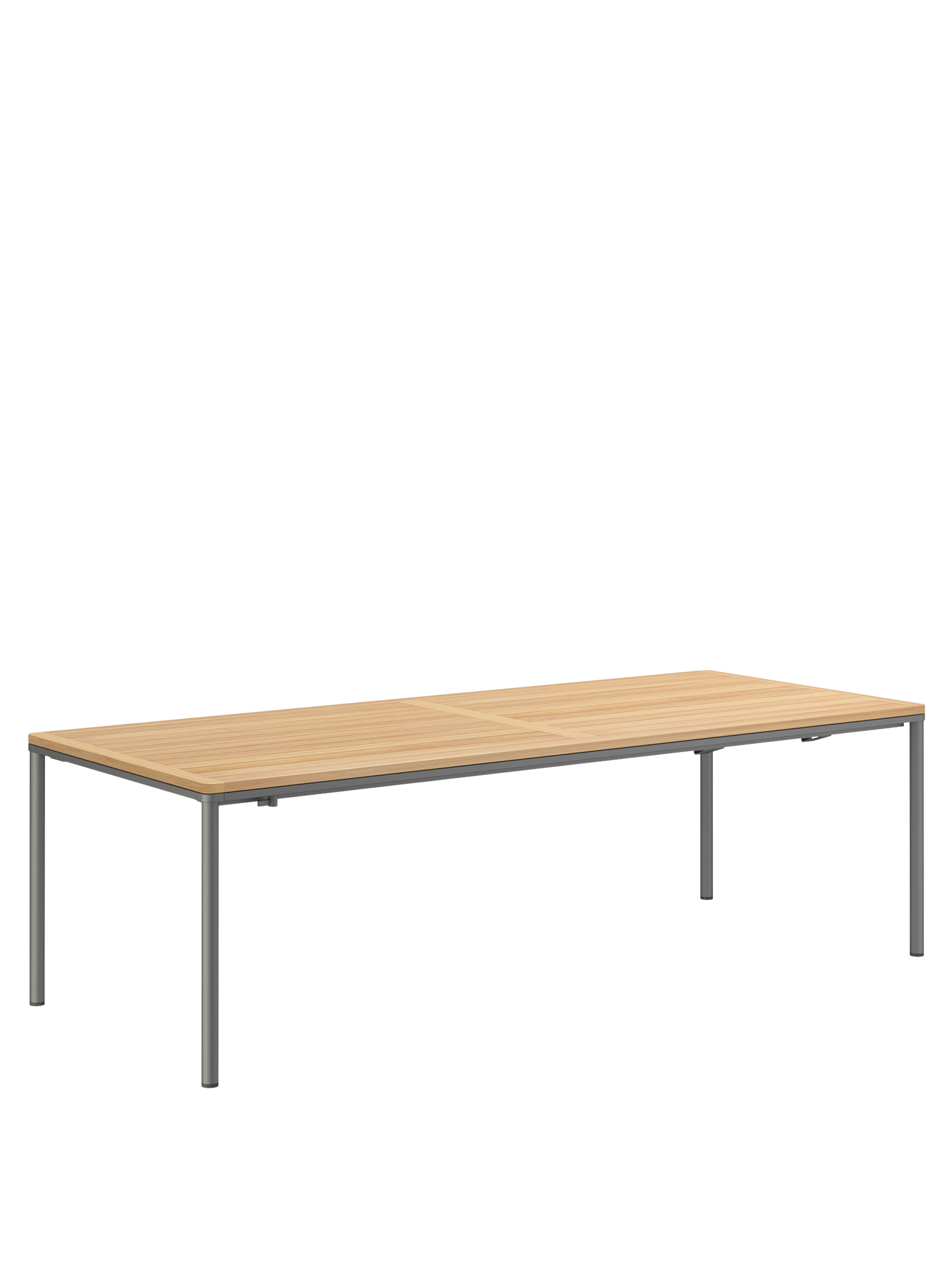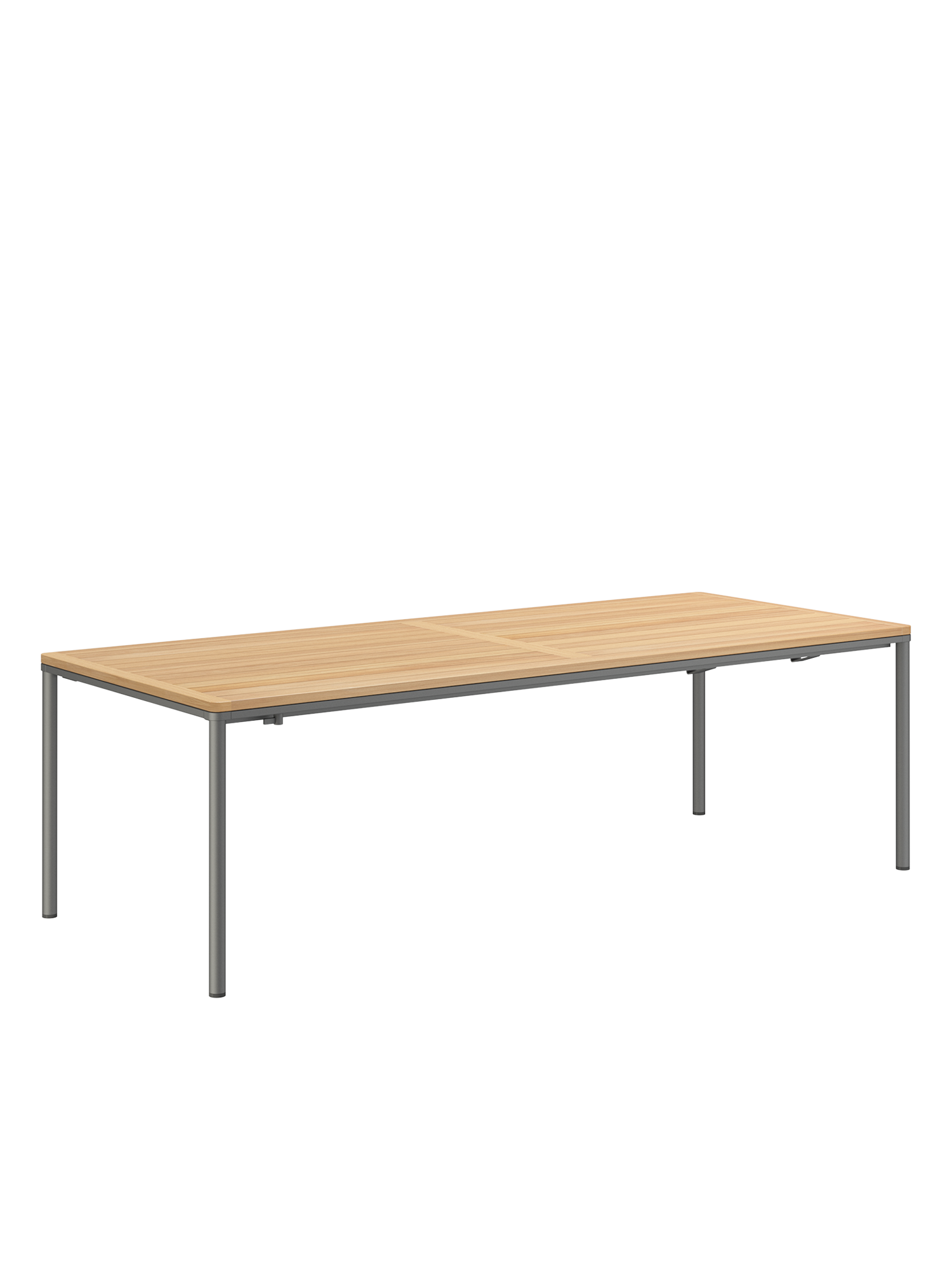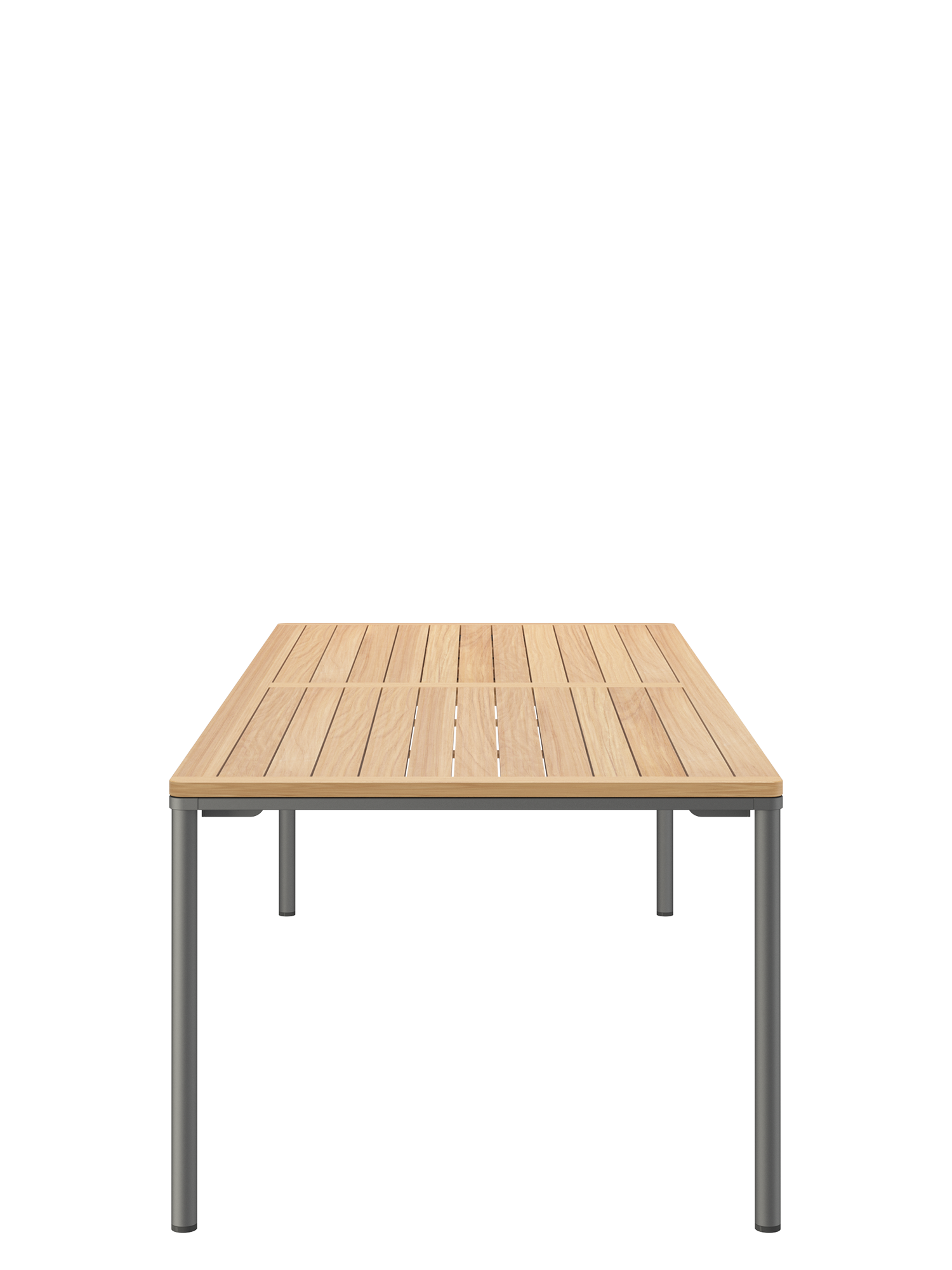 The powder-coated stainless steel frames of the Portland tables allow them to be combined with all chairs of the same material. Four slender legs carry a top with a frame that appears to be made of a single piece, and that follows the rounding of the legs in the corners. The surface is made of high-quality plantation teak.