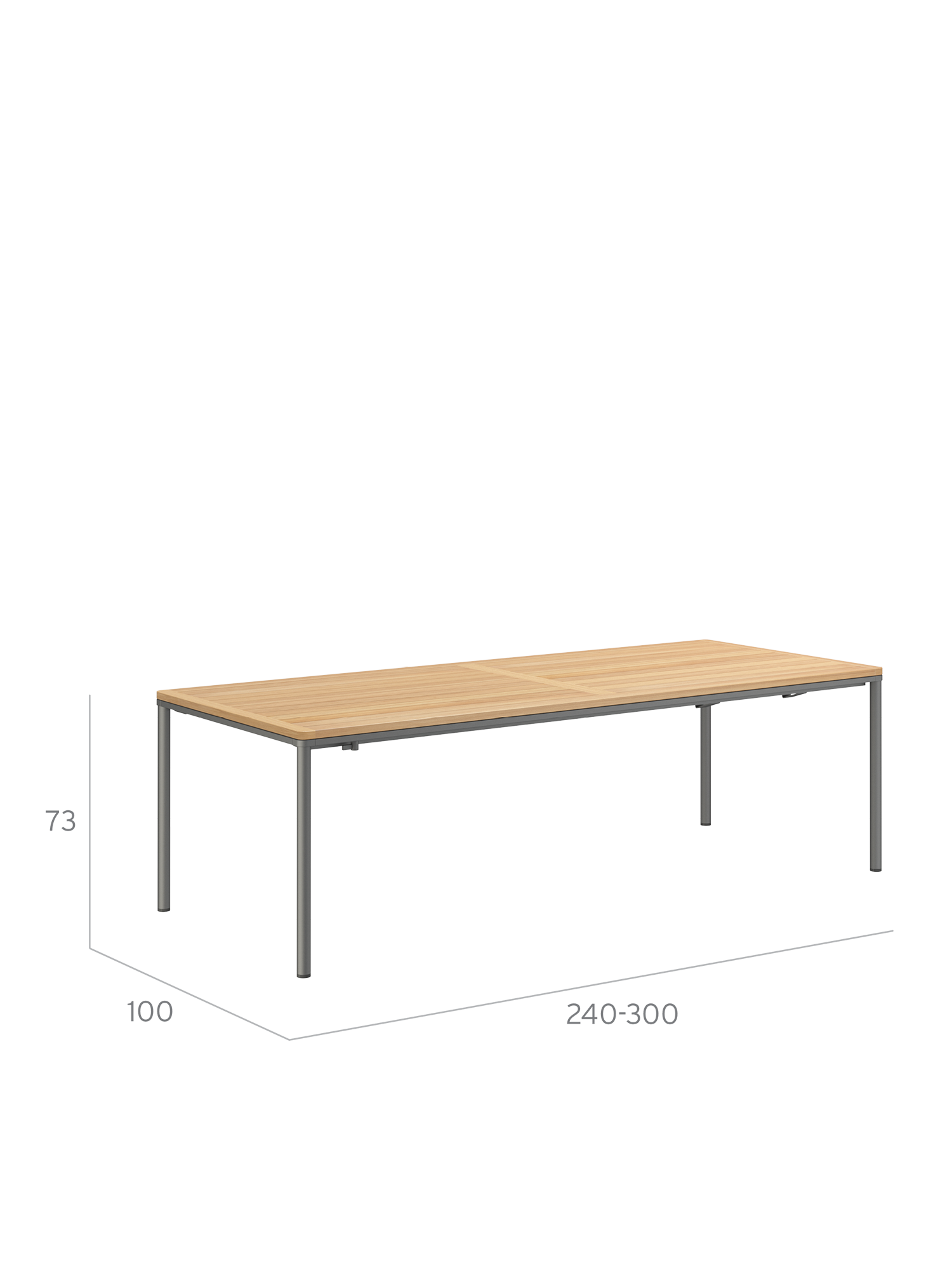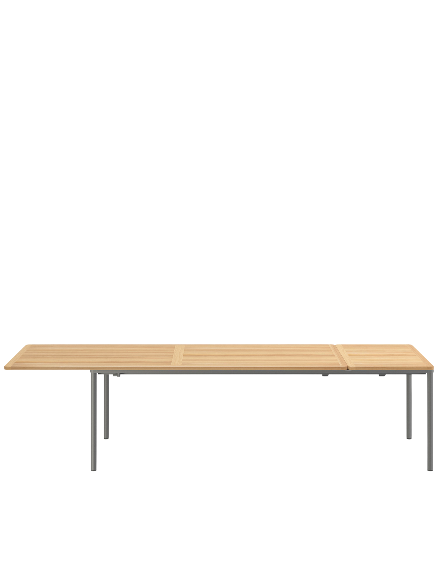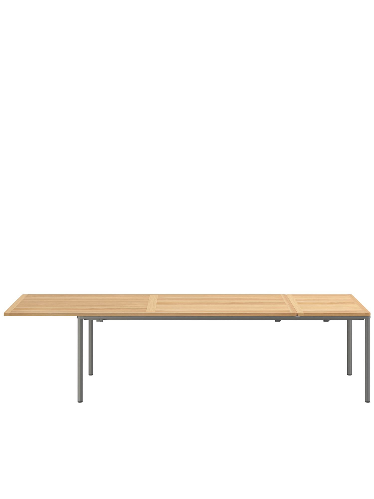 The powder-coated stainless steel frames of the Portland tables allow them to be combined with all chairs of the same material. Four slender legs carry a top with a frame that appears to be made of a single piece, and that follows the rounding of the legs in the corners. The surface is made of high-quality plantation teak.
