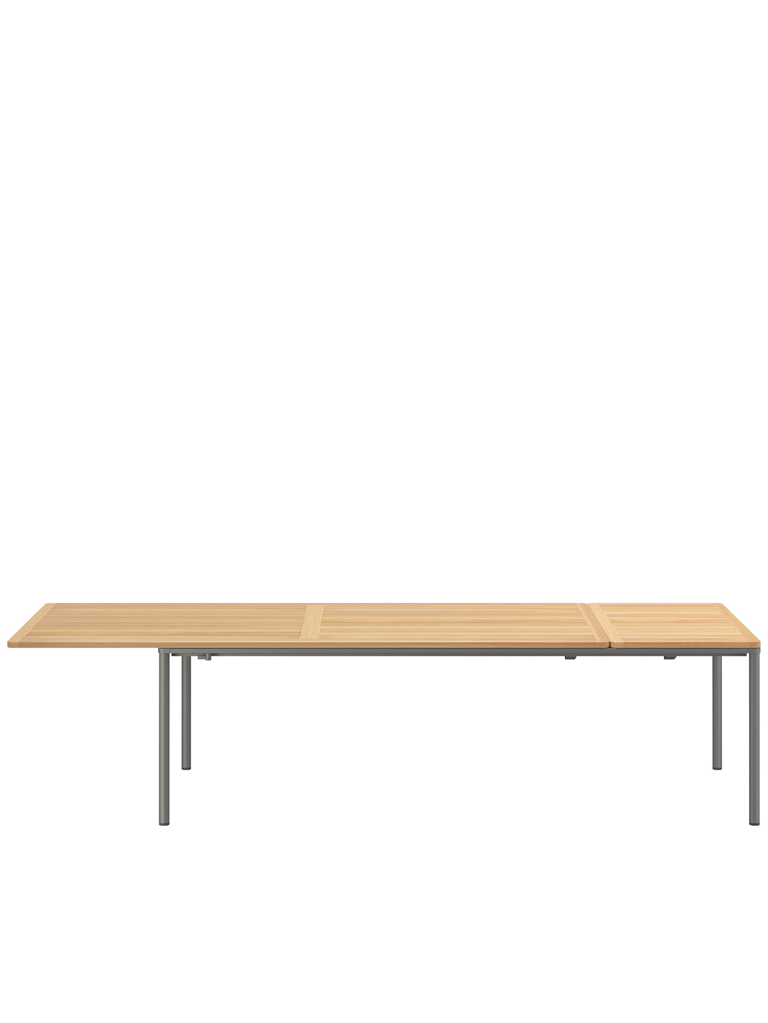 The top of the extending table, under which the additional section is mounted, can be slid out as a whole and augmented.