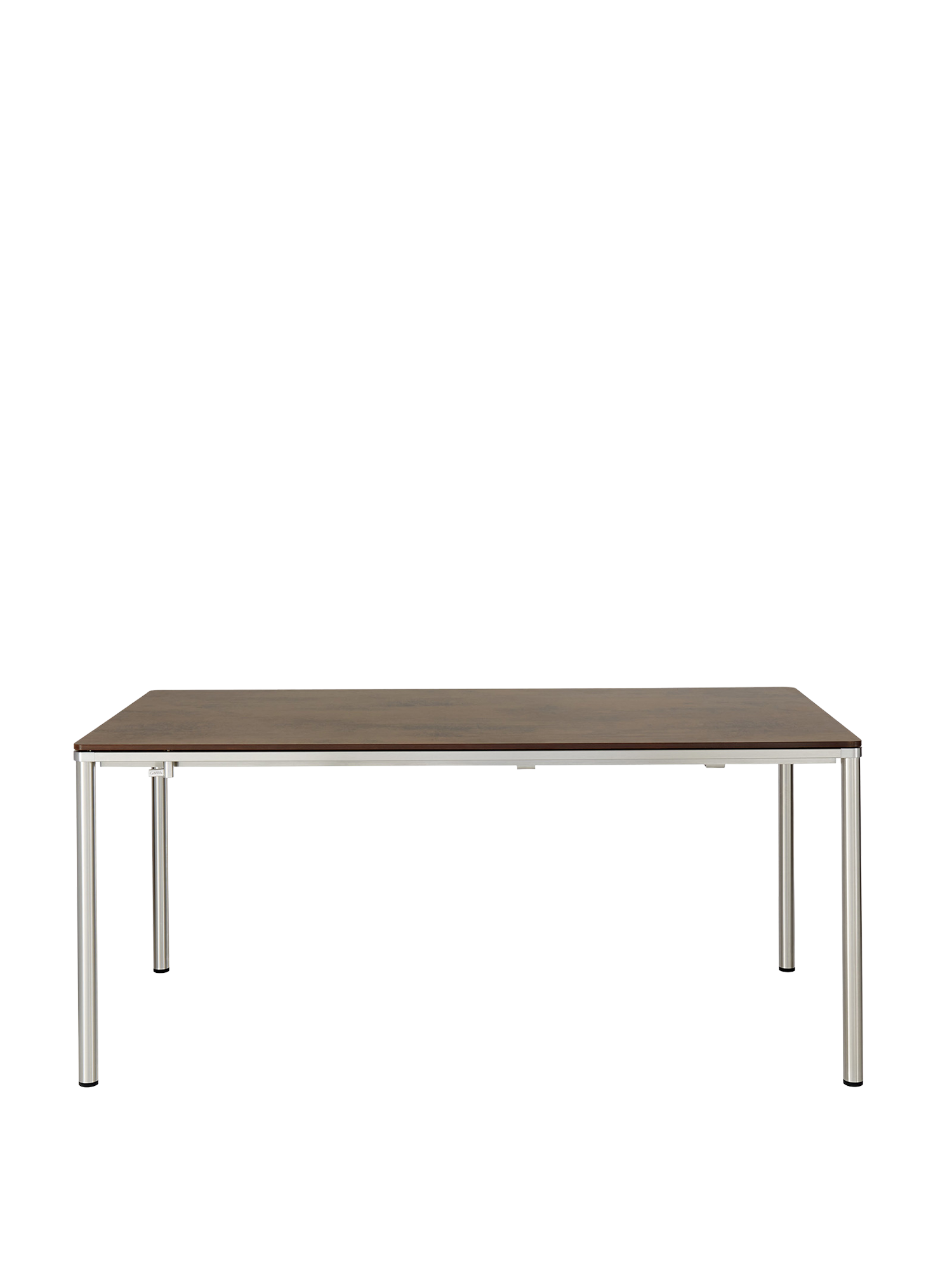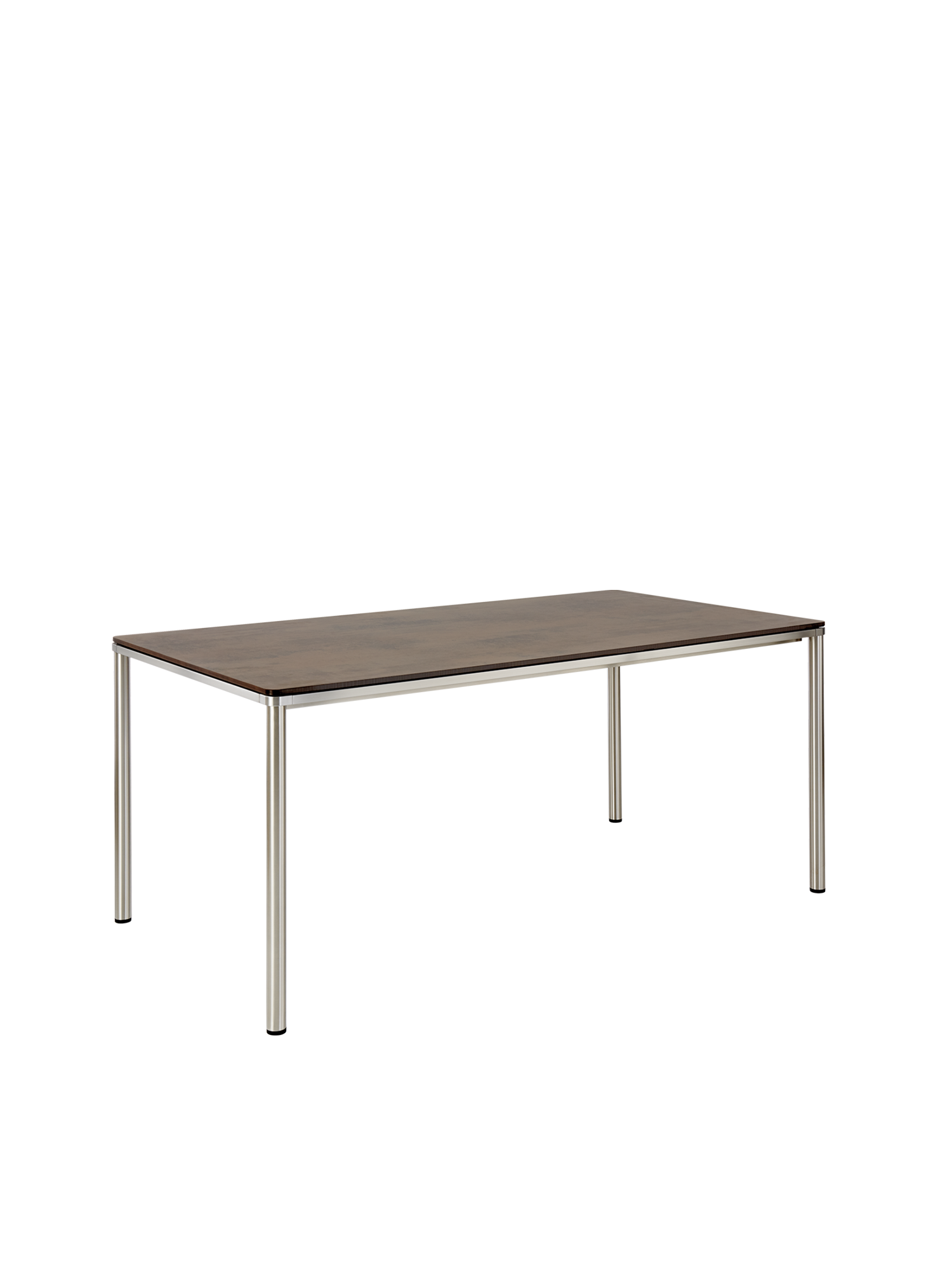 The stainless steel frames of the Portland tables allow them to be combined with all chairs of the same material. Four slender legs carry a top with a frame that appears to be made of a single piece, and that follows the rounding of the legs in the corners. The surface is made of high-quality synthetic resin reminiscent of weathered iron.