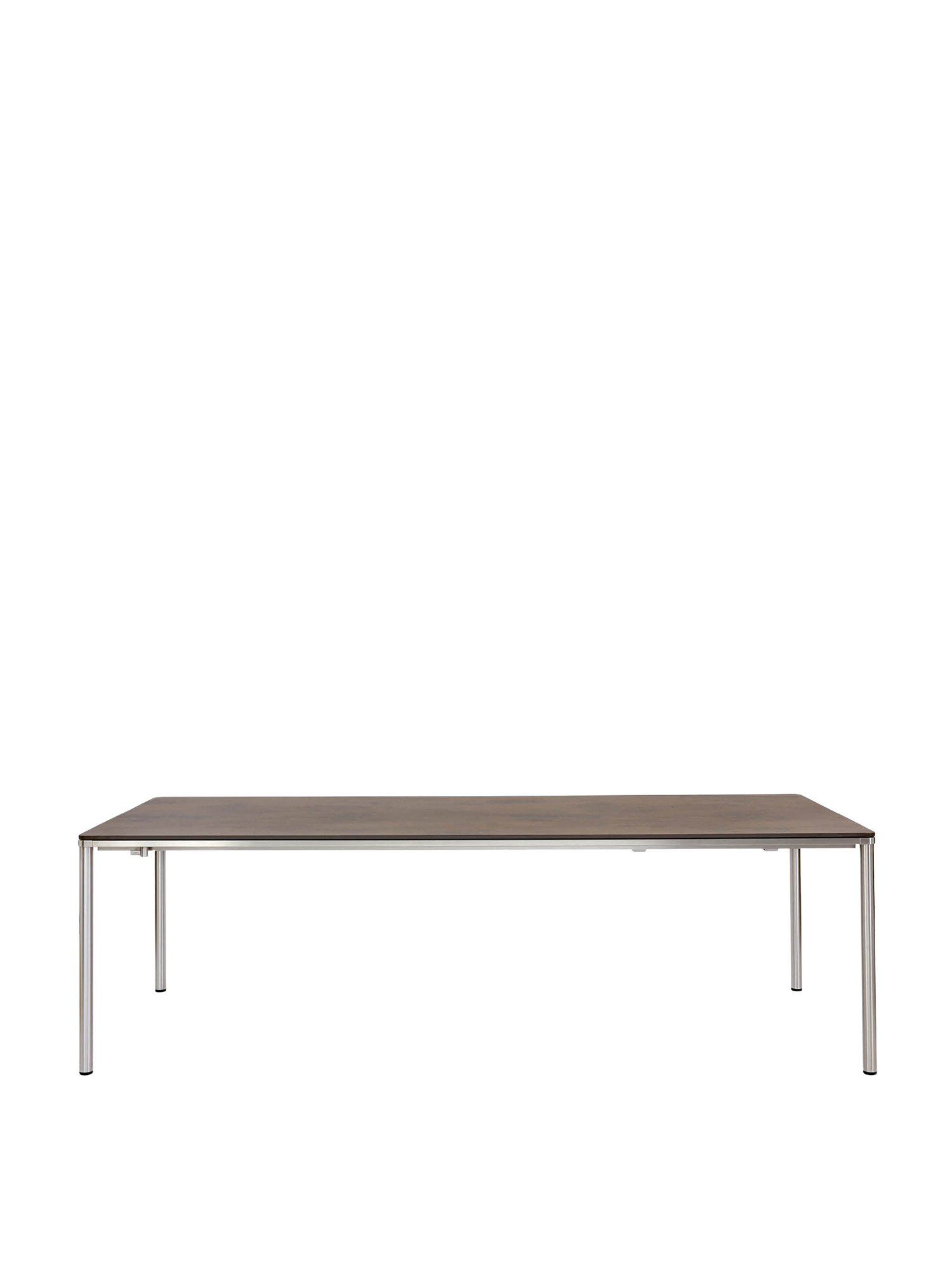 The stainless steel frames of the Portland tables allow them to be combined with all chairs of the same material. Four slender legs carry a top with a frame that appears to be made of a single piece, and that follows the rounding of the legs in the corners. The surface is made of high-quality synthetic resin reminiscent of weathered iron.