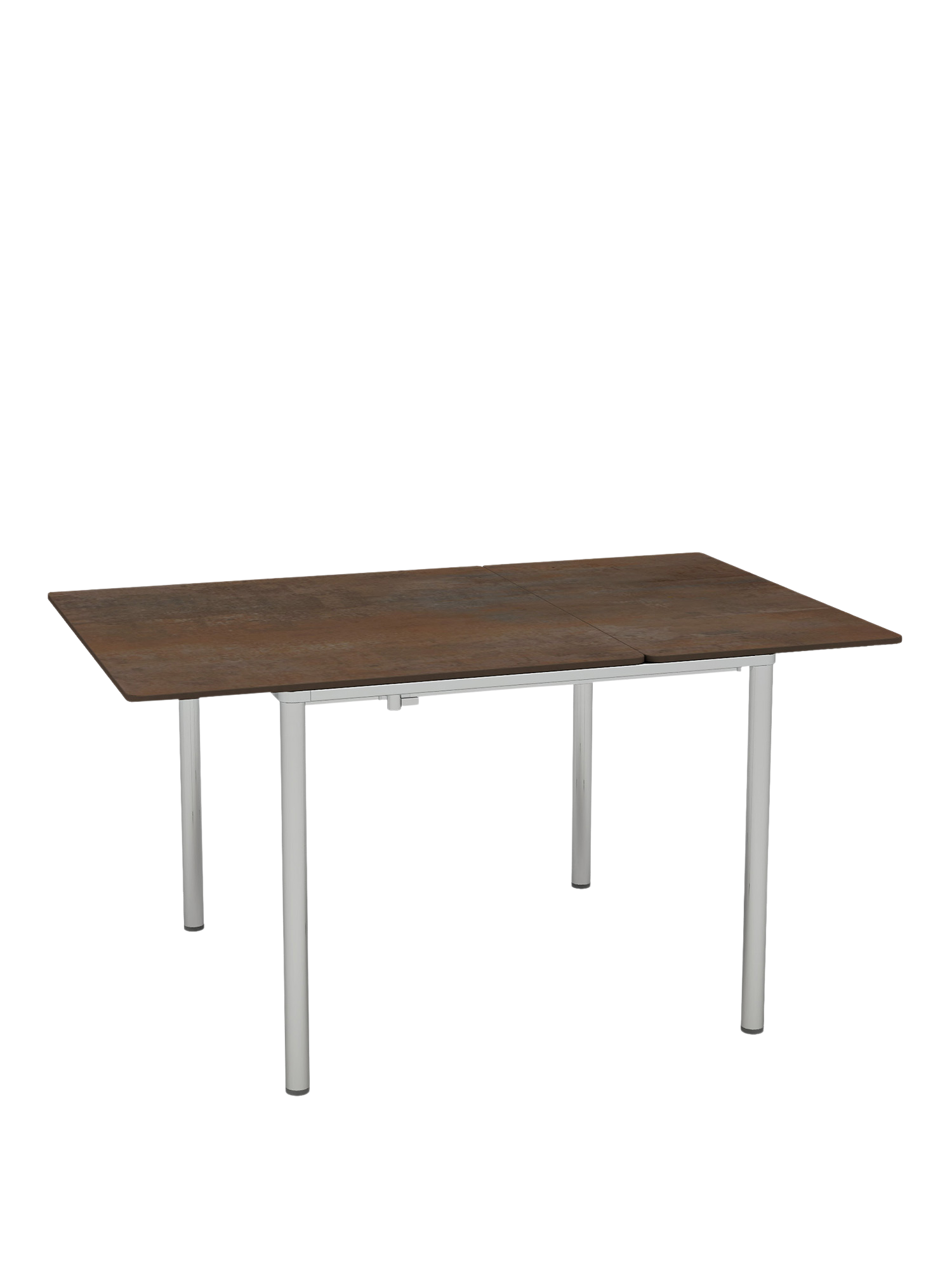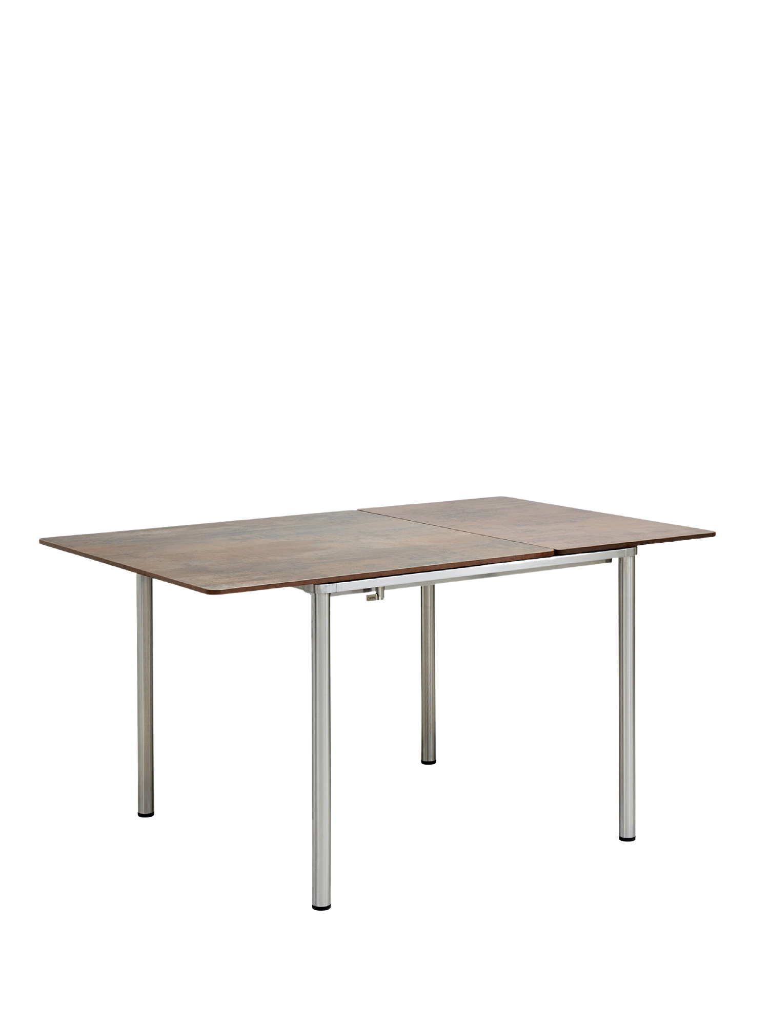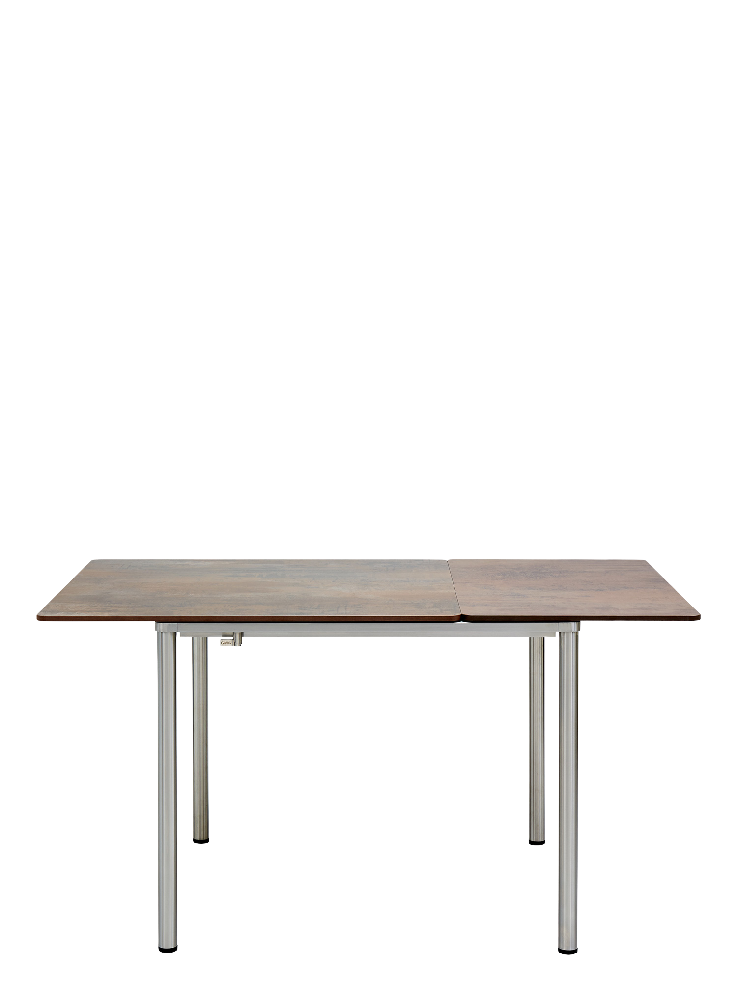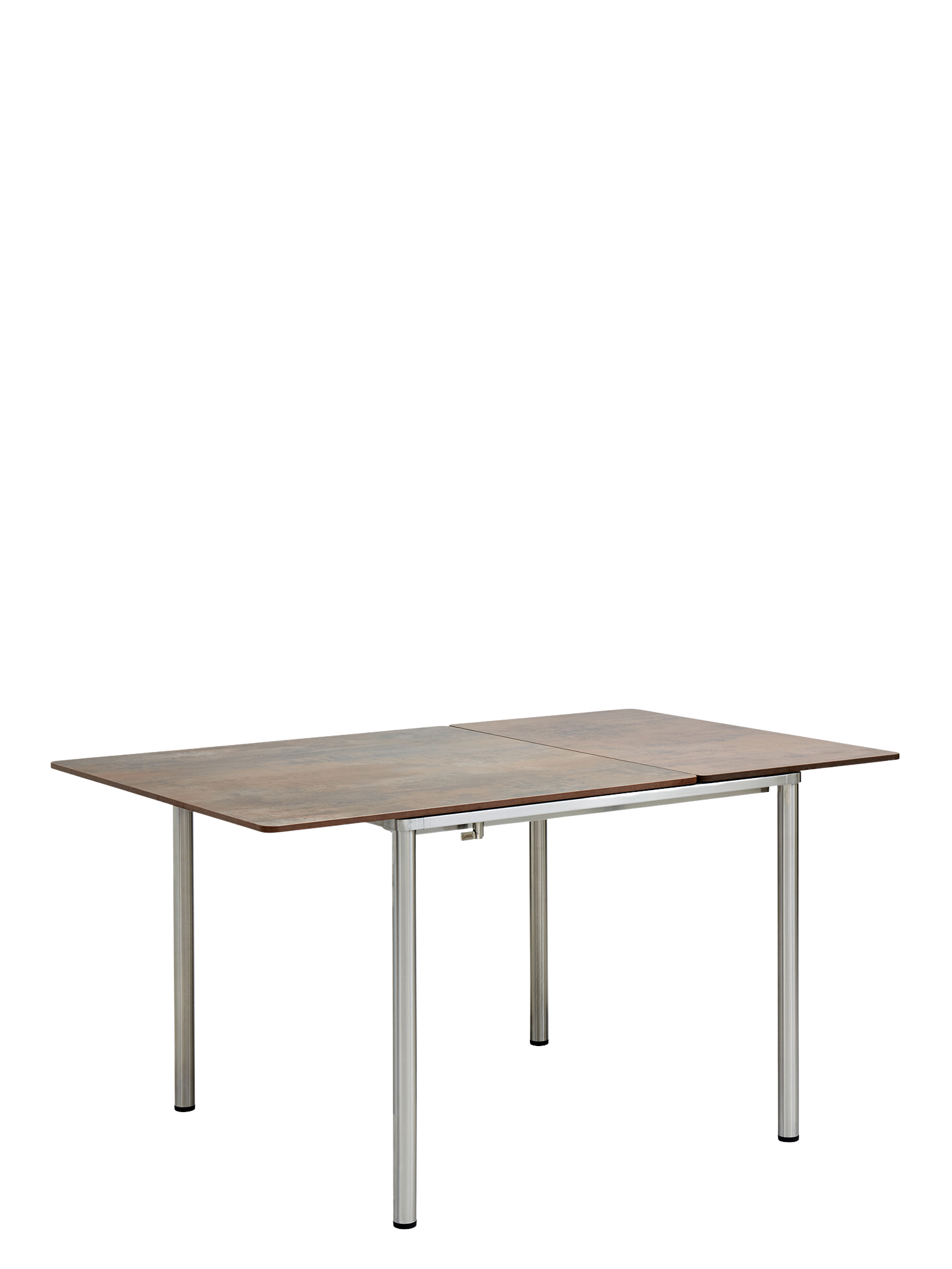 The table tops of the extending versions can be slid out as a whole and elegantly lengthened. The additional section of the middle and large-sized tables is mounted under the table top, the extending section of the small table is stored in a separate bag. The extended top can be centered, or if more leg room is required, positioned to one side.