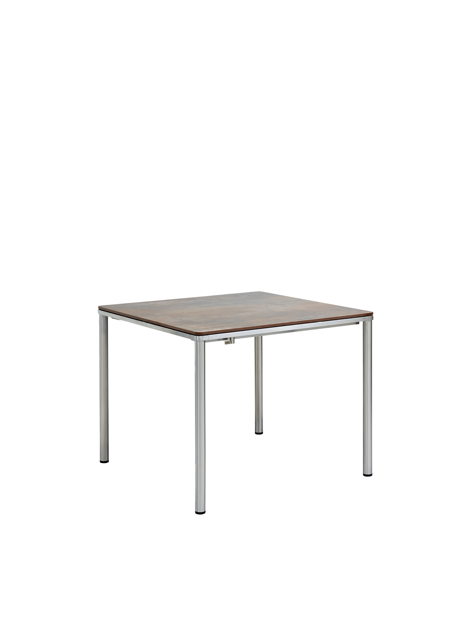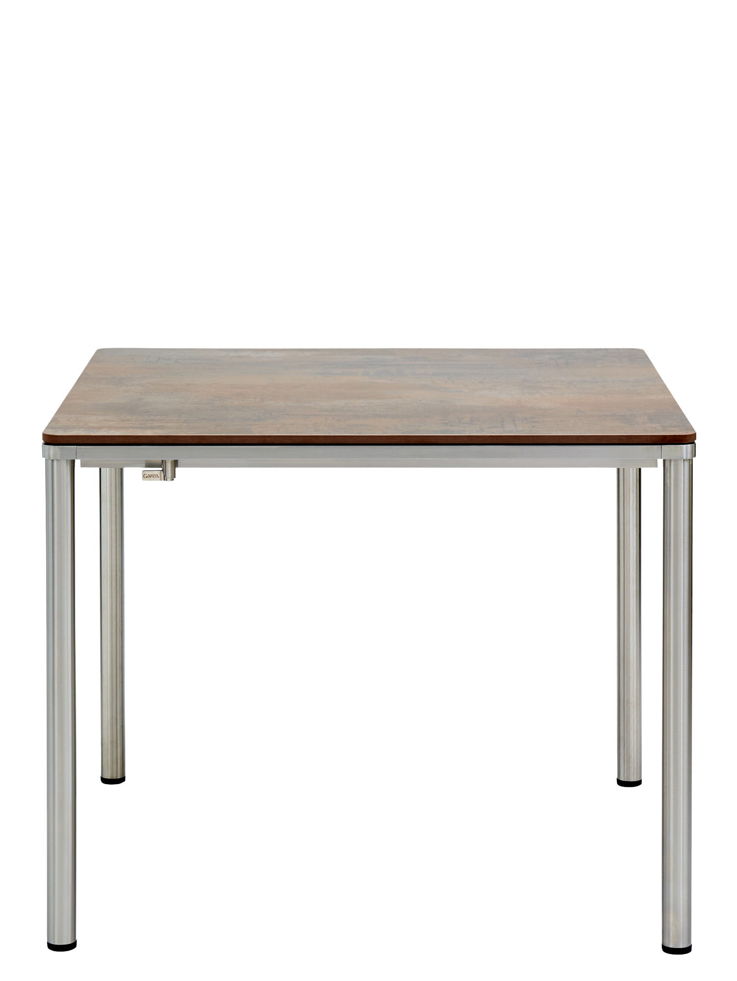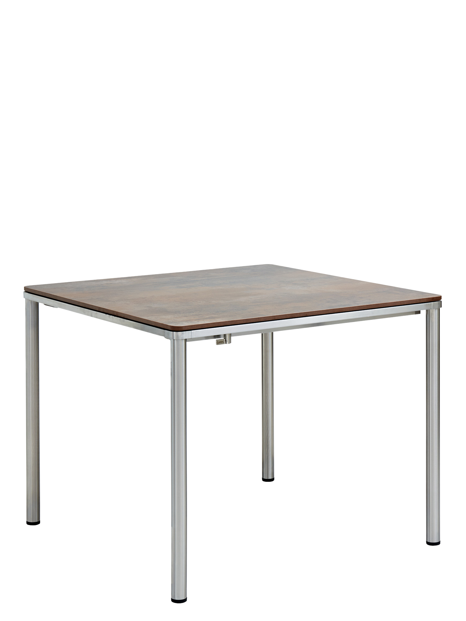 The stainless steel frame of the Portland tables combines this model with all chairs made of the same material. Four slender legs bear a table top that appears to be cast from the same piece of stainless steel as the frame underneath and that curves at the corners to echo the rounding of the legs. The table top is made of weather-resistant resin with a patinated appearance that is reminiscent of weathered steel or rusted iron.