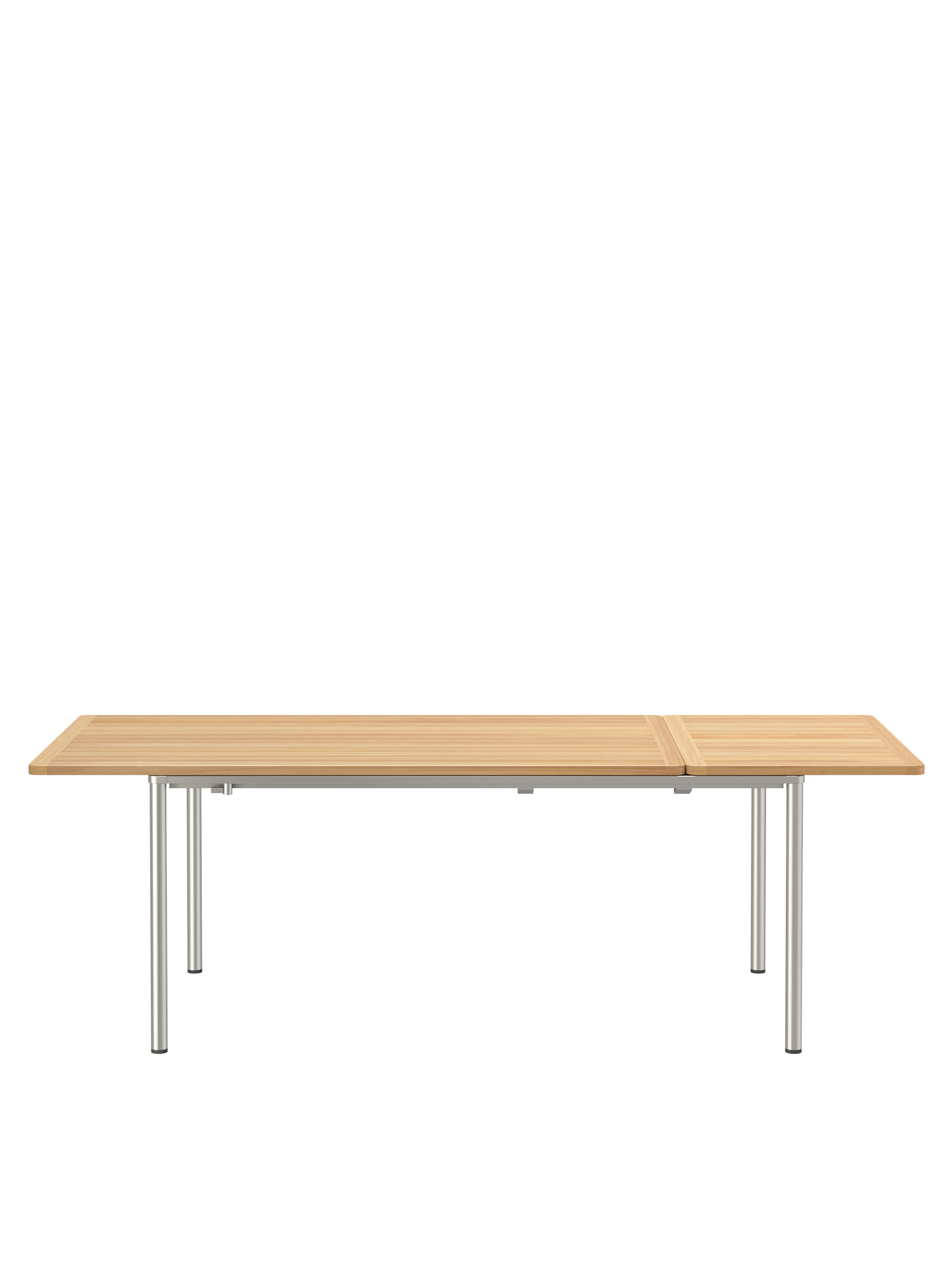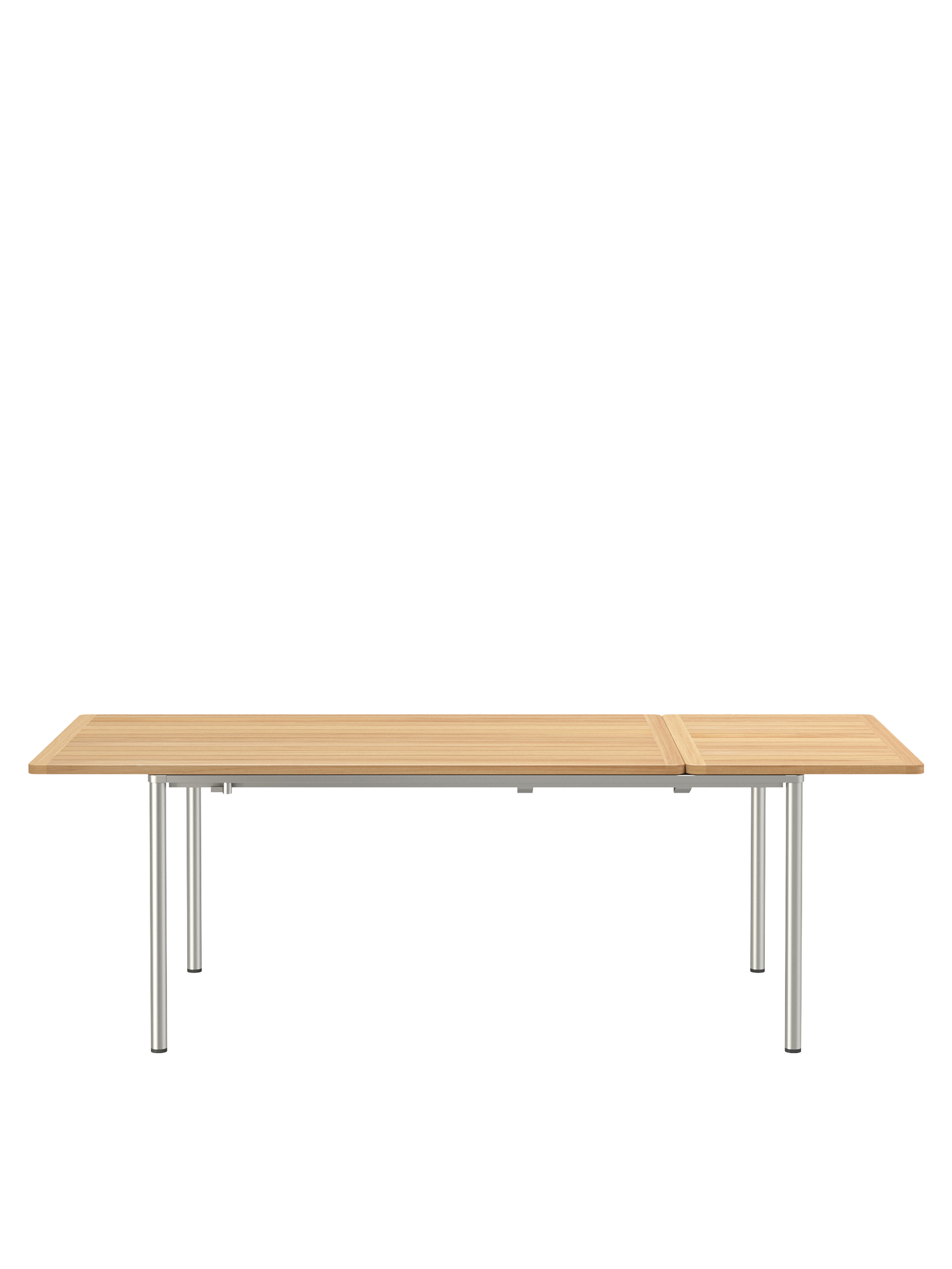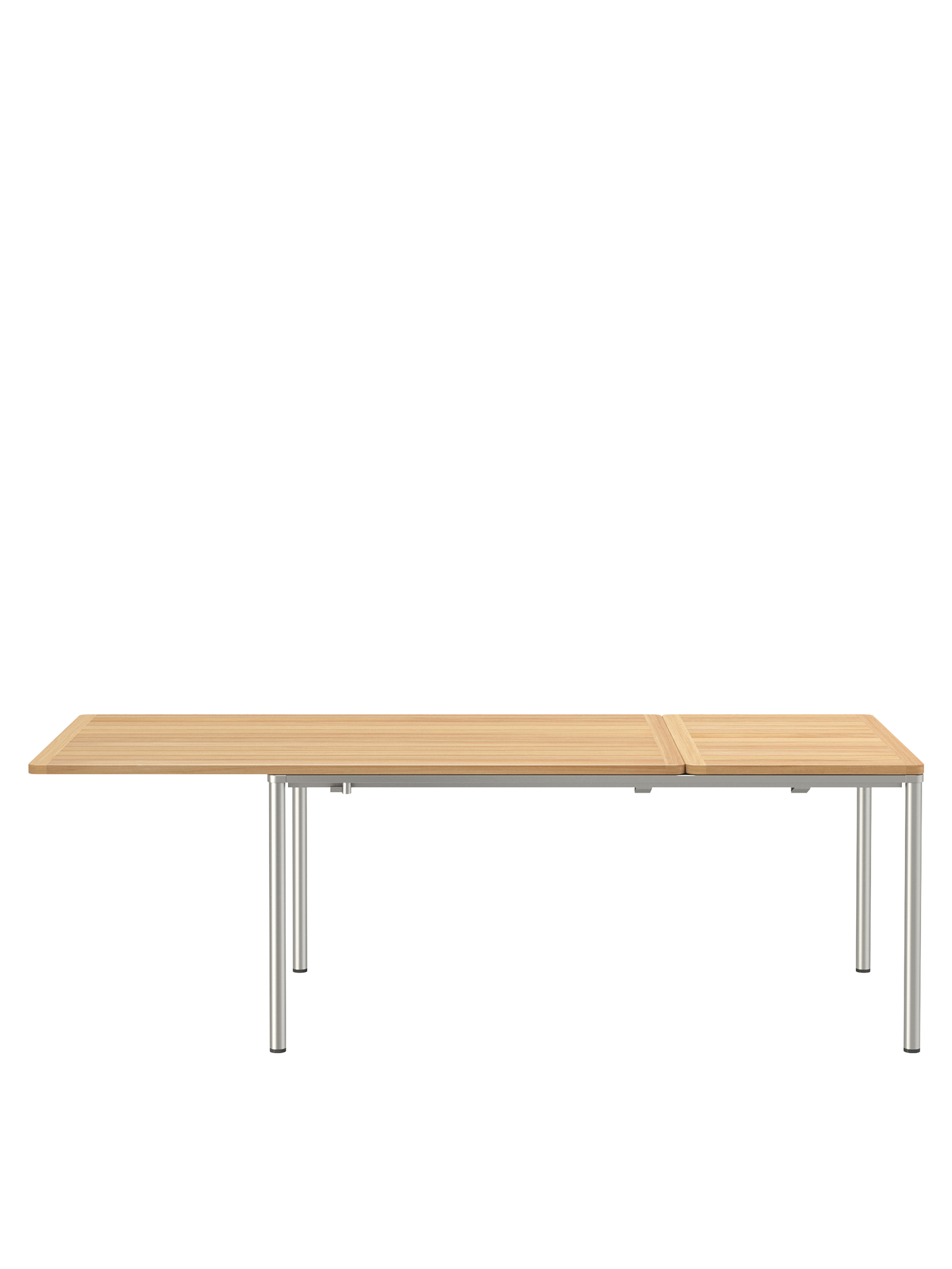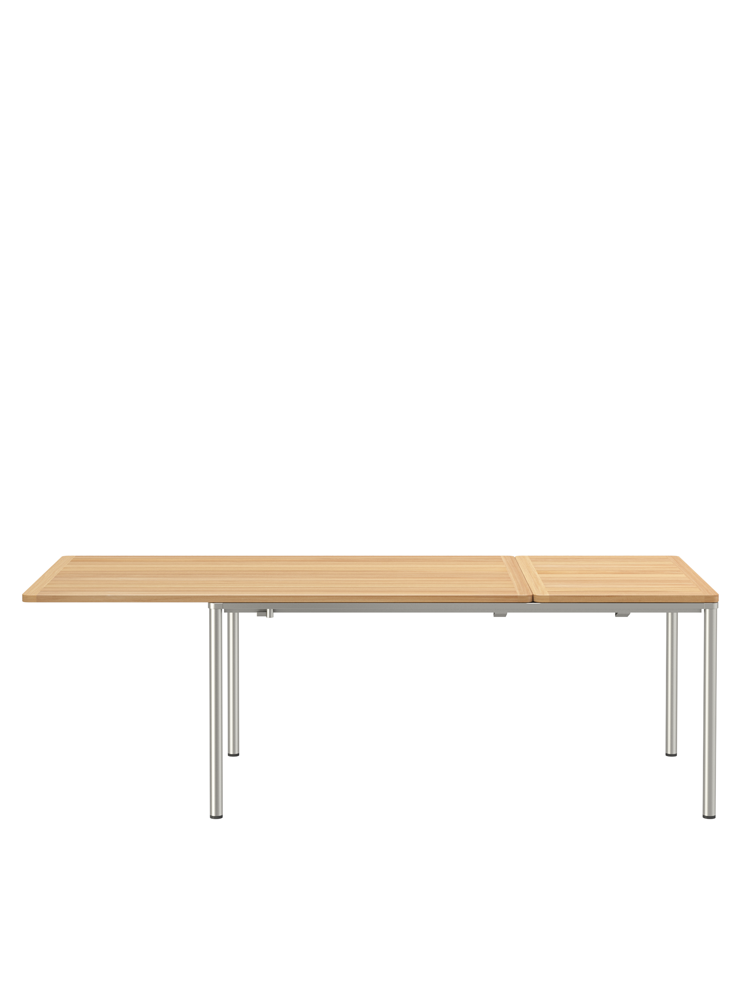 The table tops of the extending versions can be slid out as a whole and elegantly lengthened. The additional section of the middle and large-sized tables is mounted under the table top, the extending section of the small table is stored in a separate bag. The extended top can be centered, or if more leg room is required, positioned to one side.