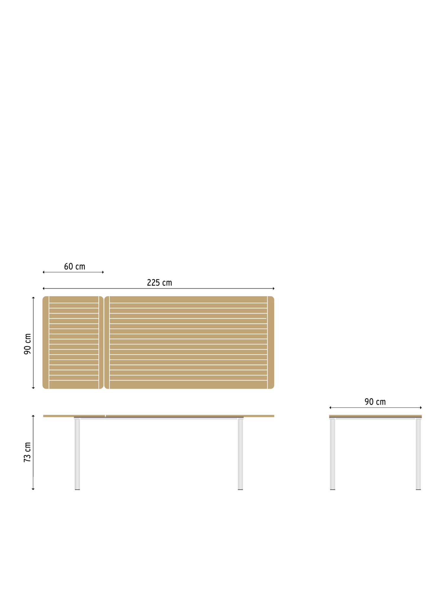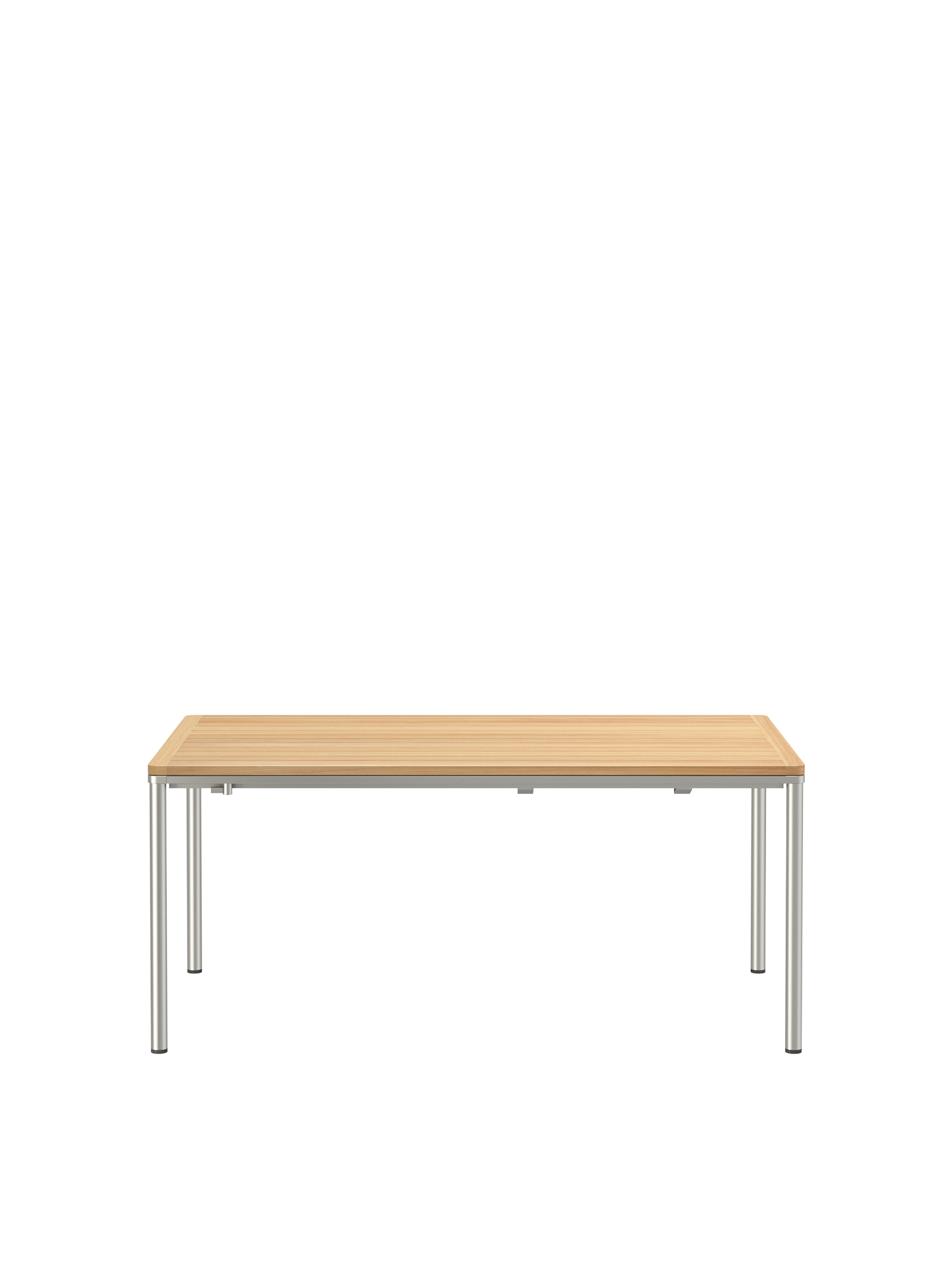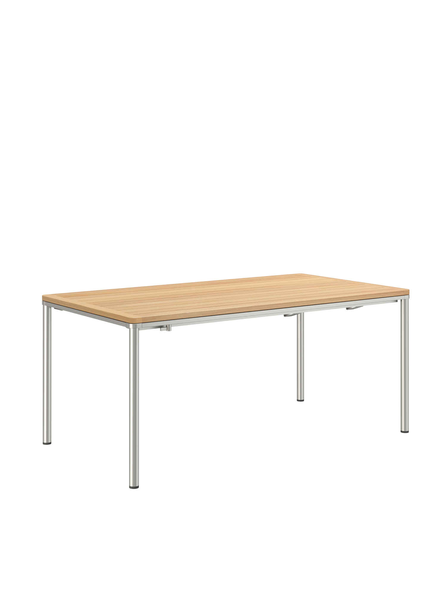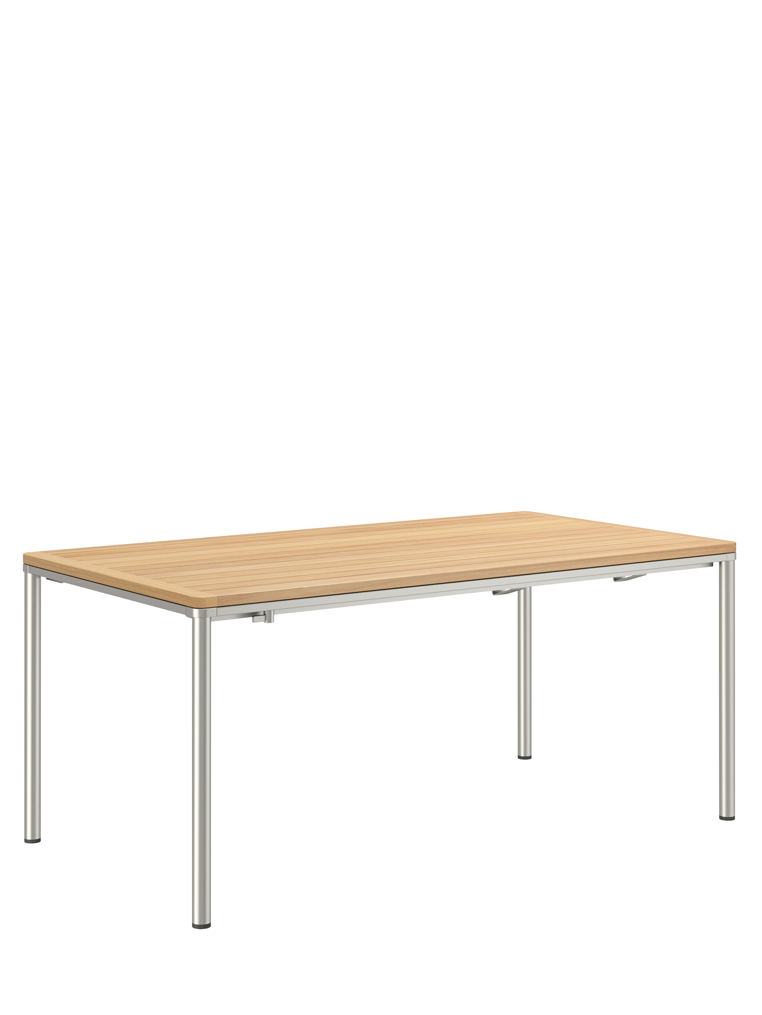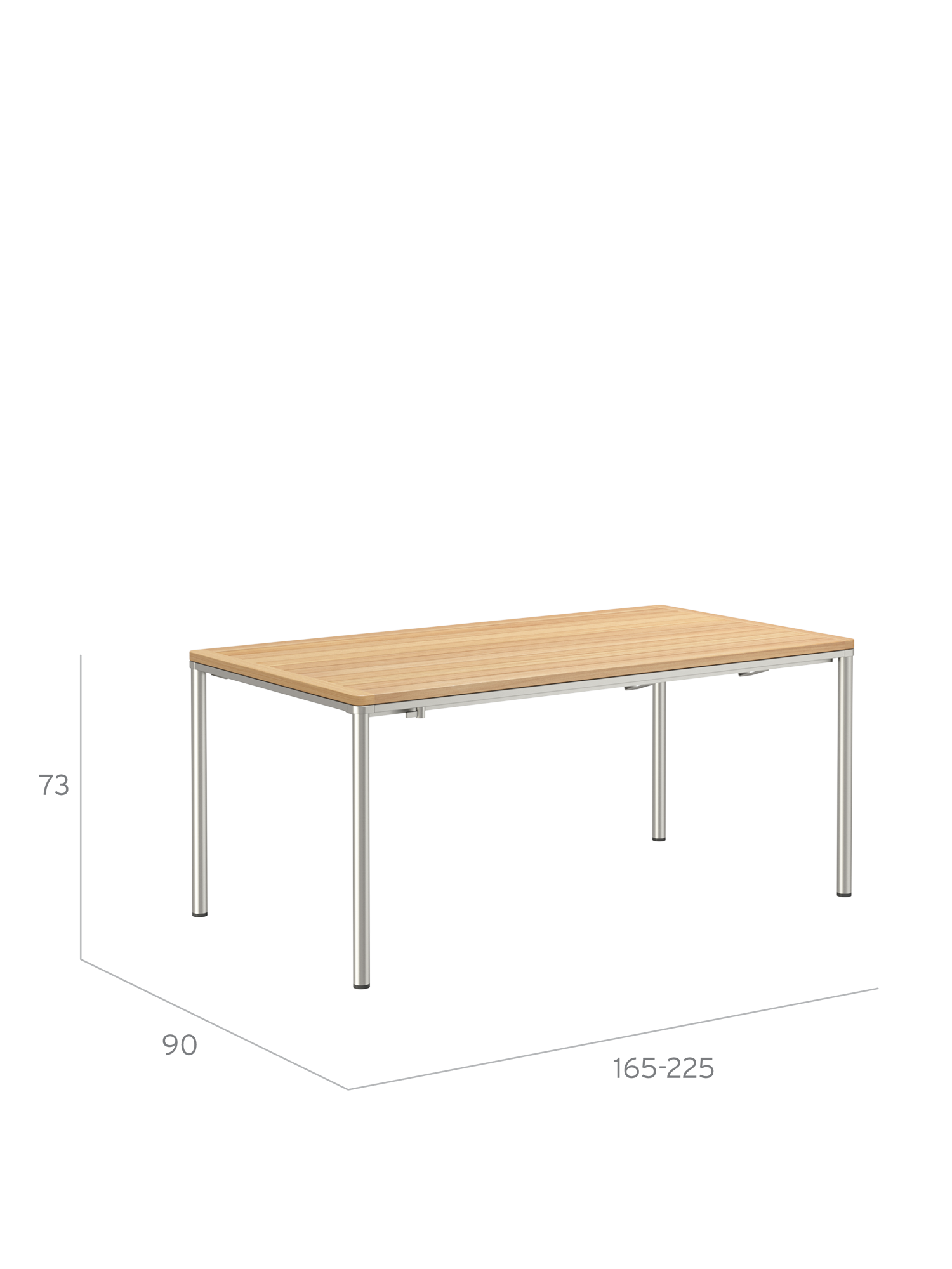 The table tops of the extending versions can be slid out as a whole and elegantly lengthened. The additional section of the middle and large-sized tables is mounted under the table top, the extending section of the small table is stored in a separate bag. The extended top can be centered, or if more leg room is required, positioned to one side.