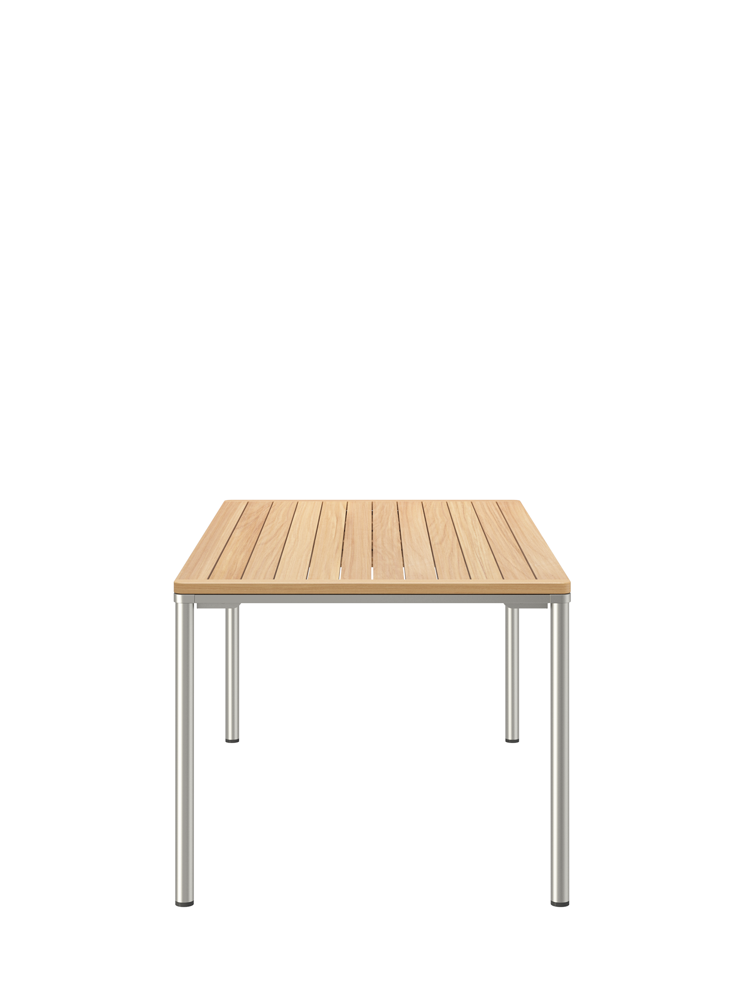 The stainless steel frame of the Portland tables combines this with all chairs made of the same material. Four slender legs bear a table top that appears to be cast from the same piece of stainless steel as the frame underneath and that curves at the corners to echo the rounding of the legs. The table top is made of teak and lends the table a natural warmth.