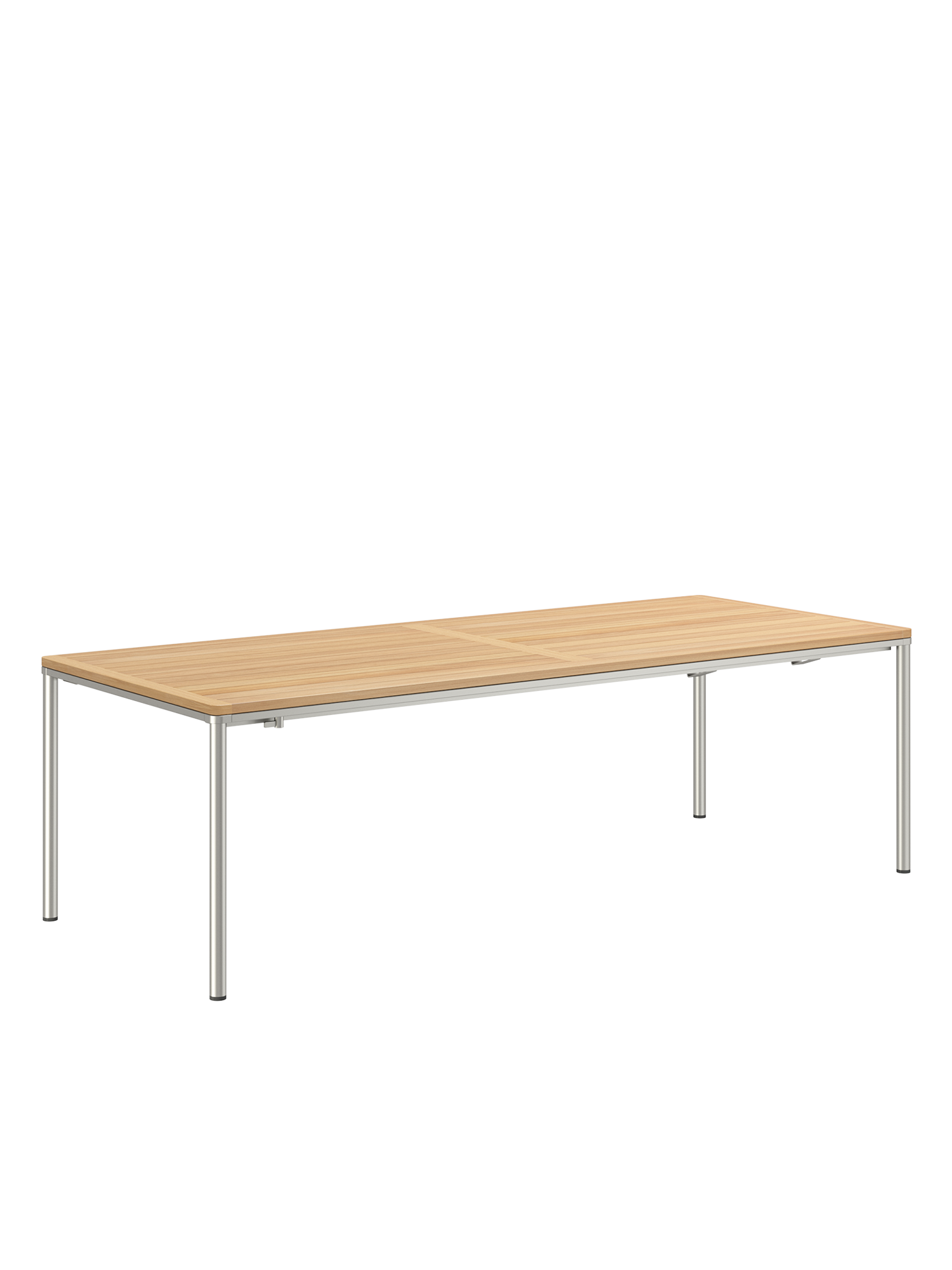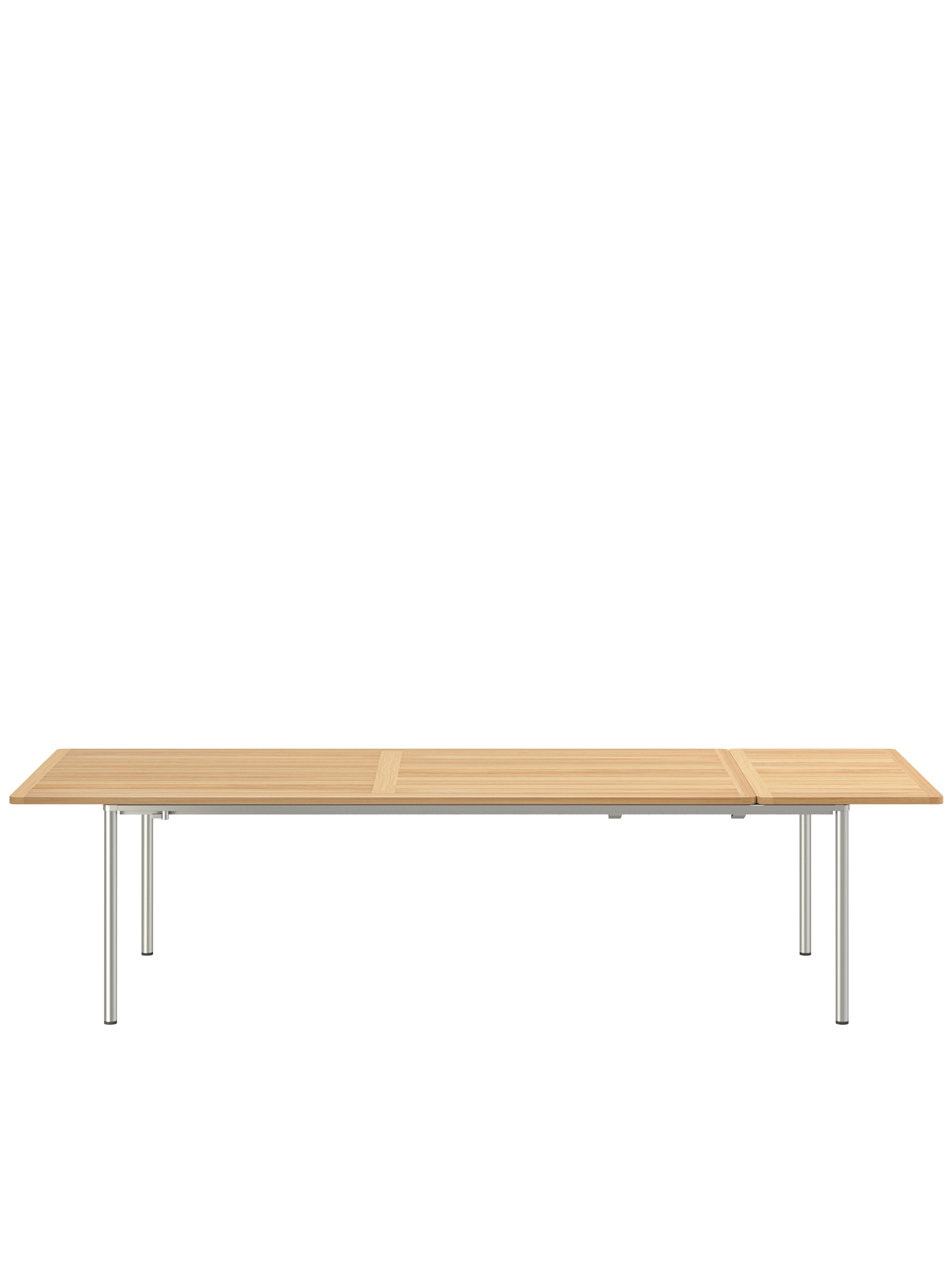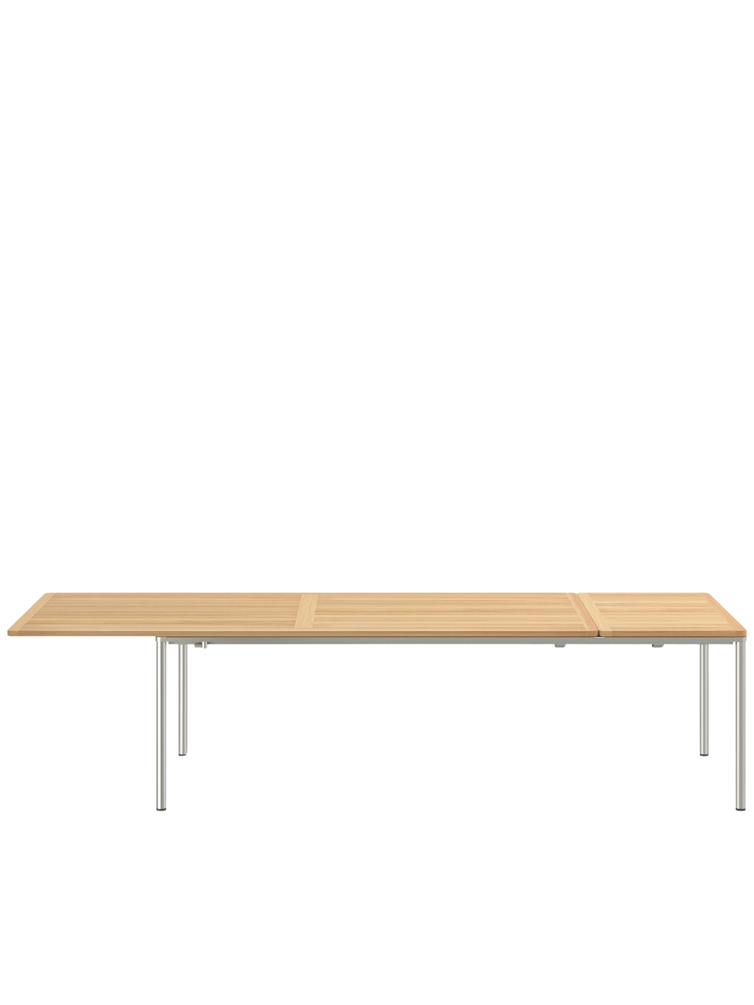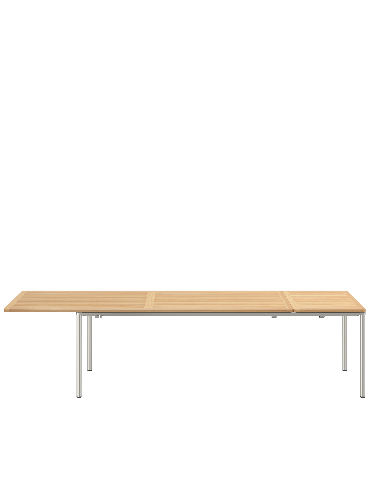 The table tops of the extending versions can be slid out as a whole and elegantly lengthened. The additional section of the middle and large-sized tables is mounted under the table top, the extending section of the small table is stored in a separate bag. The extended top can be centered, or if more leg room is required, positioned to one side.