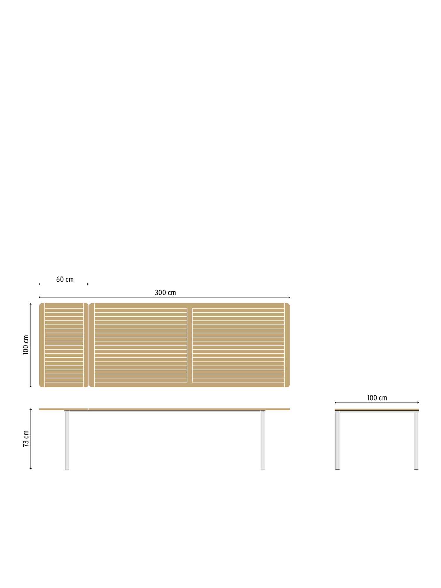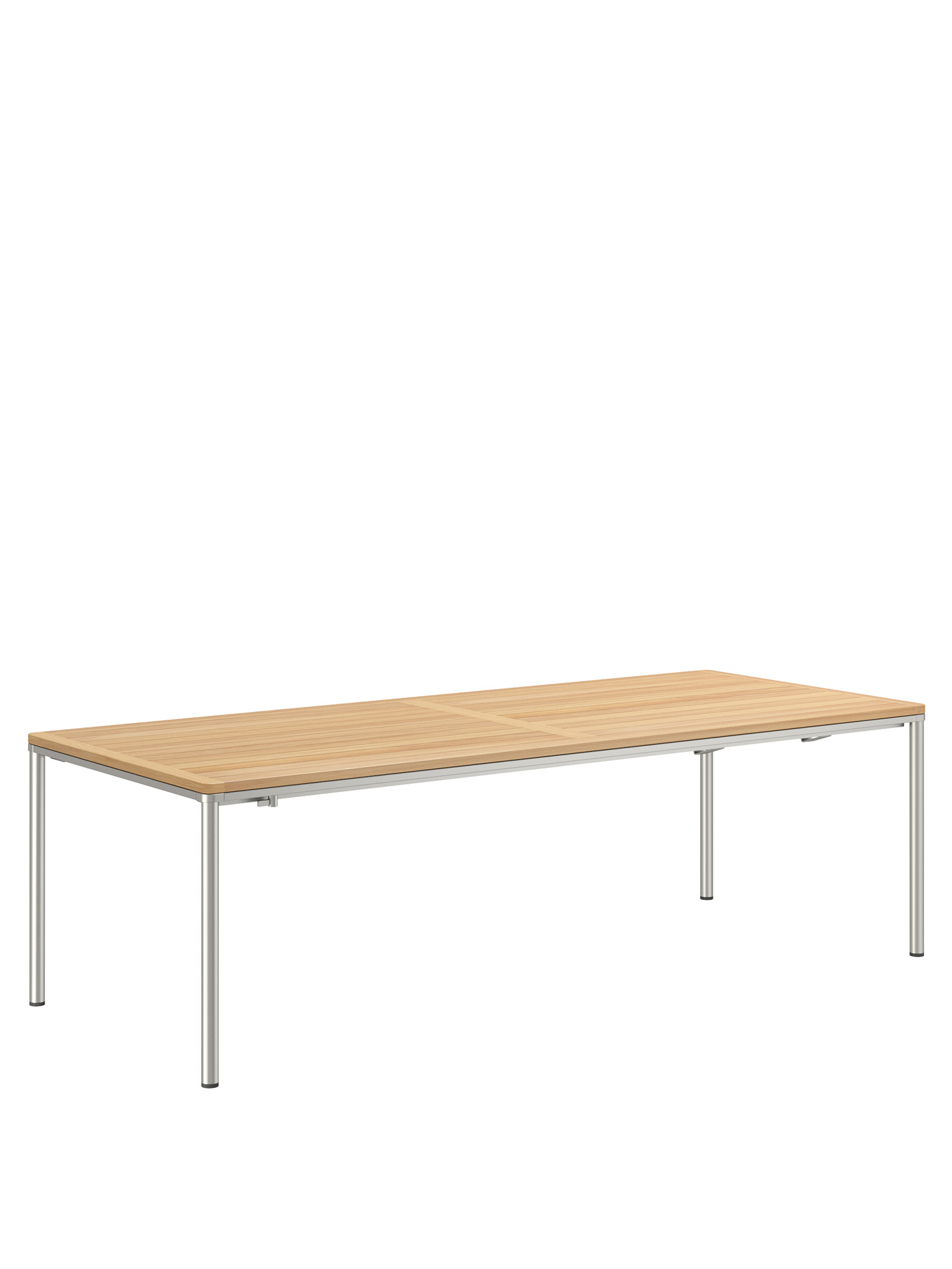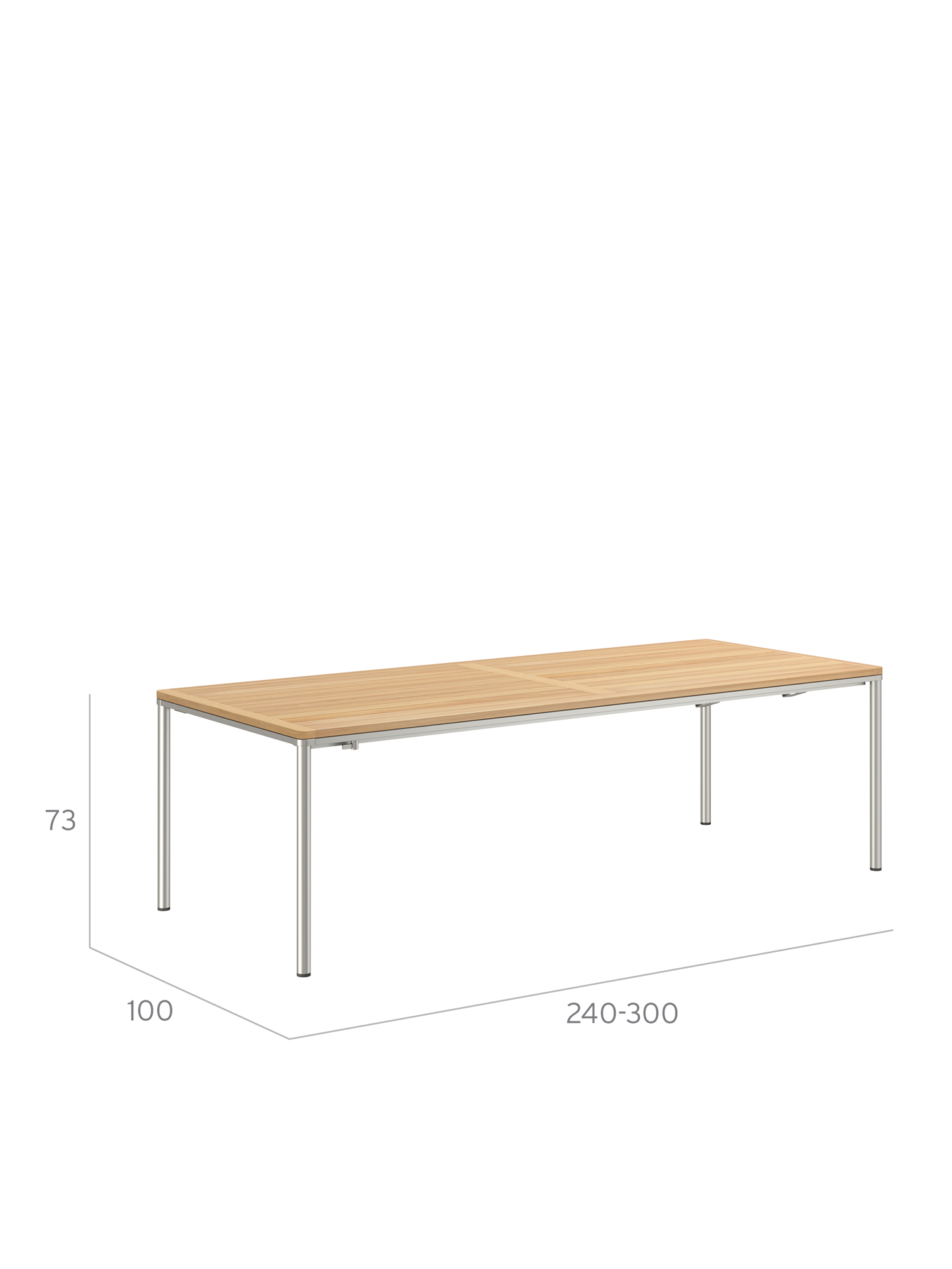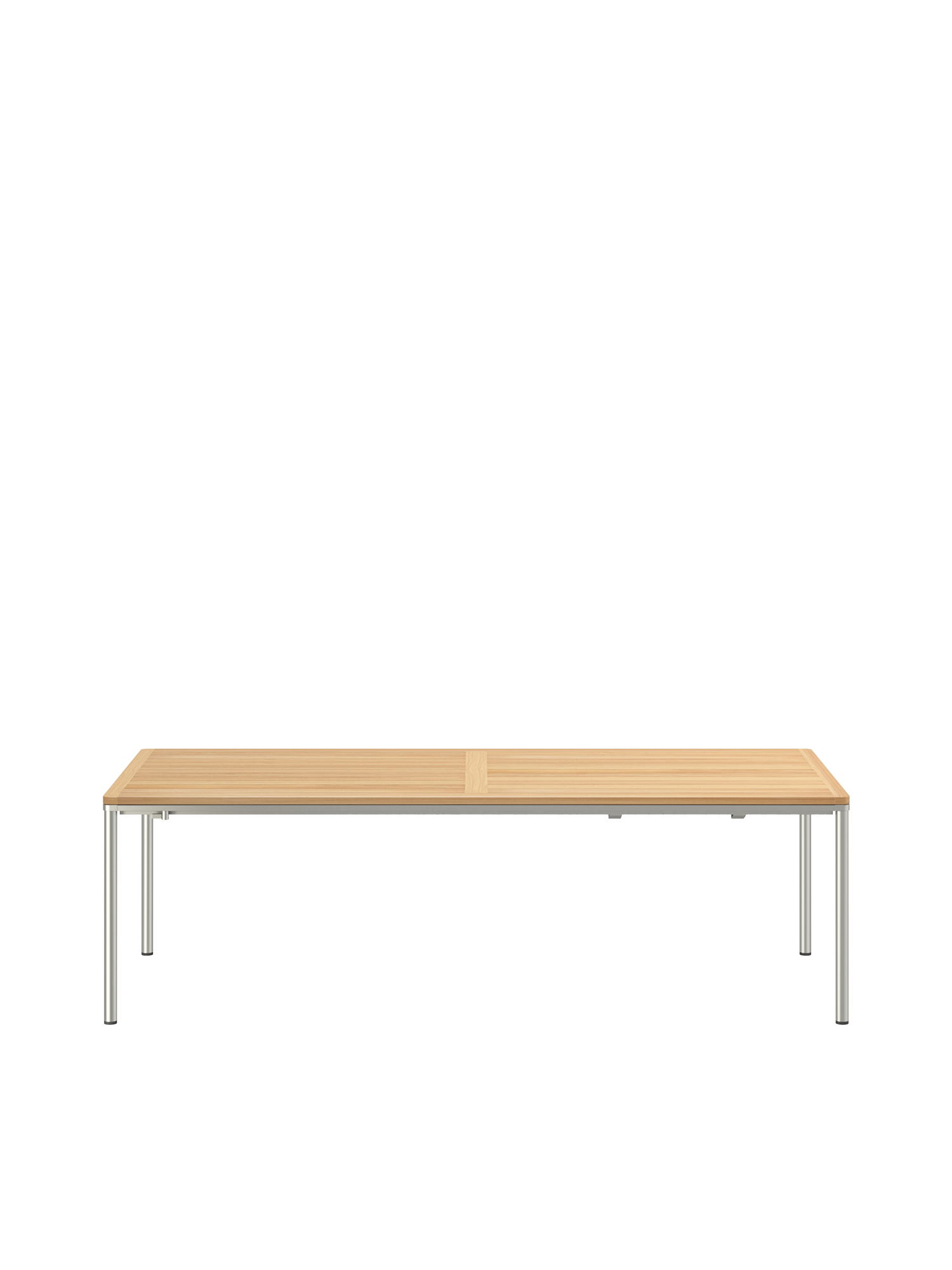 The table tops of the extending versions can be slid out as a whole and elegantly lengthened. The additional section of the middle and large-sized tables is mounted under the table top, the extending section of the small table is stored in a separate bag. The extended top can be centered, or if more leg room is required, positioned to one side.