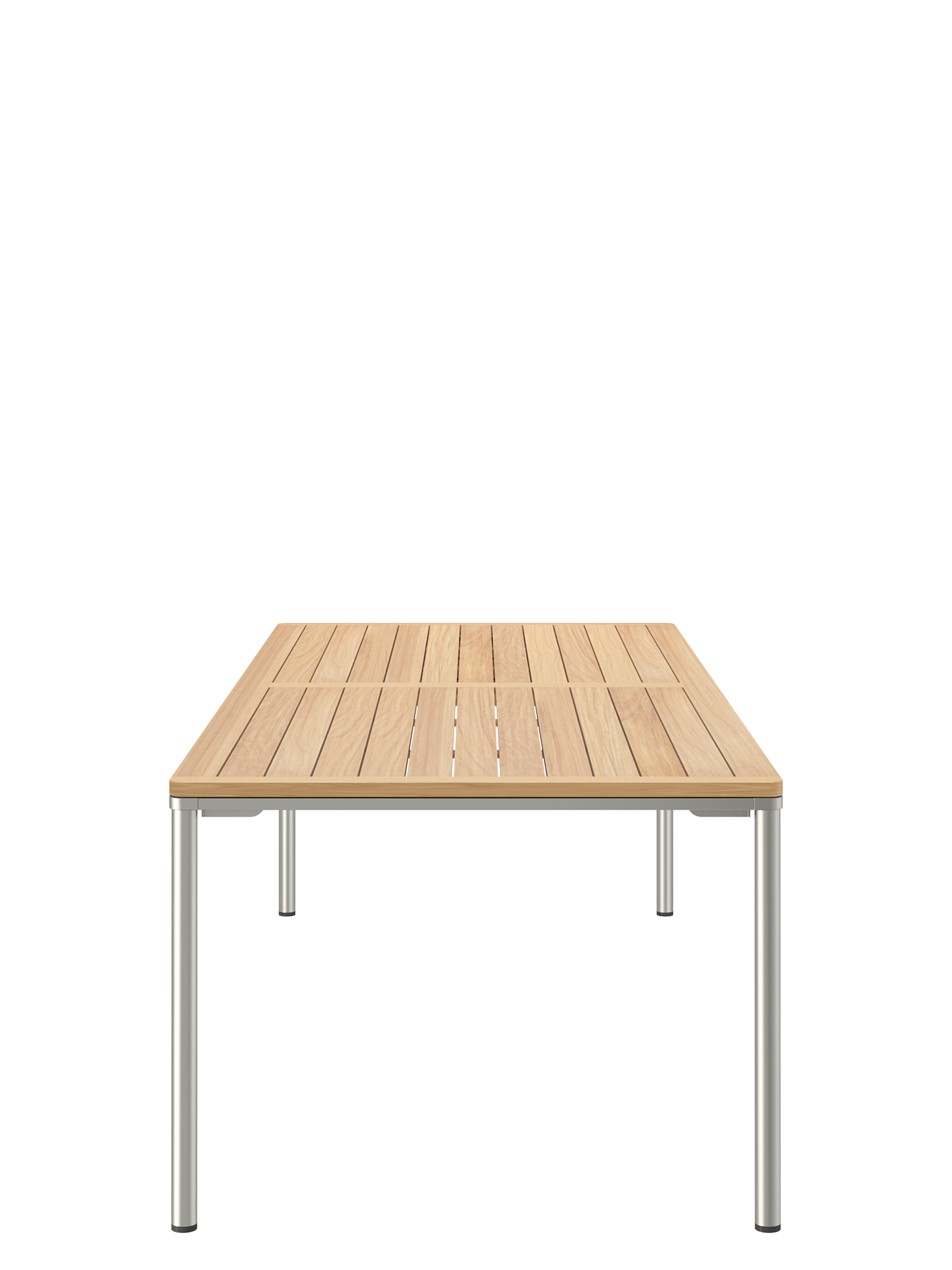 The stainless steel frame of the Portland tables combines this with all chairs made of the same material. Four slender legs bear a table top that appears to be cast from the same piece of stainless steel as the frame underneath and that curves at the corners to echo the rounding of the legs. The table top is made of teak and lends the table a natural warmth.
