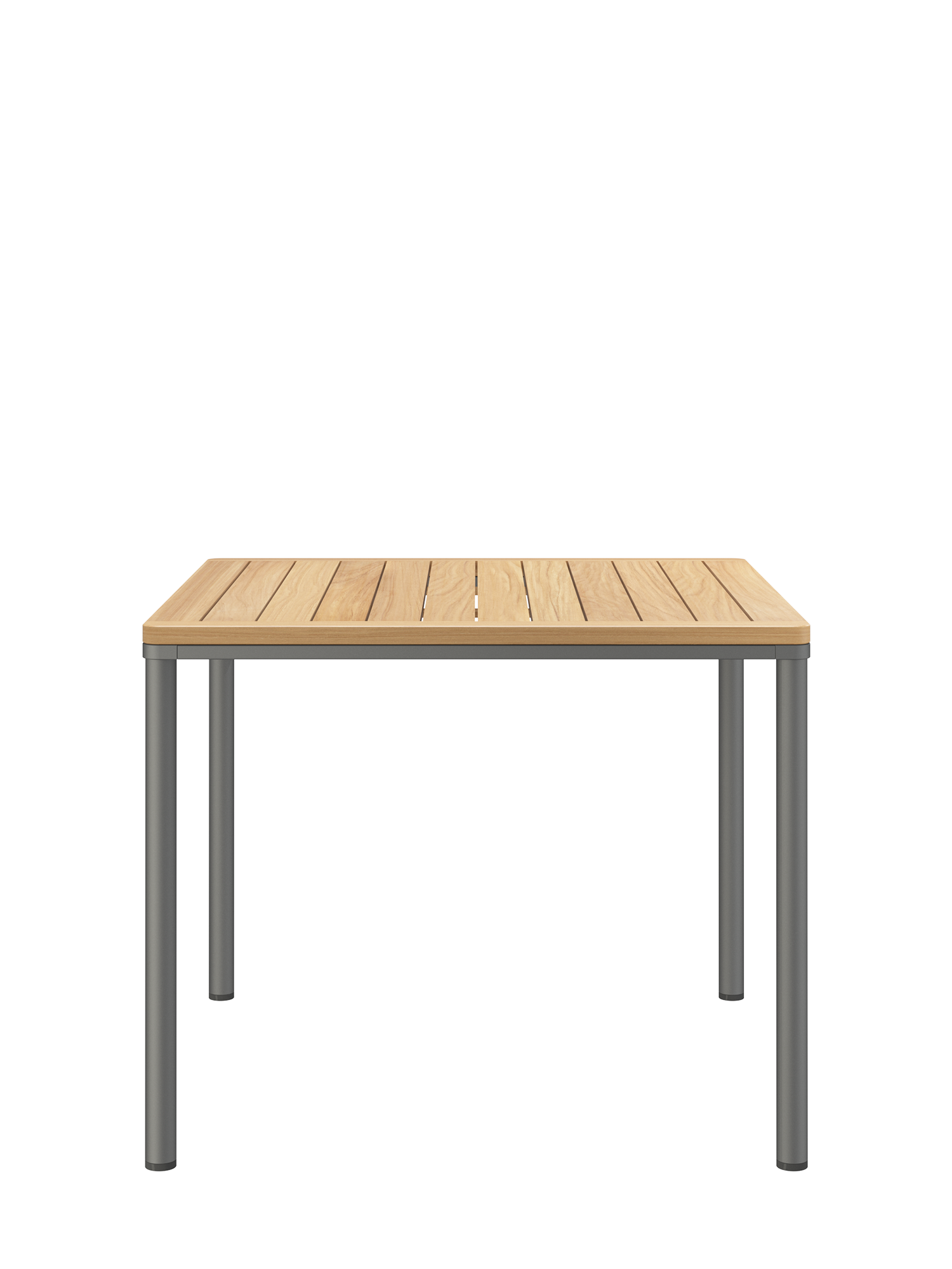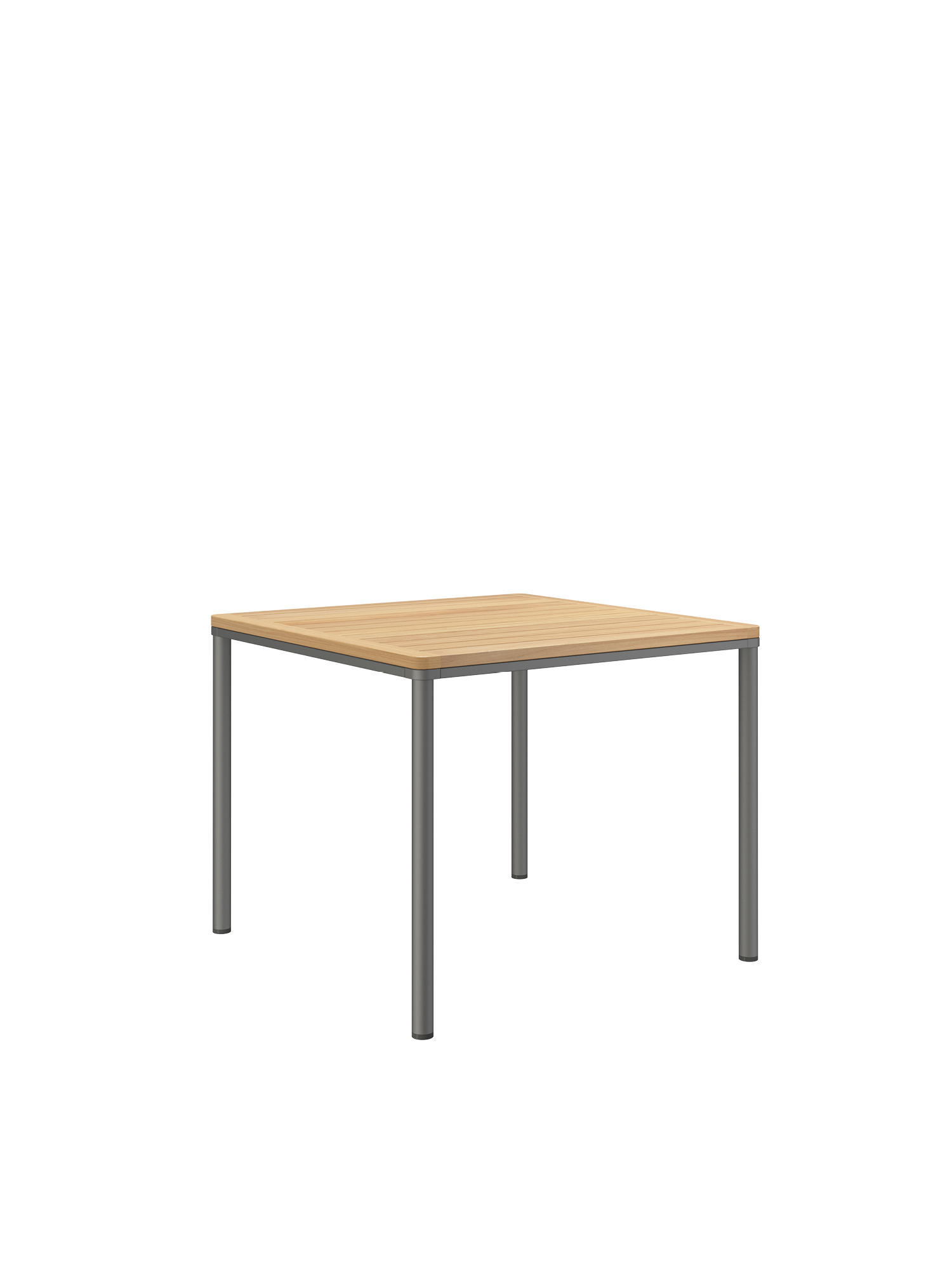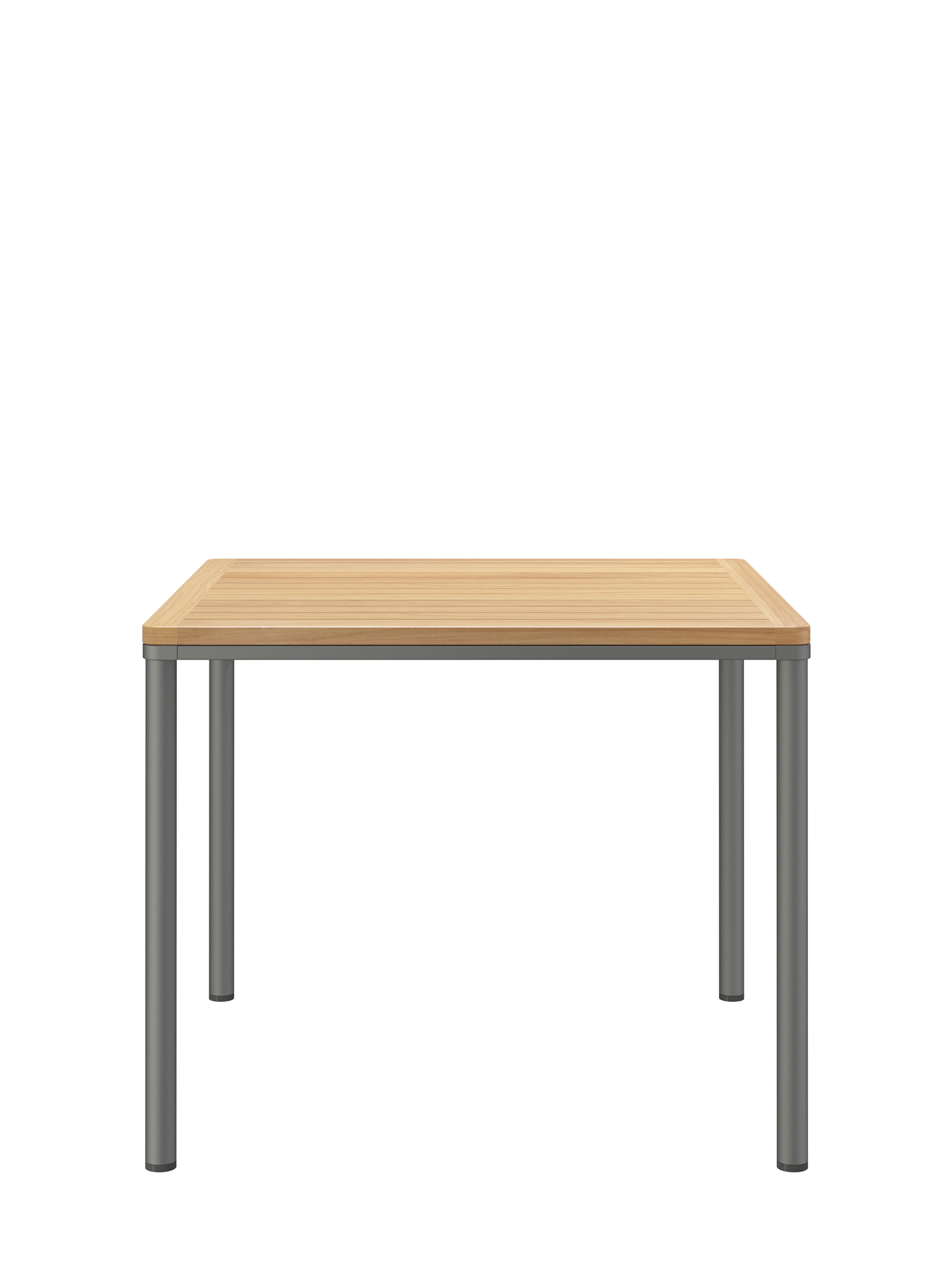 The powder-coated stainless steel frames of the Portland tables allow them to be combined with all chairs of the same material. Four slender legs carry a top with a frame that appears to be made of a single piece, and that follows the rounding of the legs in the corners. The surface is made of high-quality plantation teak.