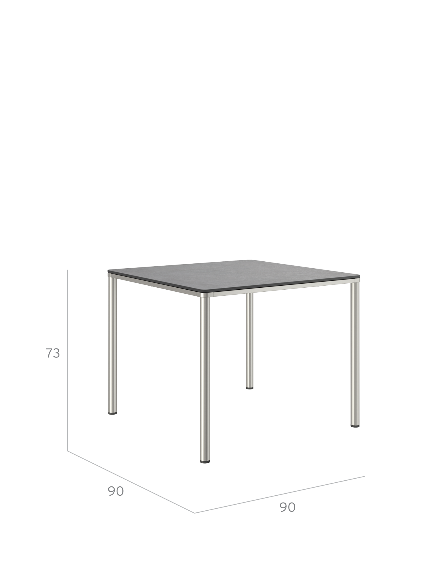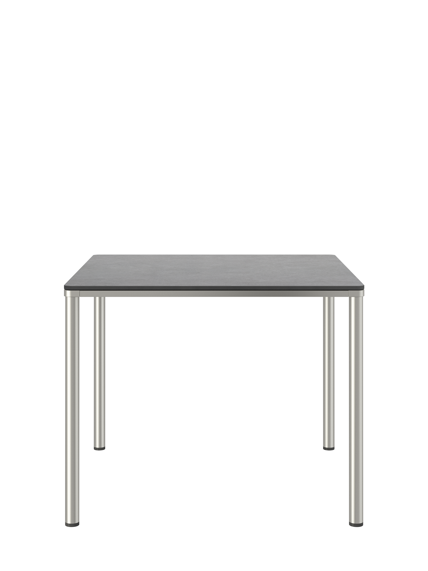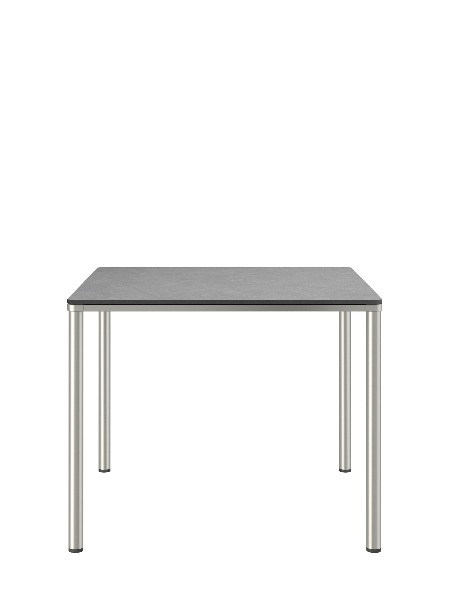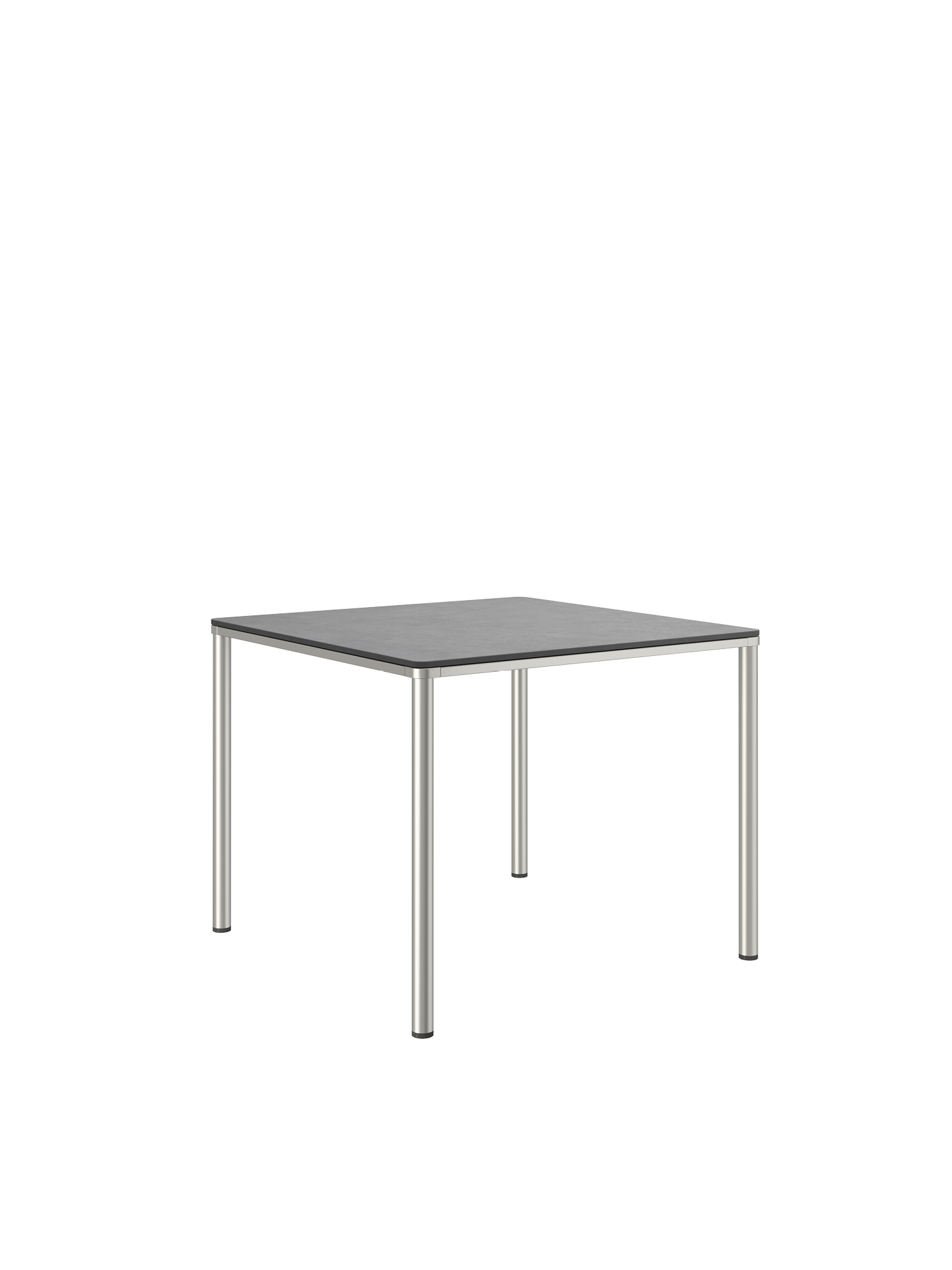 The stainless steel frames of the Portland tables allow them to be combined with all chairs of the same material. Four slender legs carry a top with a frame that appears to be made of a single piece, and that follows the rounding of the legs in the corners. The surface is made of high-quality synthetic resin.