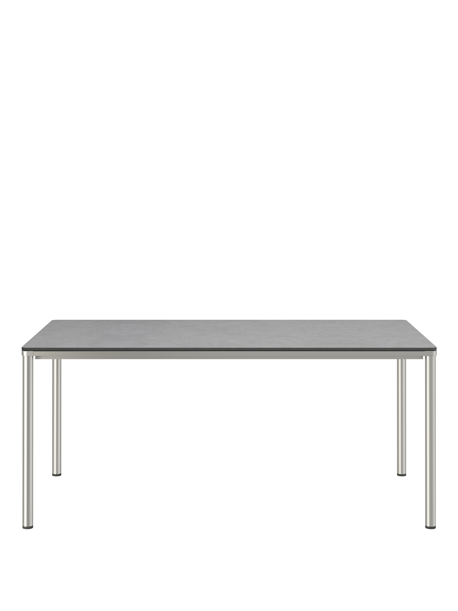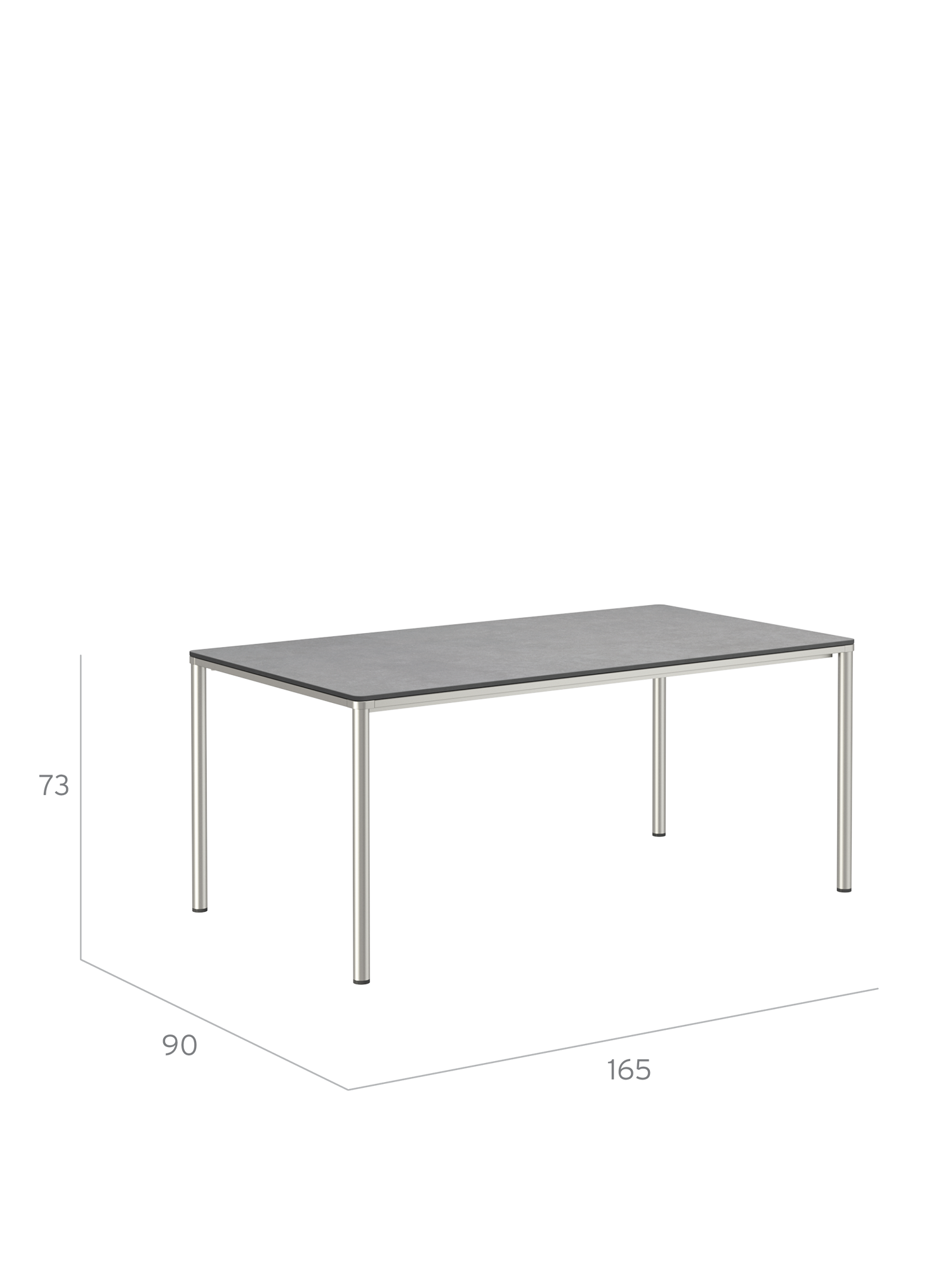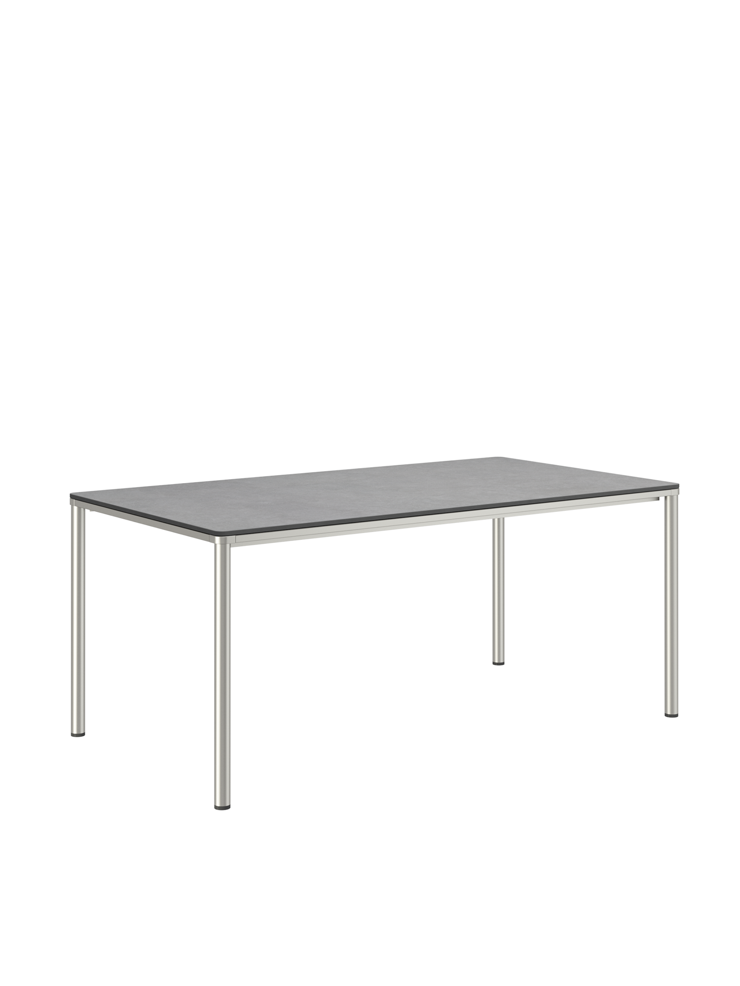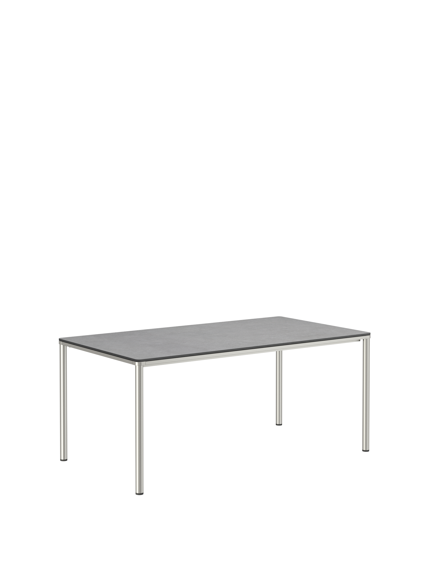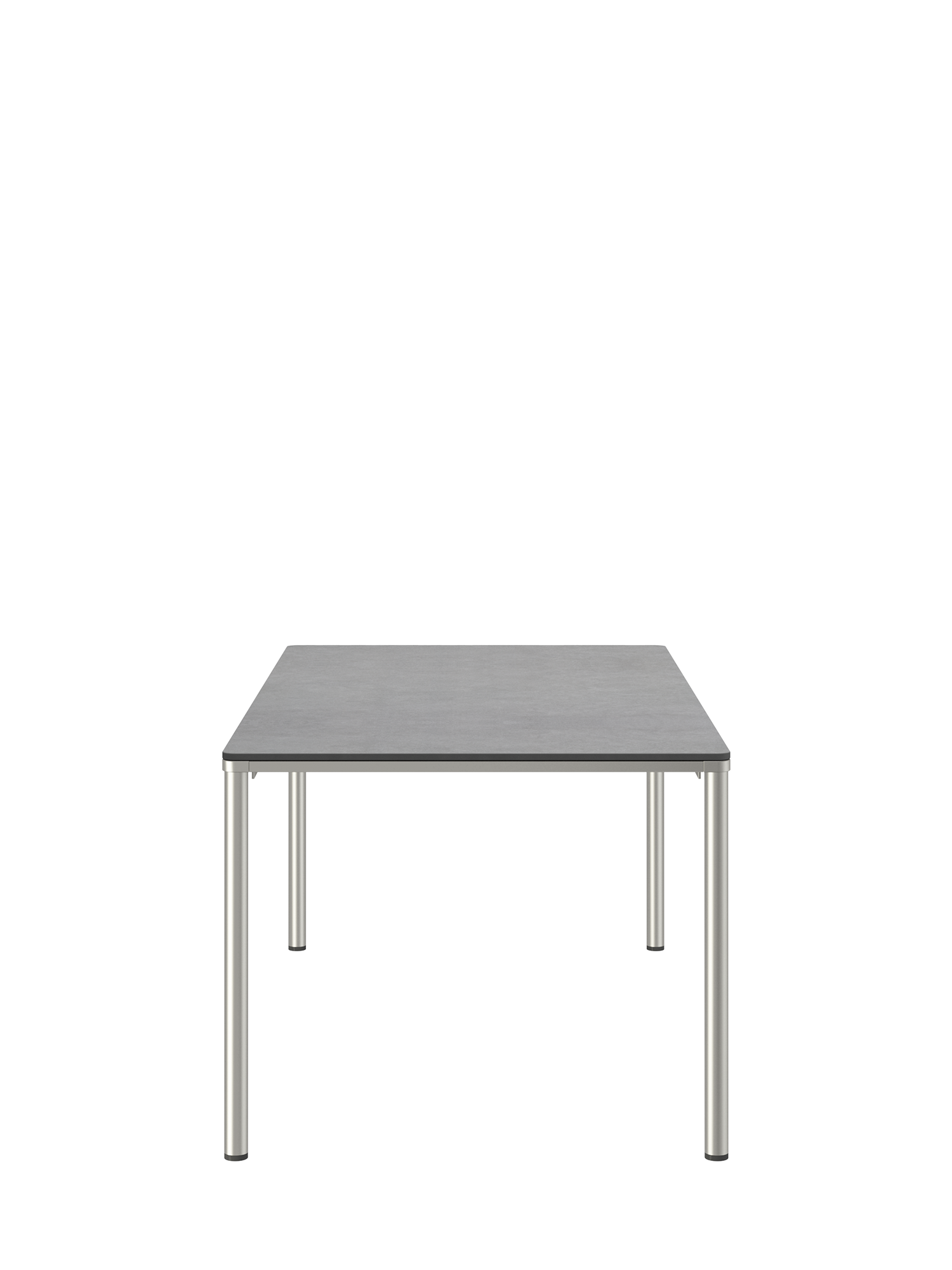 The satinised steel frames of the Portland tables allow them to be combined with all chairs of the same material. Four slender legs carry a top with a frame that appears to be made of a single piece, and that follows the rounding of the legs in the corners. The surface is made of high-quality synthetic resin.